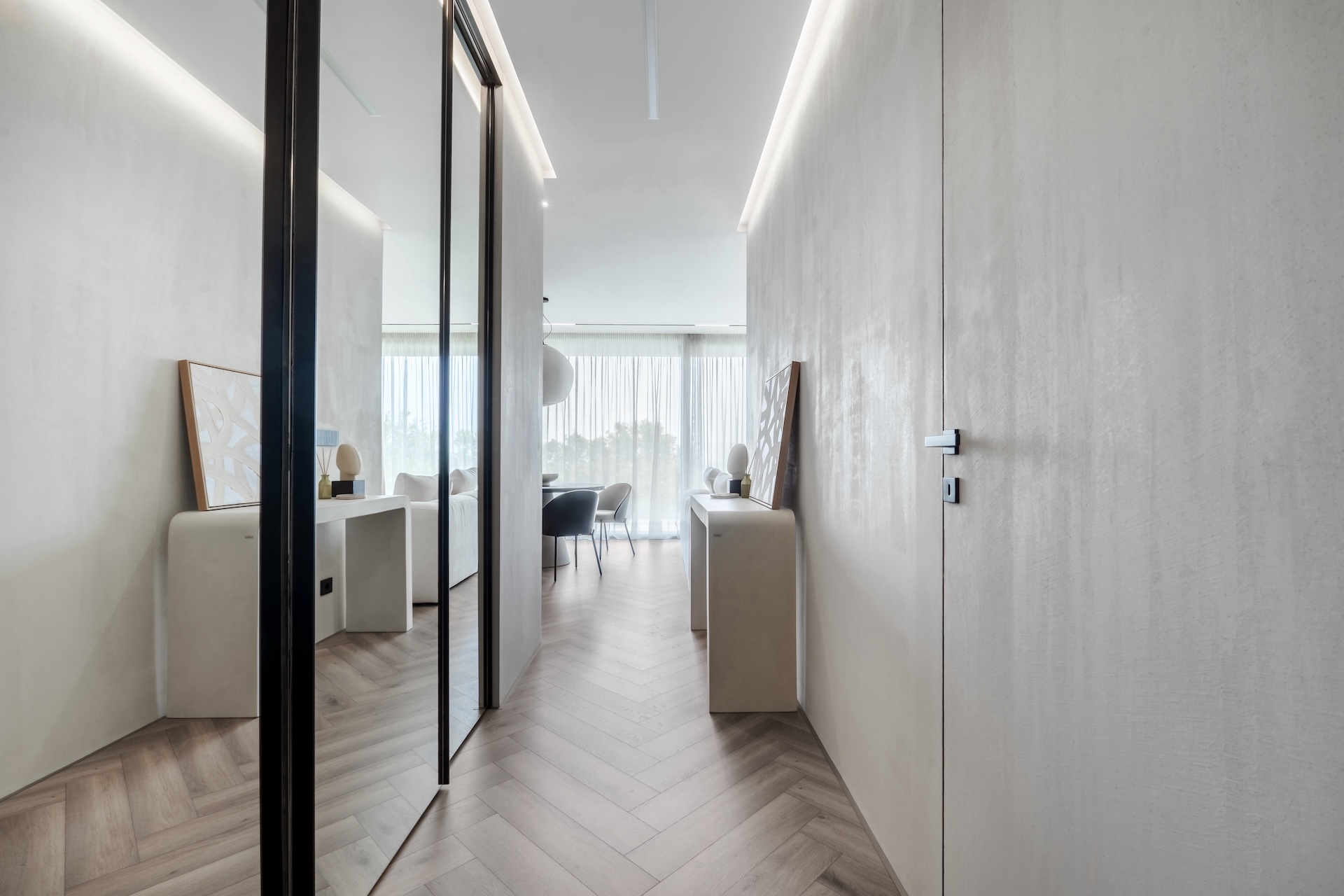 Този реализиран интериорен проект е ода на светлината, текстурата и сдържаната елегантност. Минималистичен по форма, но изключително изразителен по усещане, домът съчетава чисти линии с естествени материали и фина монохромна палитра.