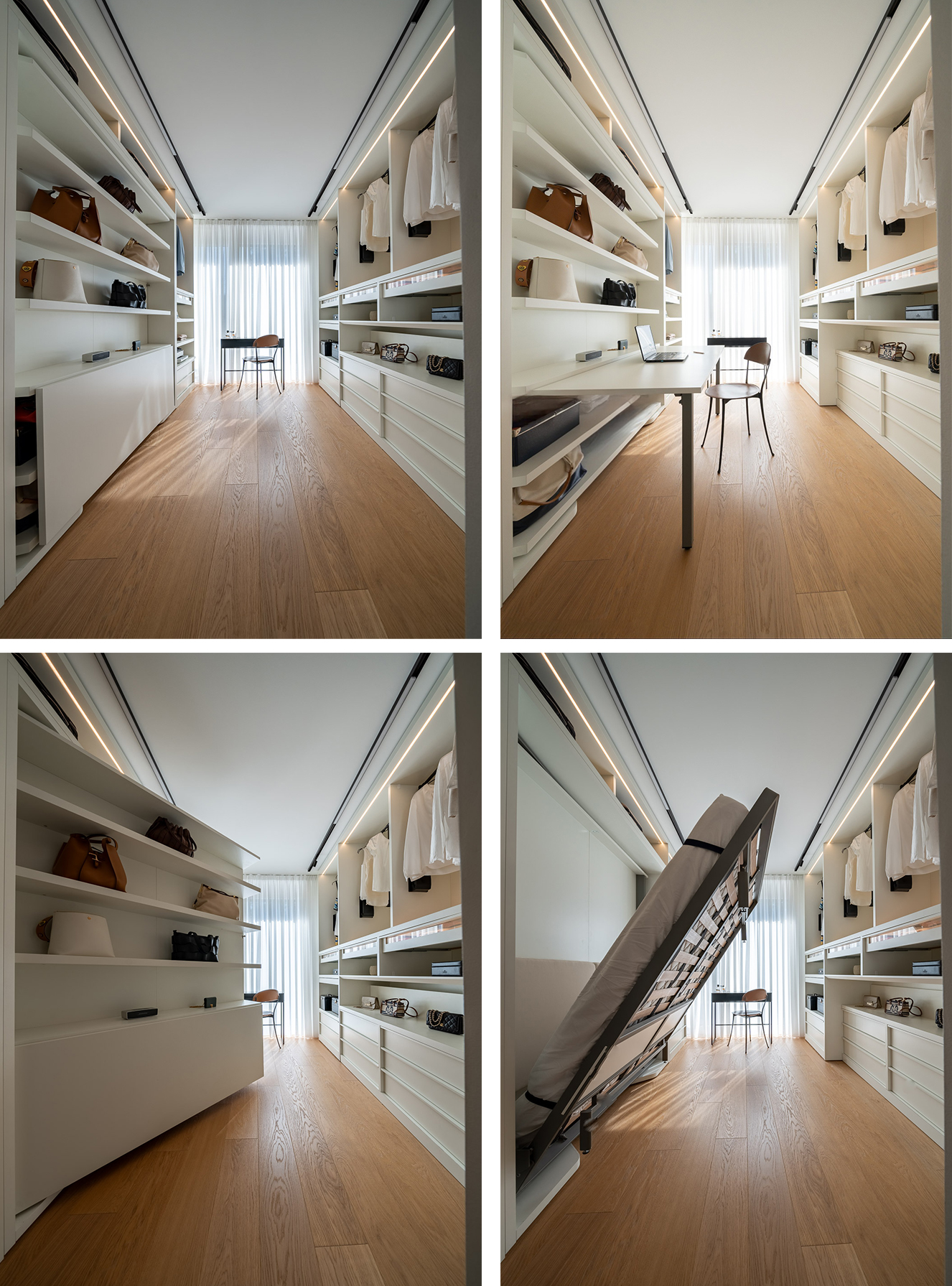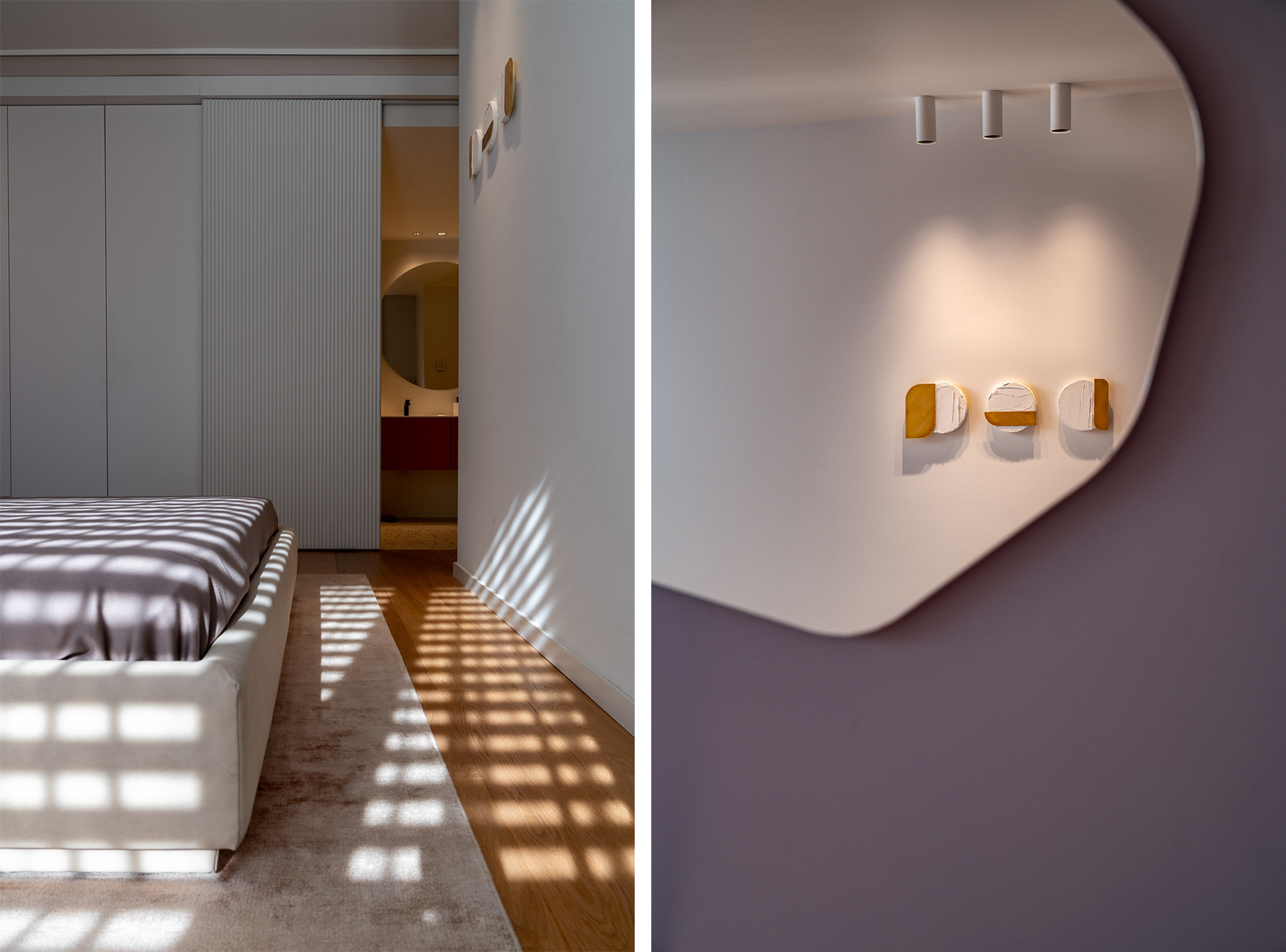 Централна роля в пространствения разказ заемат скулптурните плъзгащи врати, които отделят дневната зона от зоната за почивка и сън. Те не функционират като обикновена преграда, а като архитектурен жест с артистично присъствие. Изцяло разработени и проектирани от студиото, тези врати ненатрапчиво, но категорично заявяват индивидуалност и добавят характер на интериора, без да нарушават неговата тишина и цялост.