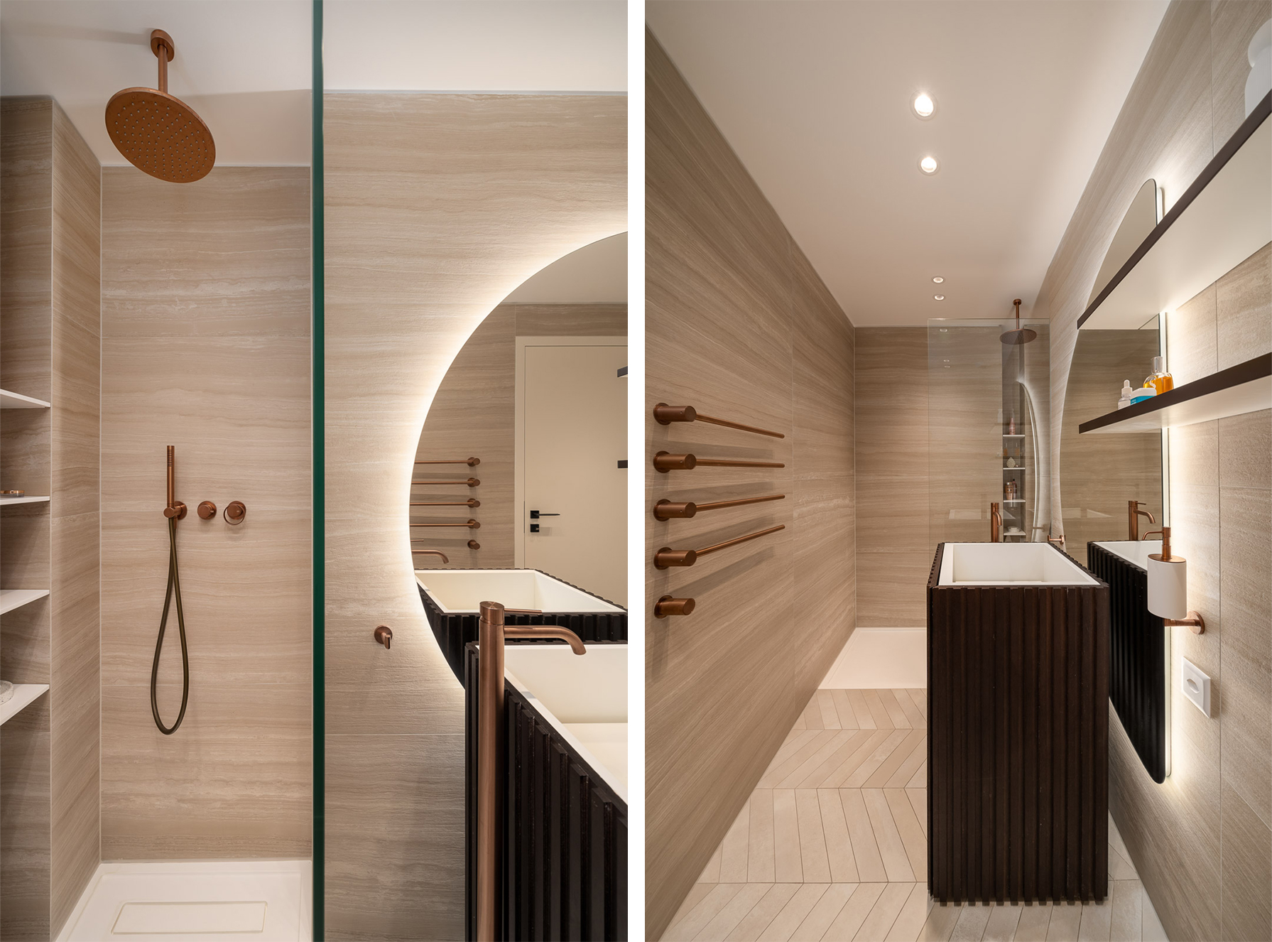 A central element in the spatial narrative is formed by the sculptural sliding doors that separate the living area from the private zone for rest and sleep. Rather than acting as a mere partition, they function as an architectural gesture with artistic presence. Fully developed and designed by the studio, these doors subtly yet decisively express individuality, adding character to the interior without disturbing its calm and cohesion.