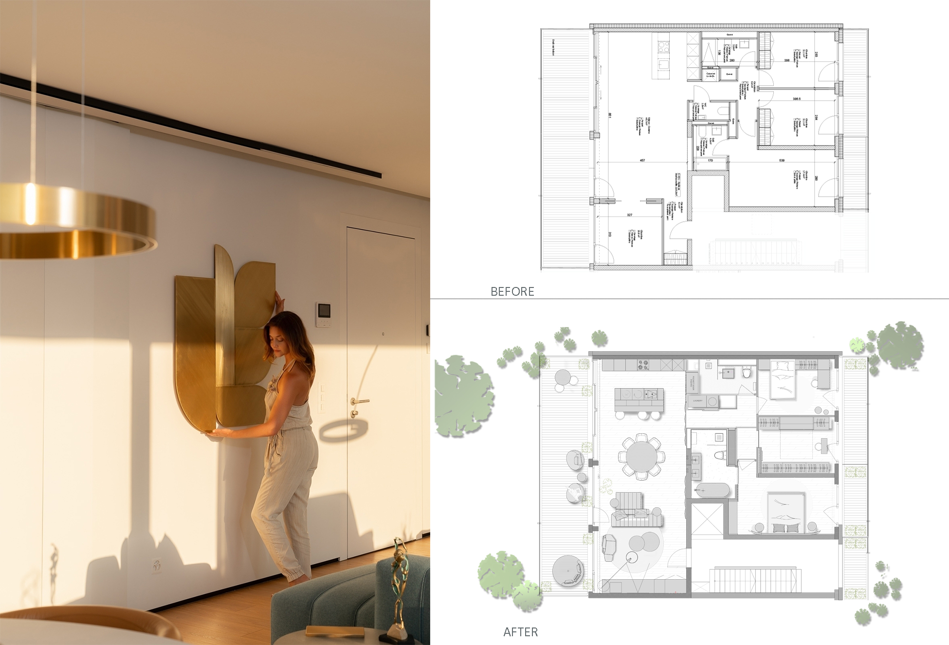 Within this context, the custom brass art sculptures—created by Elena Georgieva, the author of the project—are not decorative accents but a natural extension of the architecture itself. They exist as material poetry, capturing and reflecting light, changing with it, and remaining present as both tactile and visual memory. In dialogue with scale and rhythm, the sculptures connect art with habitation, transforming the home into a holistic, sensory experience rather than a mere setting.