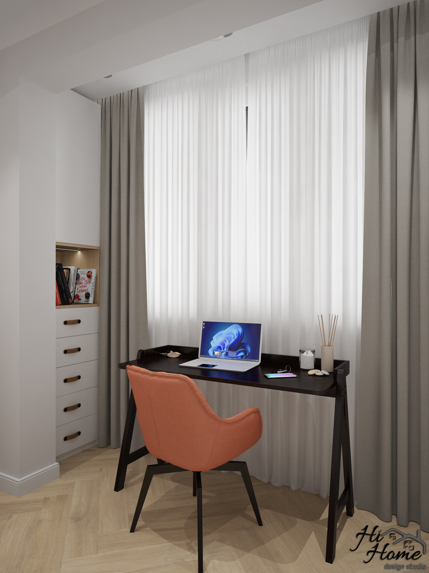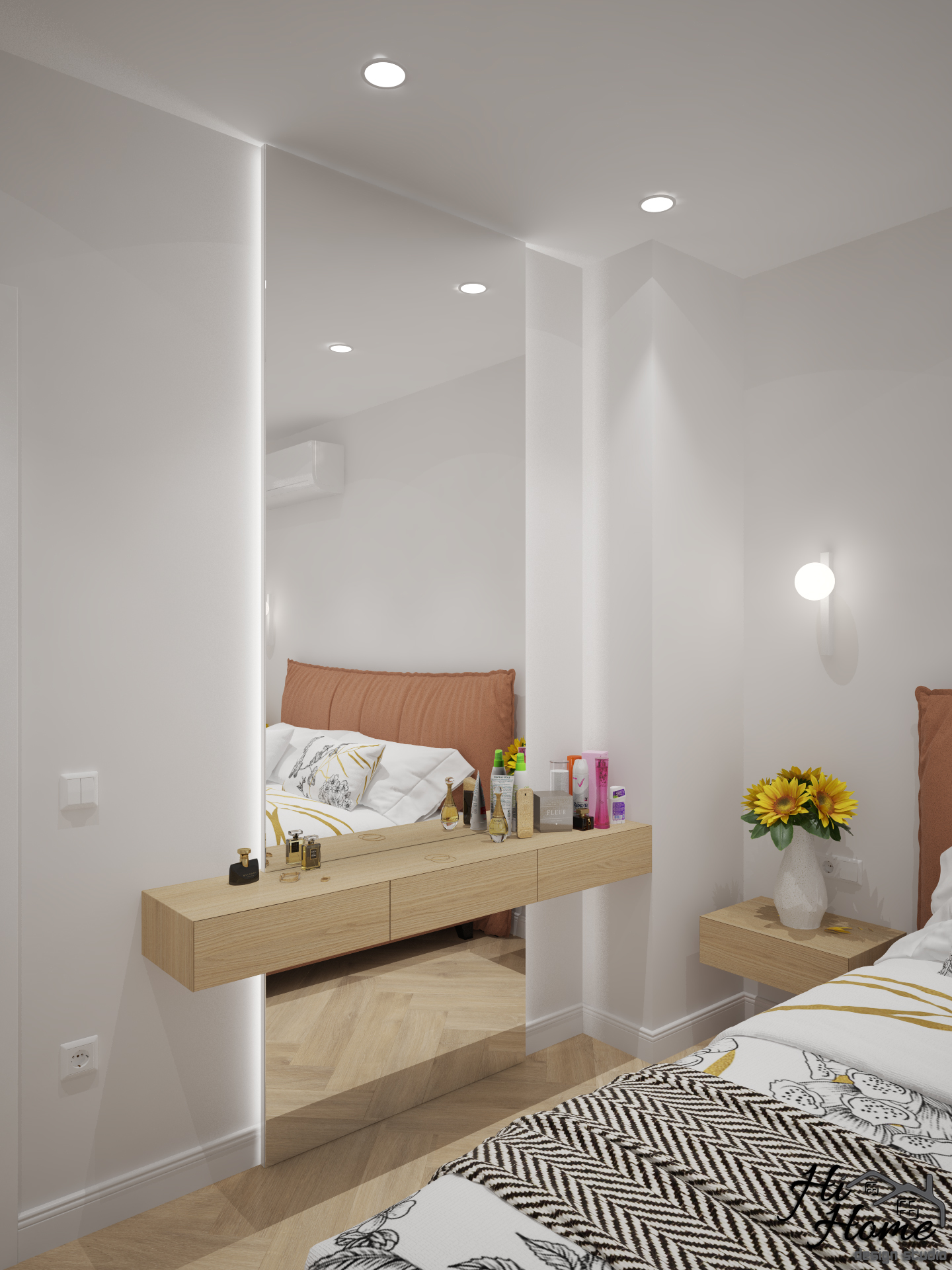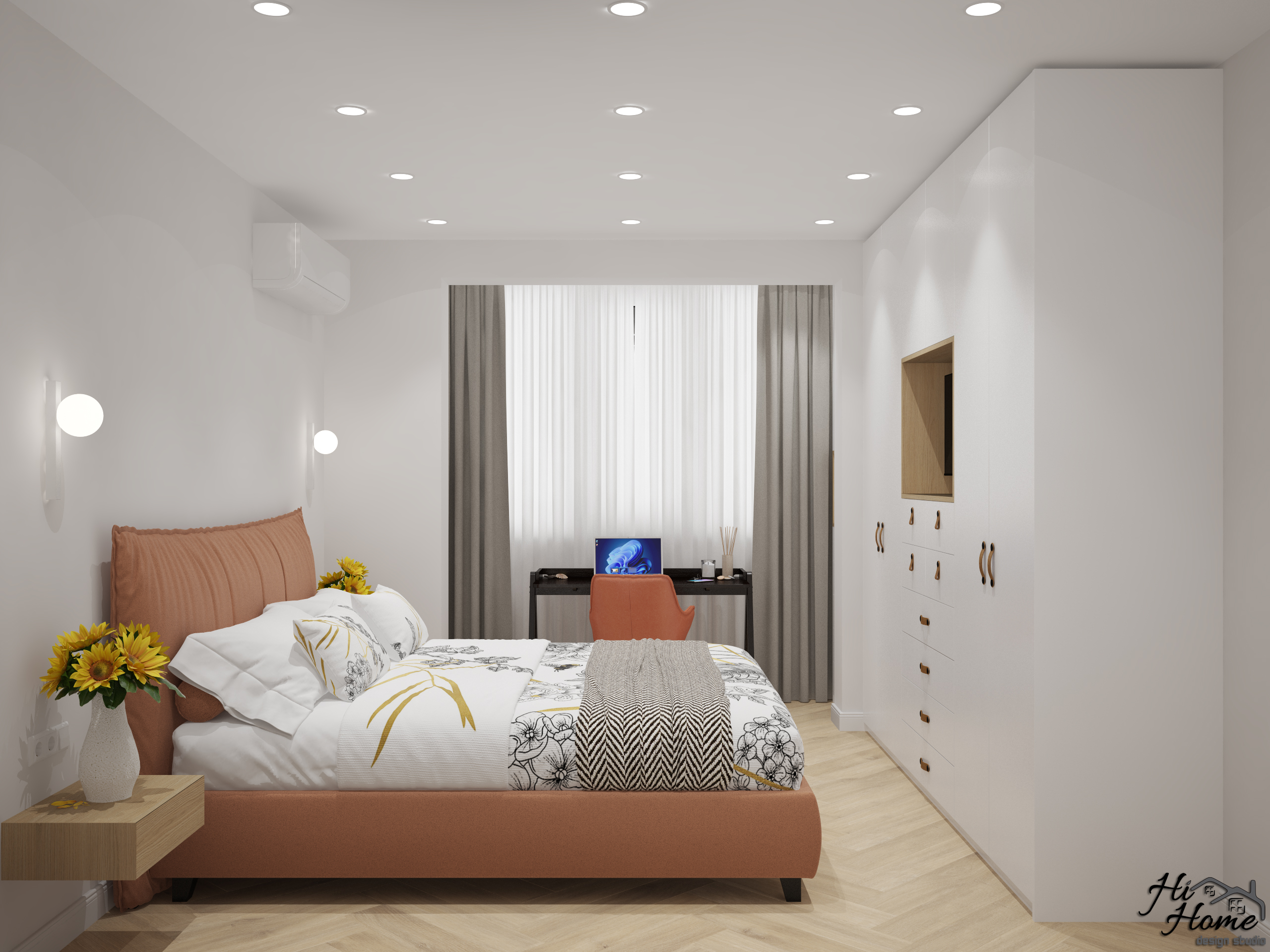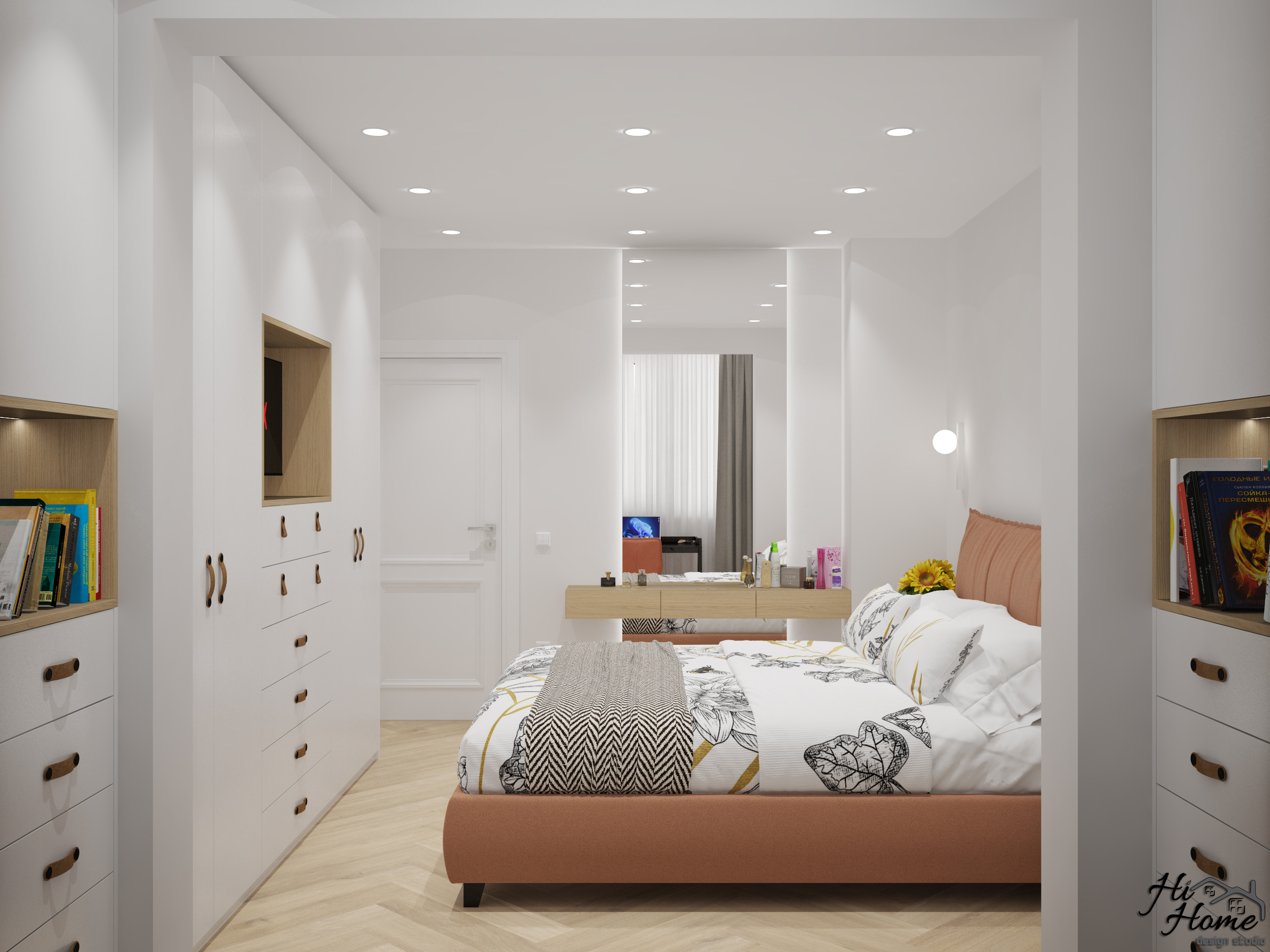 В квадратурата и сме добавили остъклена тераса, благодарение на която успяхме да отделим офис пространство за нашите клиенти. Предвидено е място за телевизора в гардеробната композиция. Леглото е с повдигащ механизъм, а тоалетката е съчетана с голямо огледало, което е плюс за всяка дама.