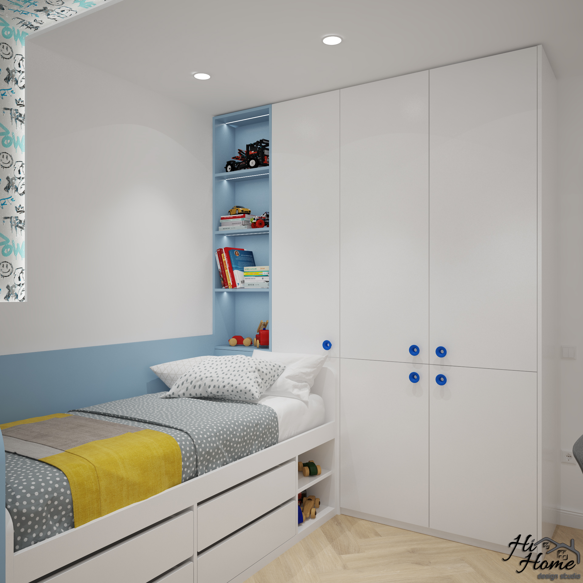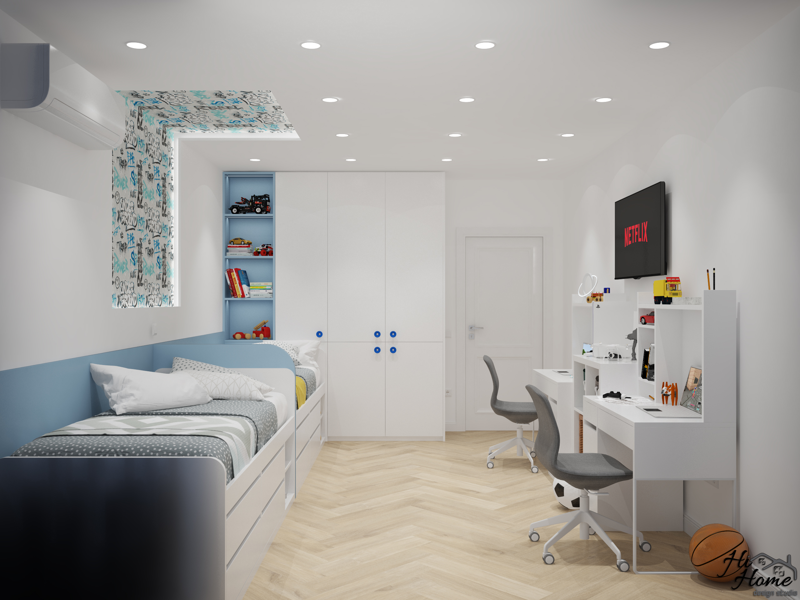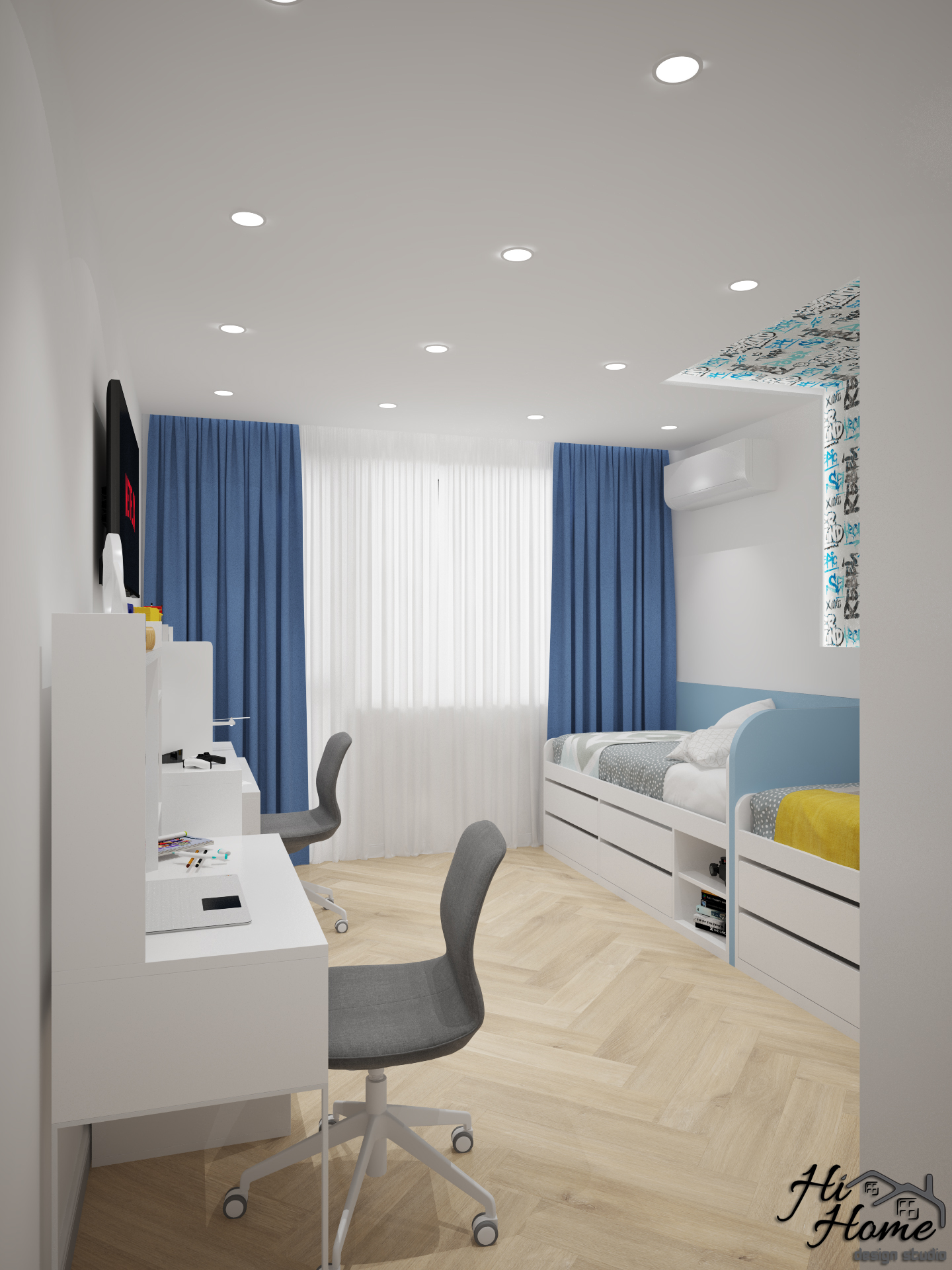 Тя е предназначена за две момчета. Отделили сме им зона за учене, както и пространство за игра. Леглата осигуряват допълнително място за съхранение.