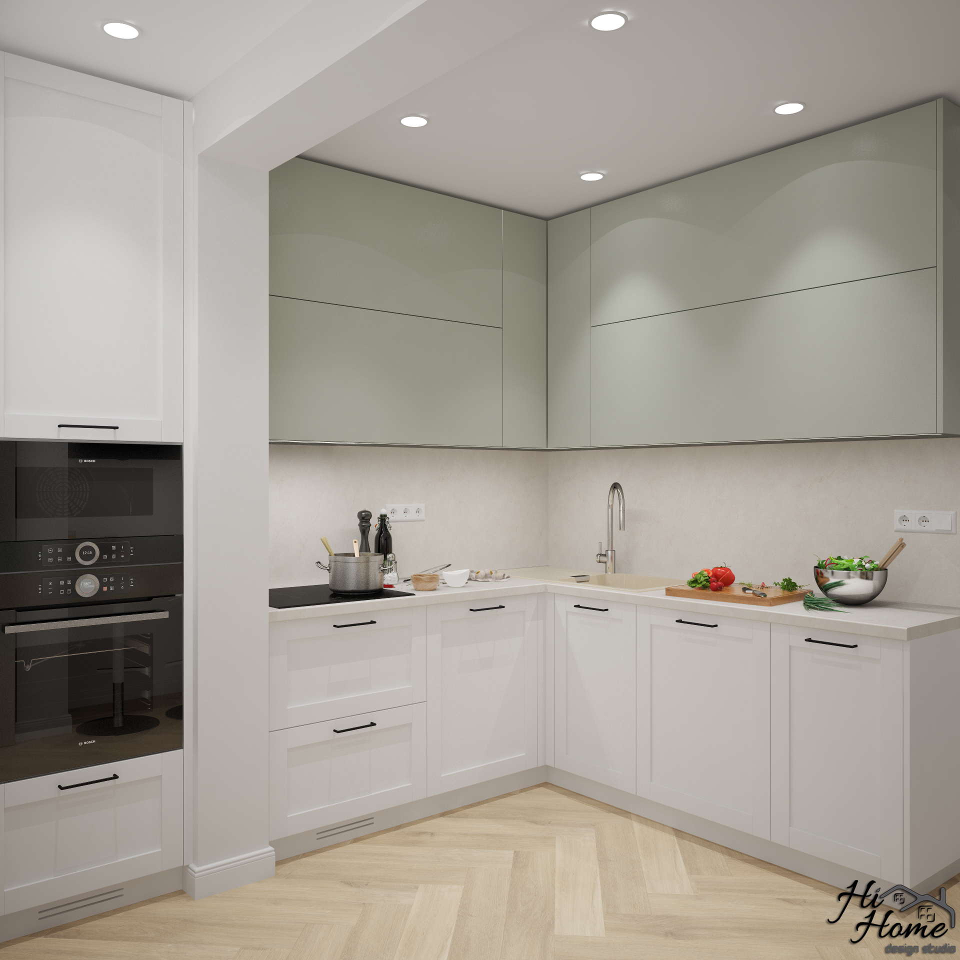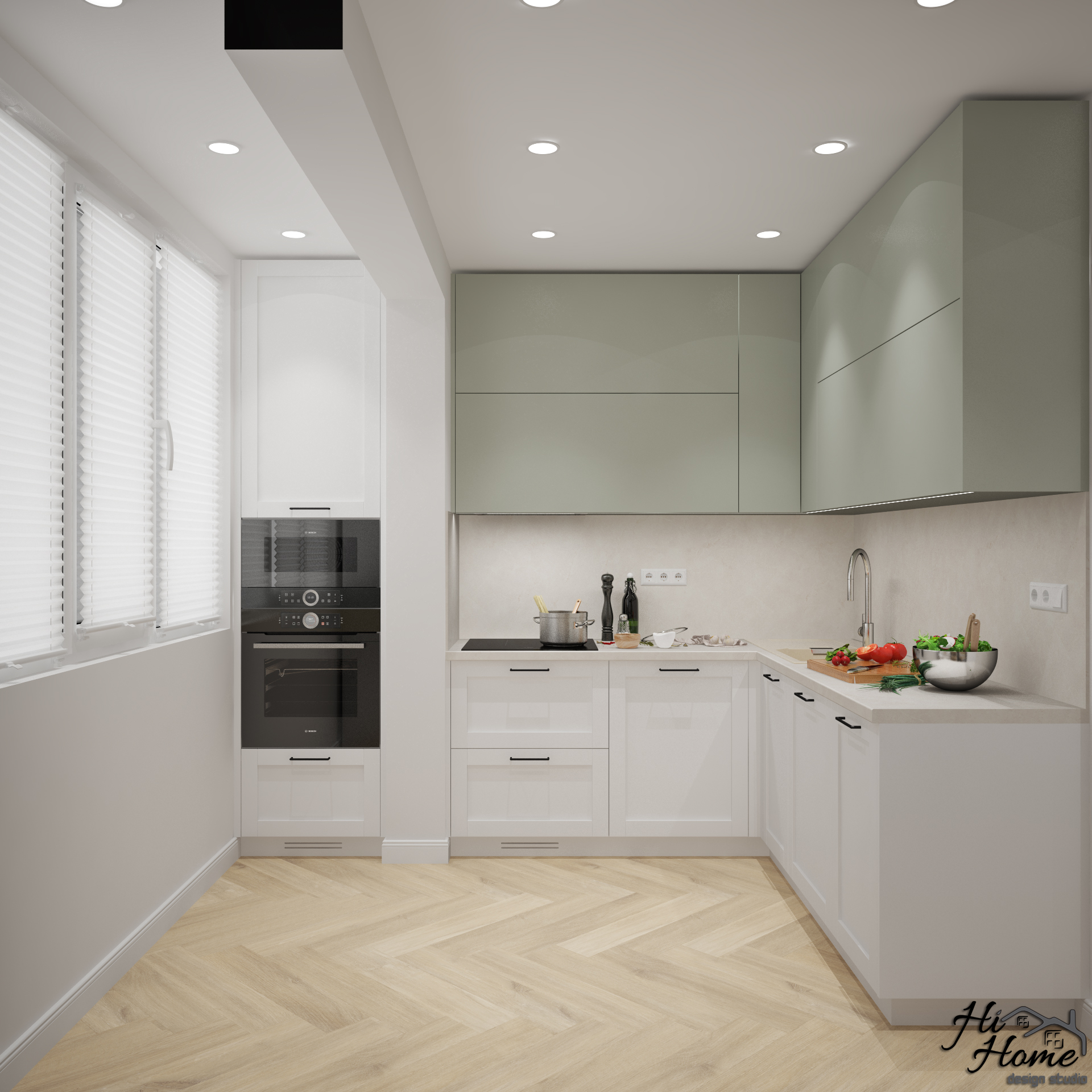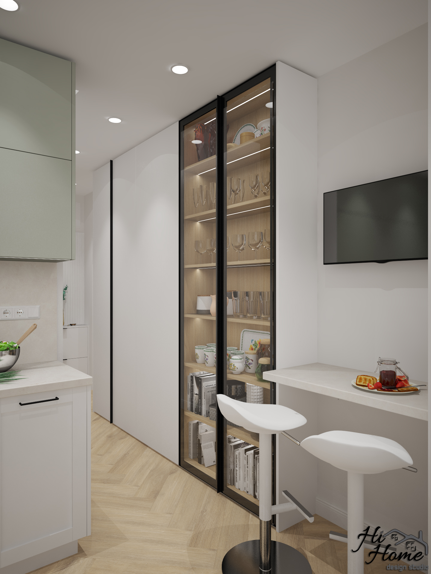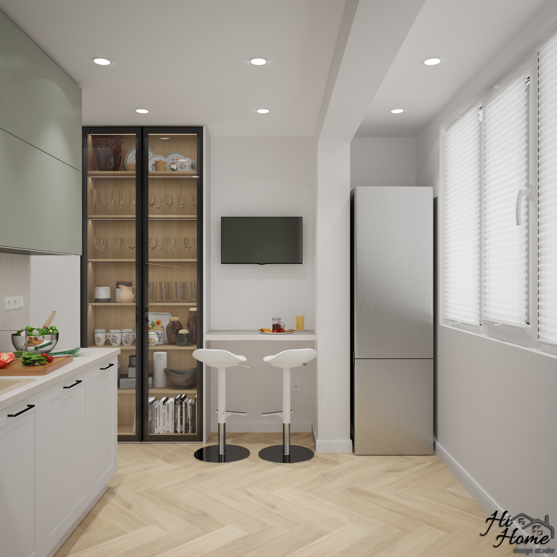 В квадратурата и сме добавили остъклена тераса и част от коридора, с които да увеличим функционалната площ на помещението и да вместим всички елементи, които клиентите ни желаят. В коридора направихме голям шкаф, в който да разположим бойлера. По този начин увеличихме мястото за съхранение и обединихме кухнята с дневната. Получи се отворен план, в който обособихме и място за хапване "набързо" отделно от трапезарията.