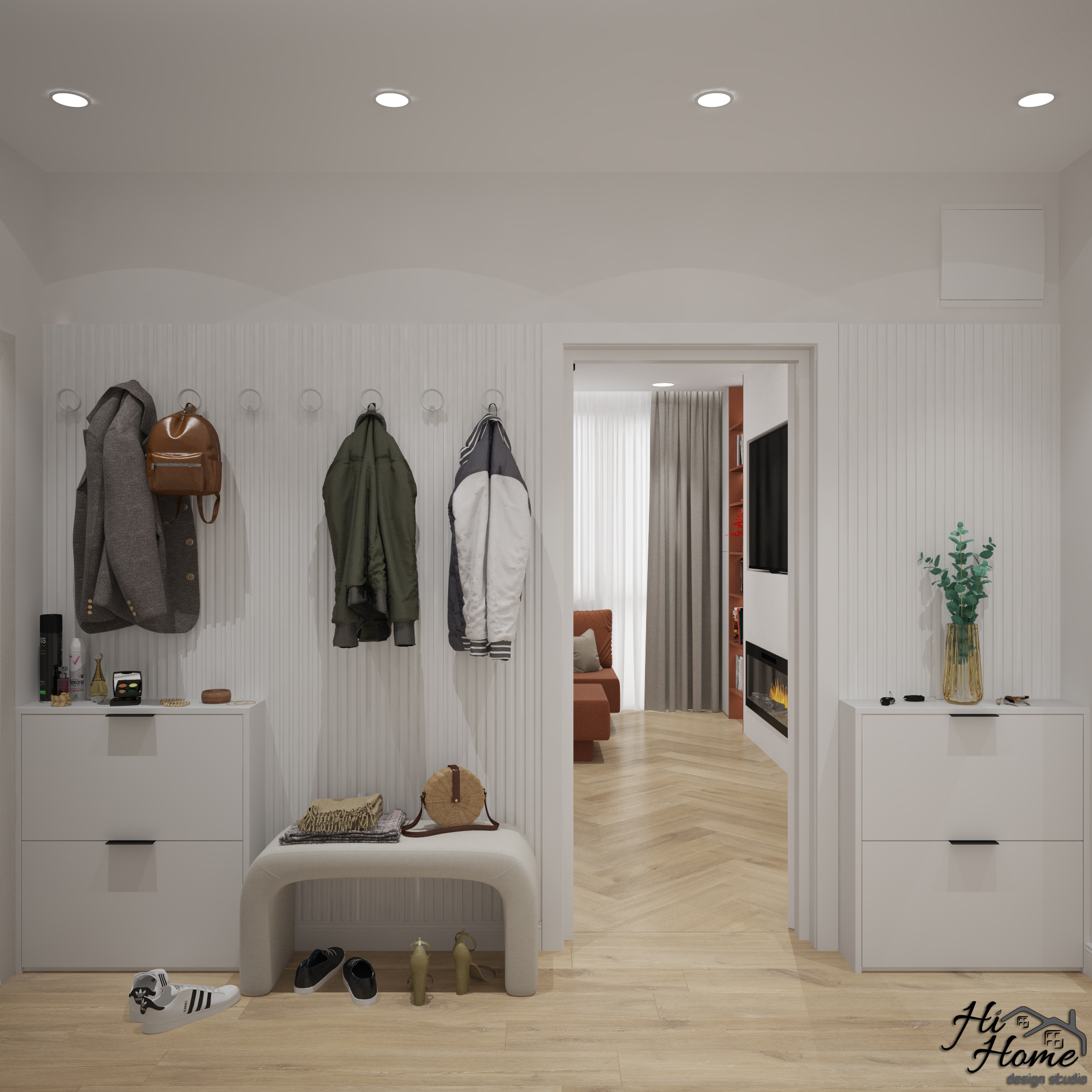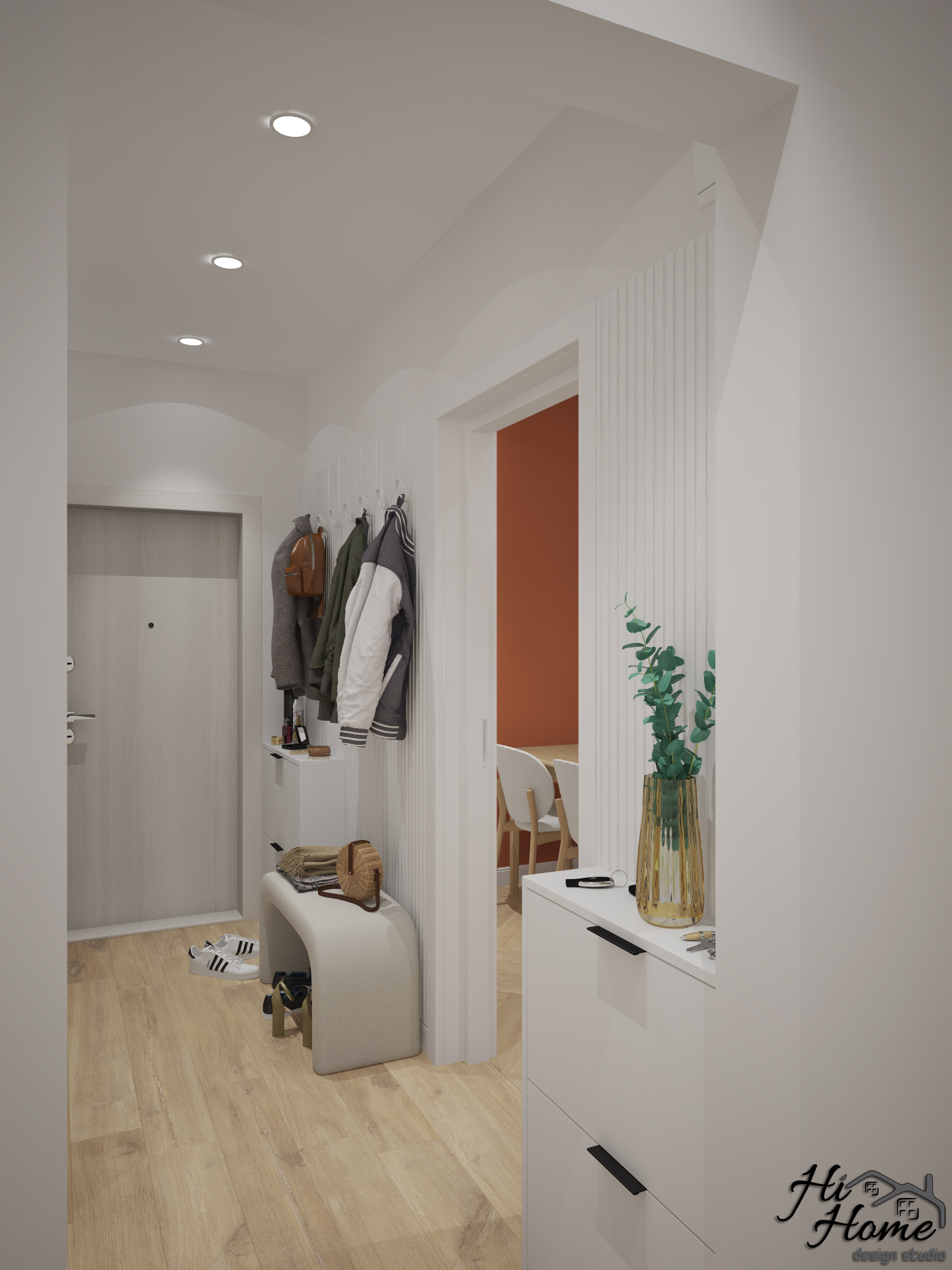 Той е в светли цветове. За да обединим иначе разделените кухня и всекидневна - премахнахме вратите. Предвидихме ламперия, на която да разположим закачалки и да вплетем релефни елементи в интериора. Допълнителните шкафове за обувки запазват визията подредена и изчистена.
