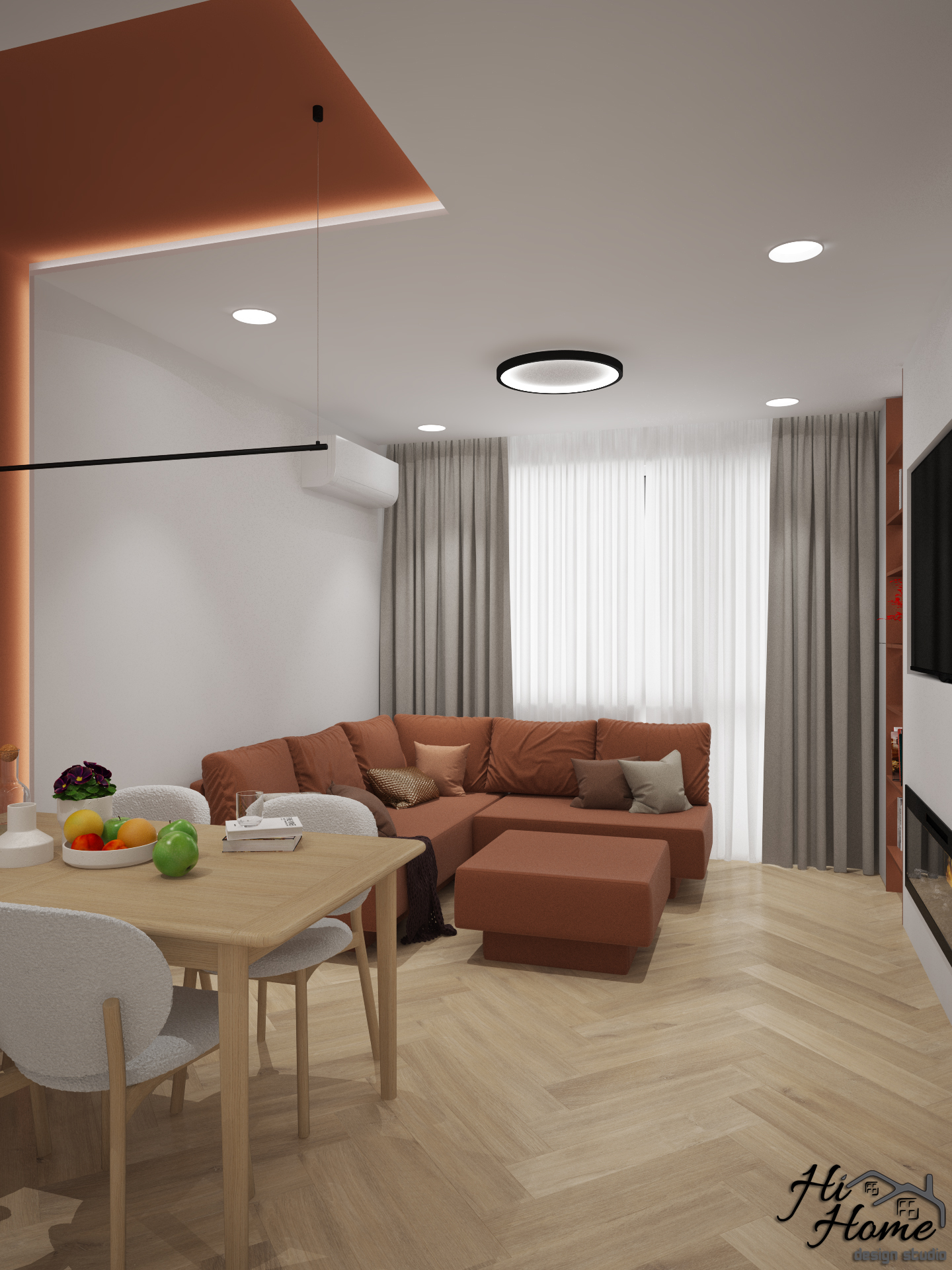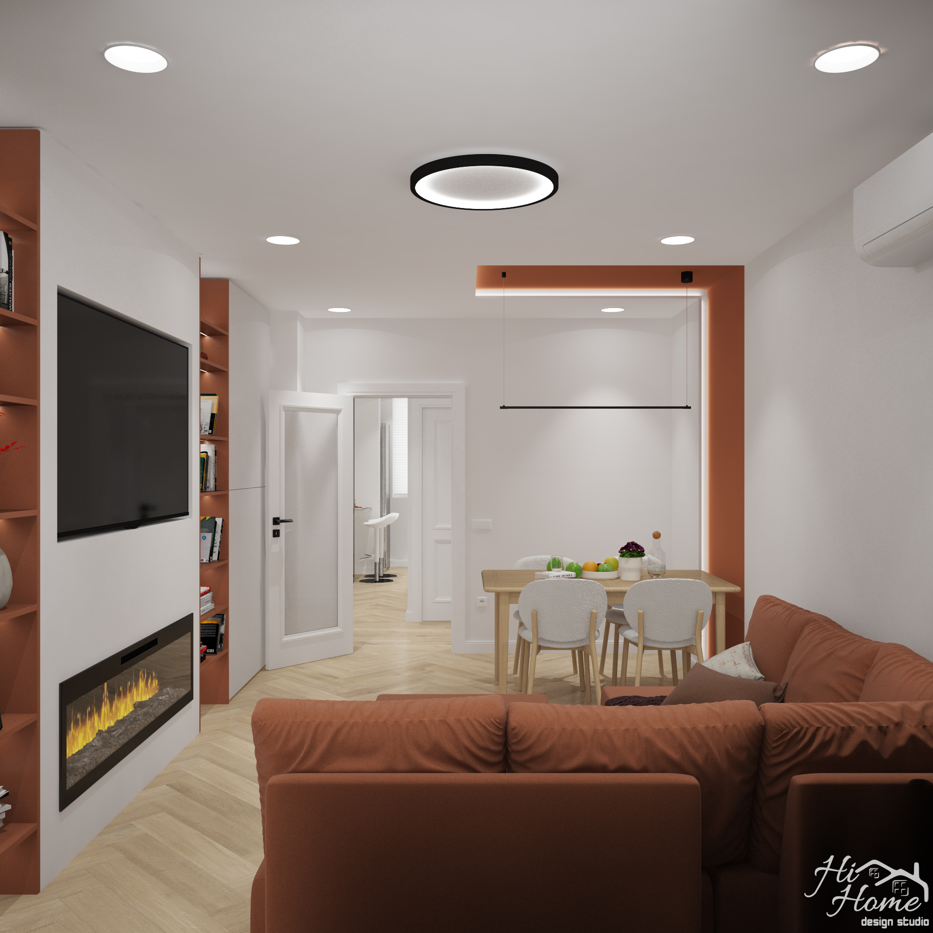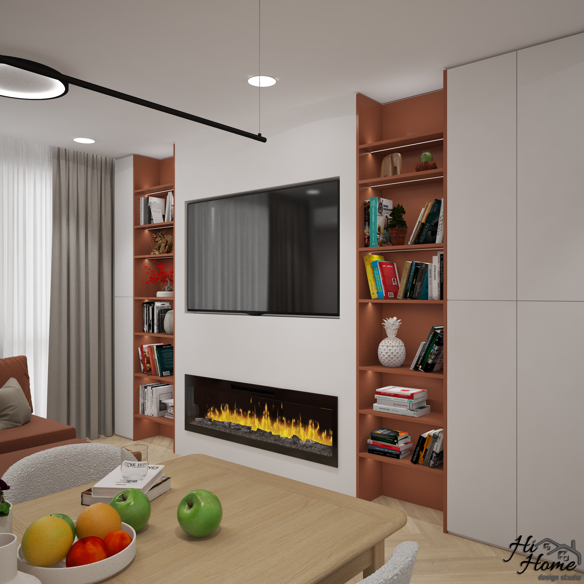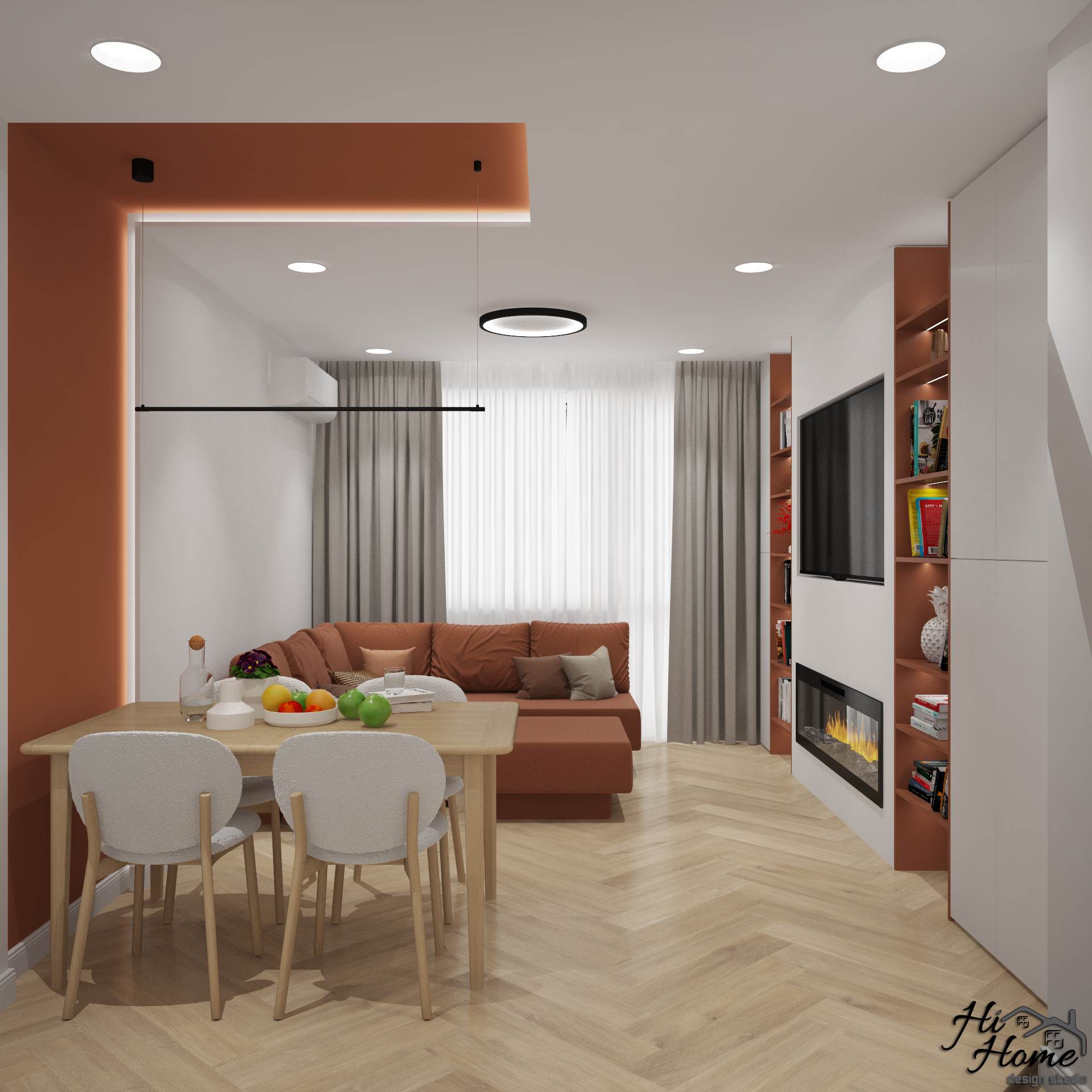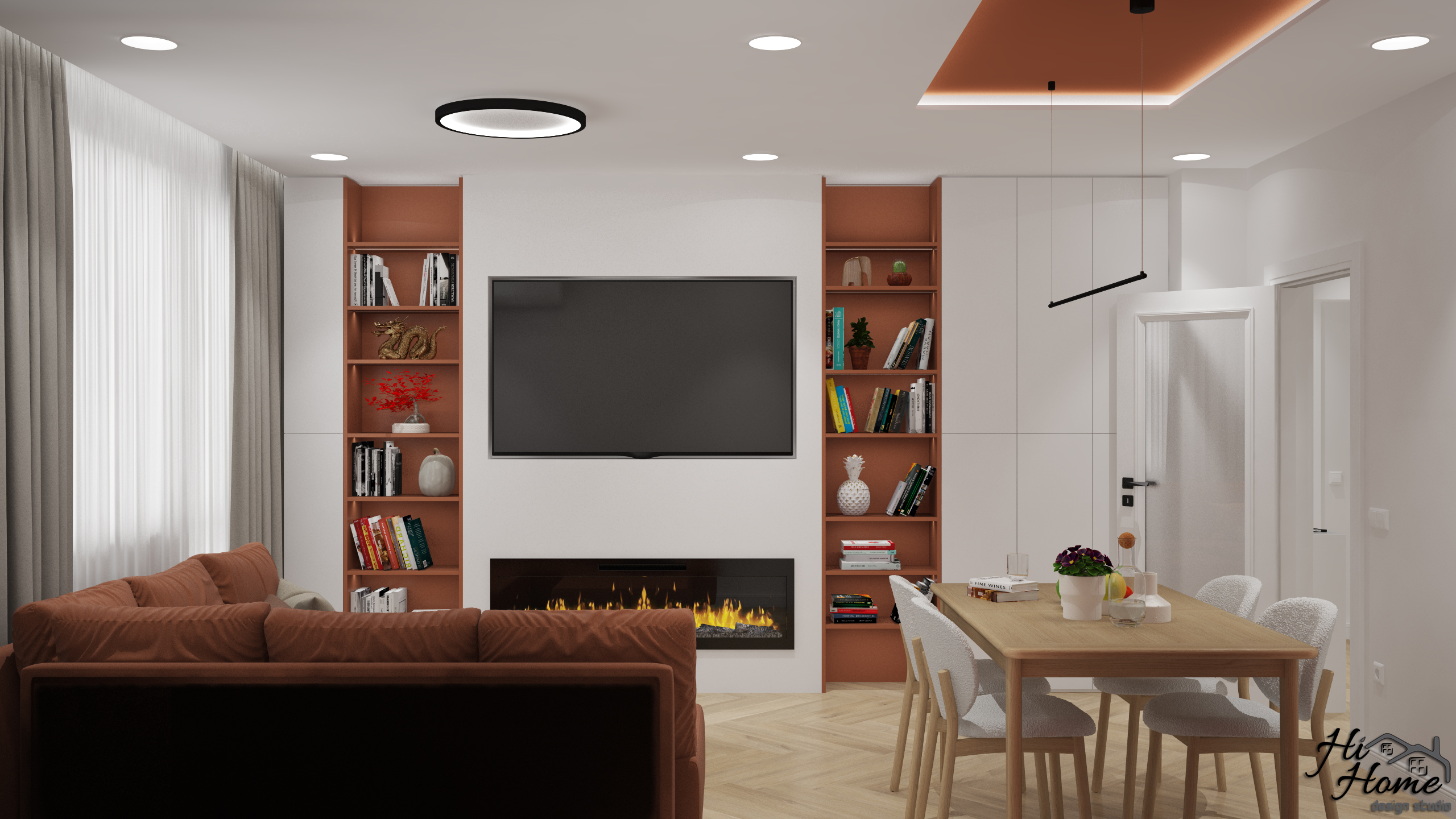 В нея сме обособили трапезария и зона за релакс. Тъй като сградата е по-стара, всекидневната е отделена от кухнята. За акцент сме добавили цвят в осветената ниша на трапезарията и на ТВ стената. По този начин разчупваме интериора и добавяме контраст. Електрическата камина допълва обстановката, създавайки уют и усещане за топлина и комфорт.