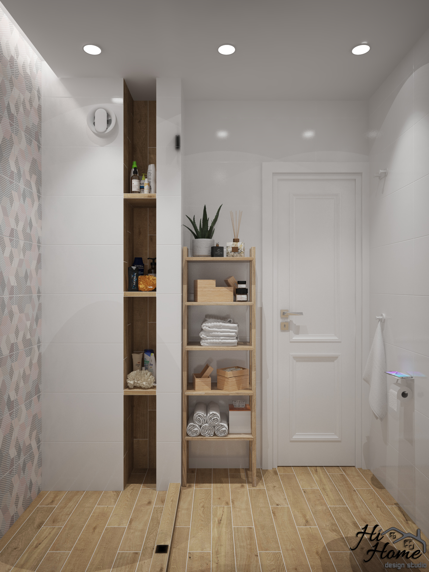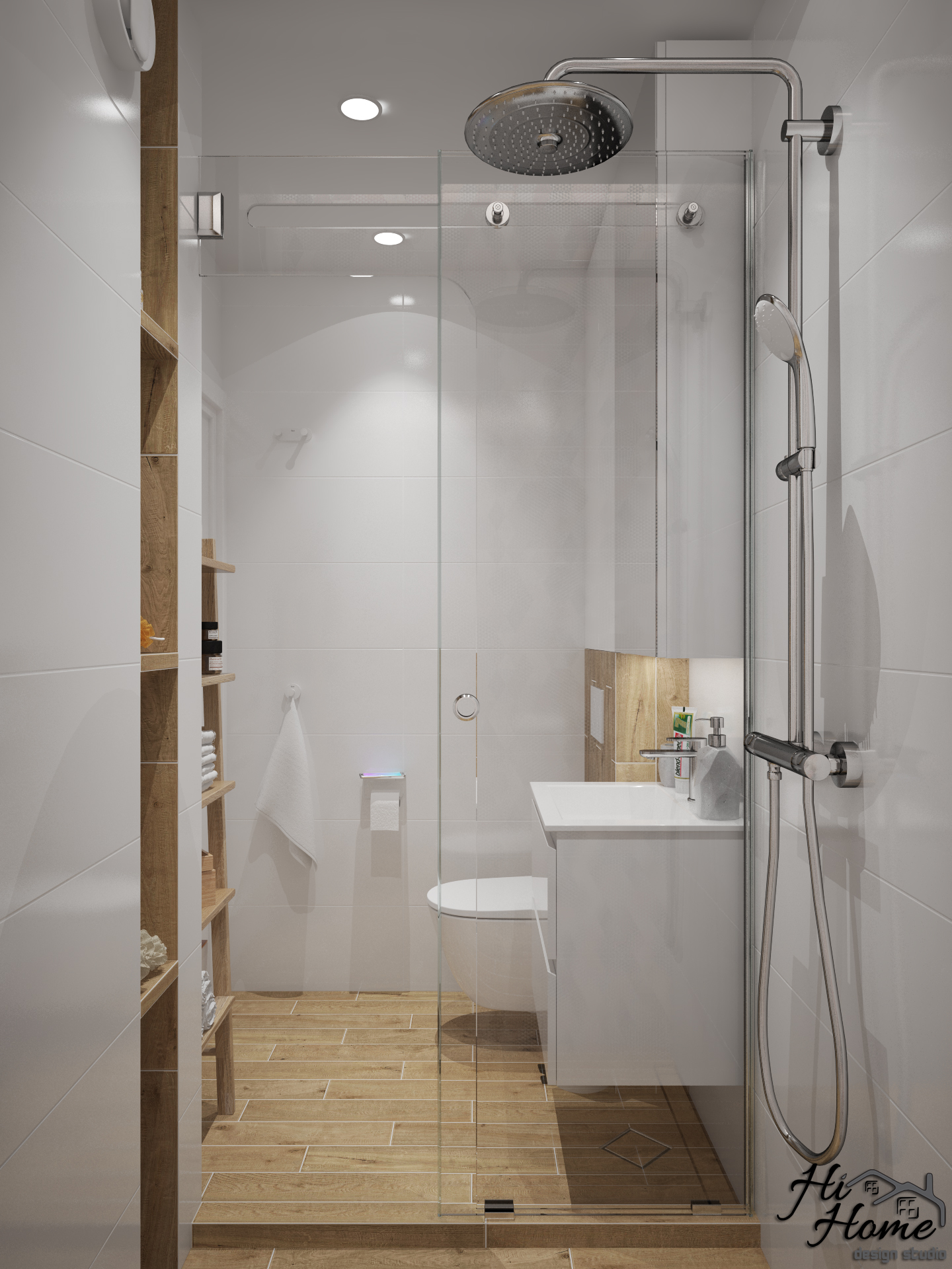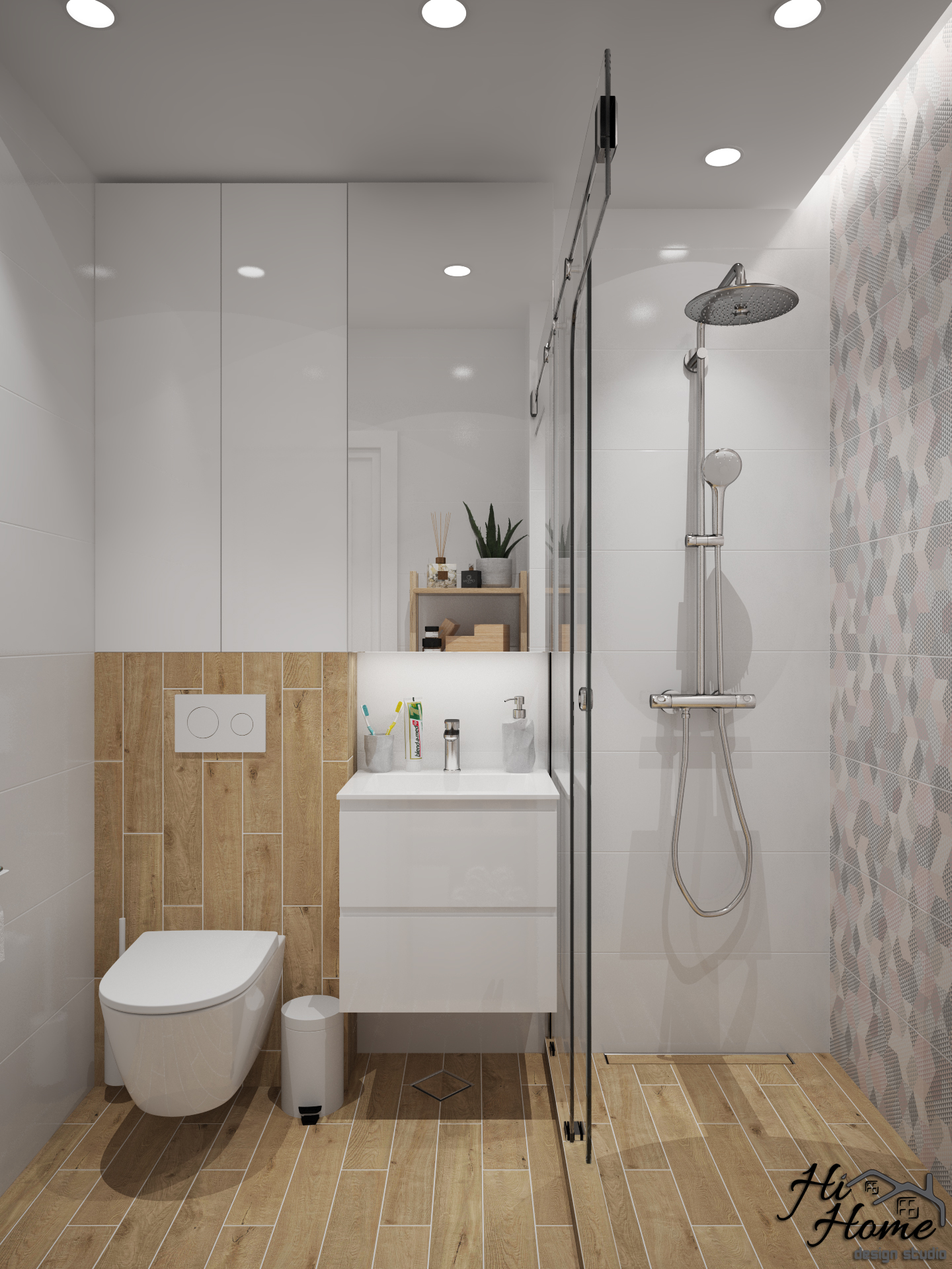 След като успяхме да изнесем бойлера, от нея се получи едно отлично разпределено помещение. Спряхме се на светъл гранитогрес, съчетан с дърво и цветен акцент в душ зоната, за да я уголемим визуално. Обособихме допълнително място за съхранение над структурата на тоалетната, а благодарение на изградената ниша в душ зоната, отделяме изцяло мократа зона с параван.