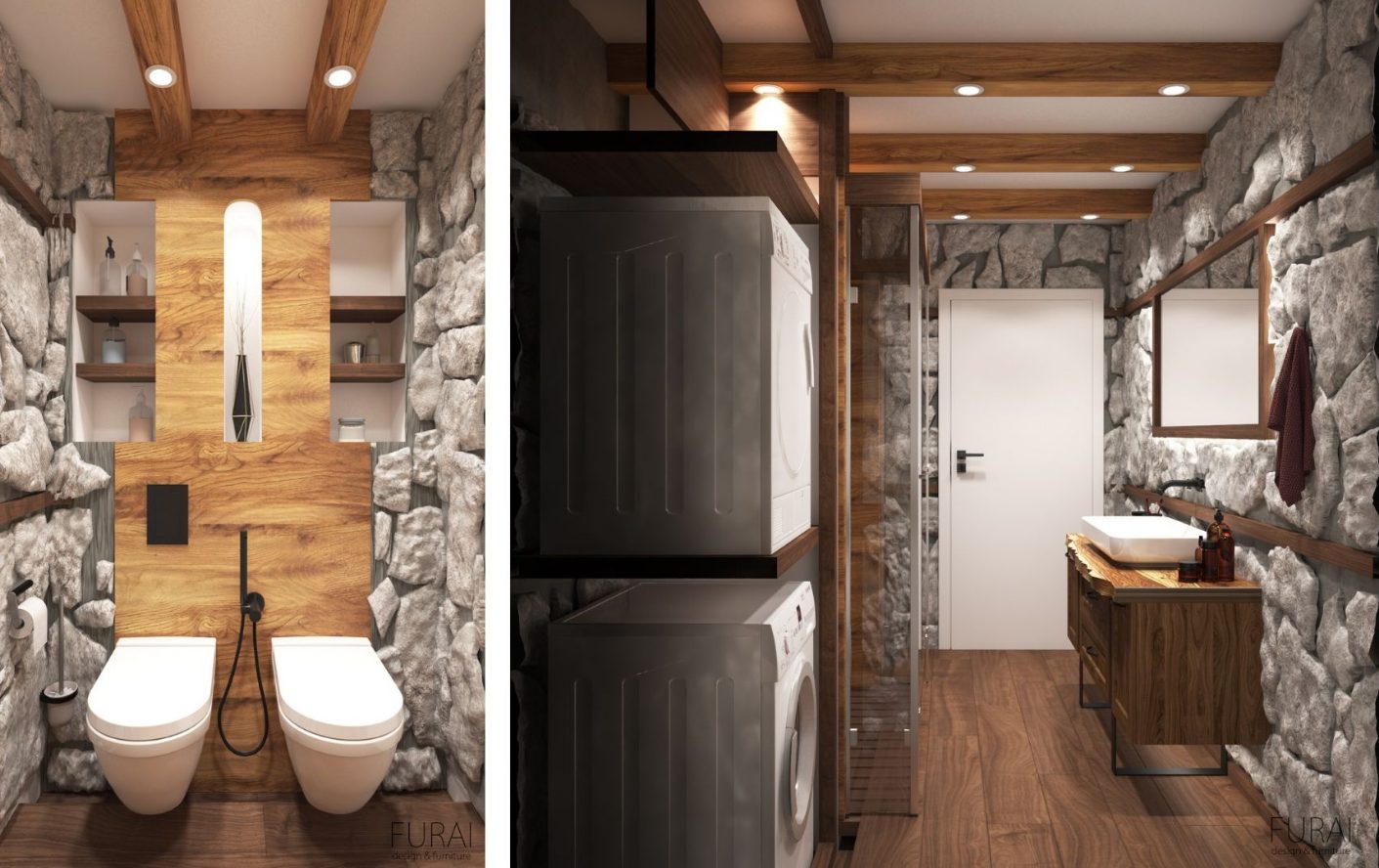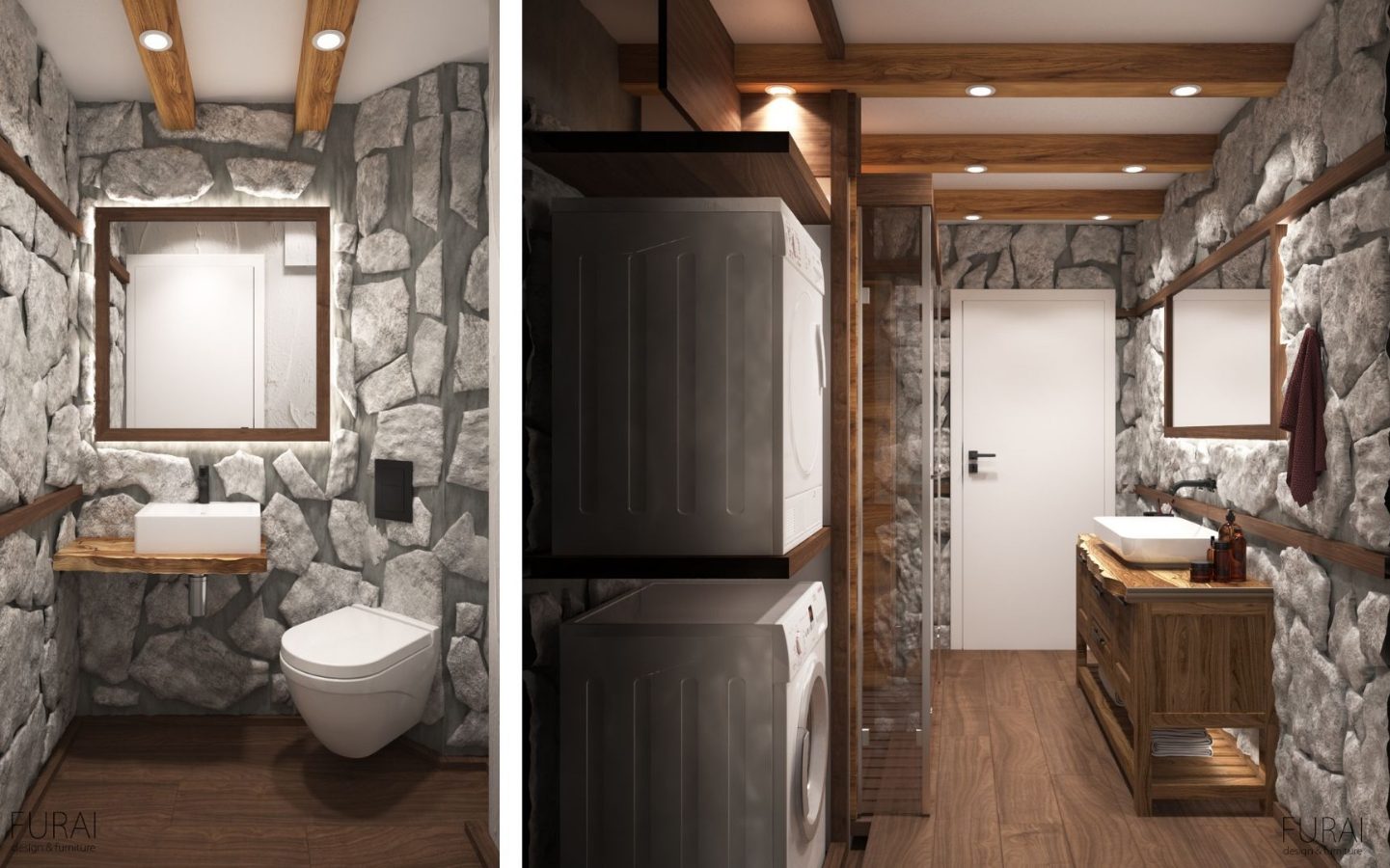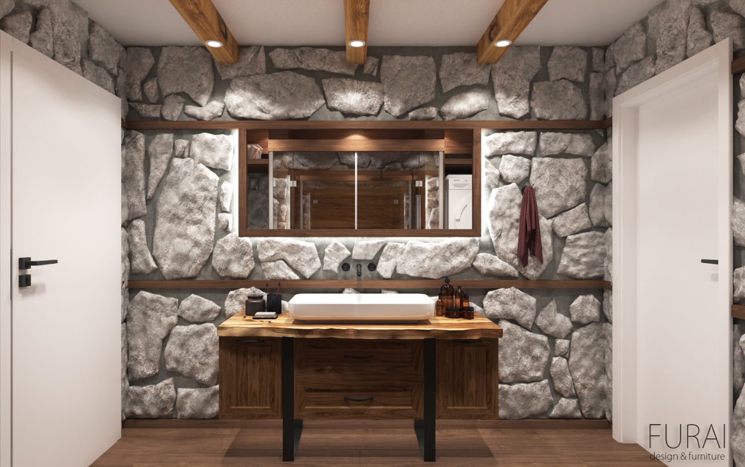 Интериорен дизайн на баня от камък и дърво