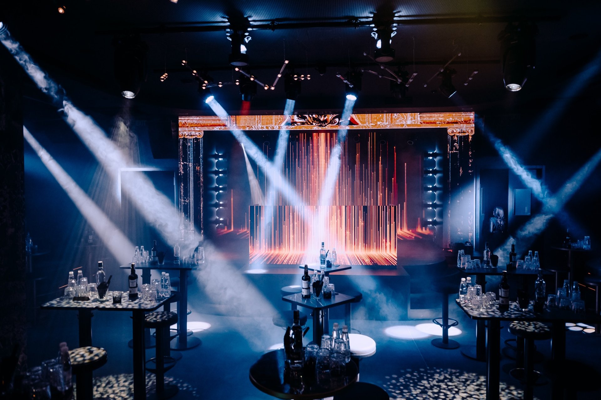 Сцената и LED системата оформят визуалното ядро на клуба. Използвани са 3D, извити и многослойно подредени LED екрани, създаващи силно усещане за дълбочина. Сцената е проектирана с възможност както за DJ сетове, така и за изпълнения на живо, включително активна зона зад DJ позицията, в която публиката става част от сценичната композиция.