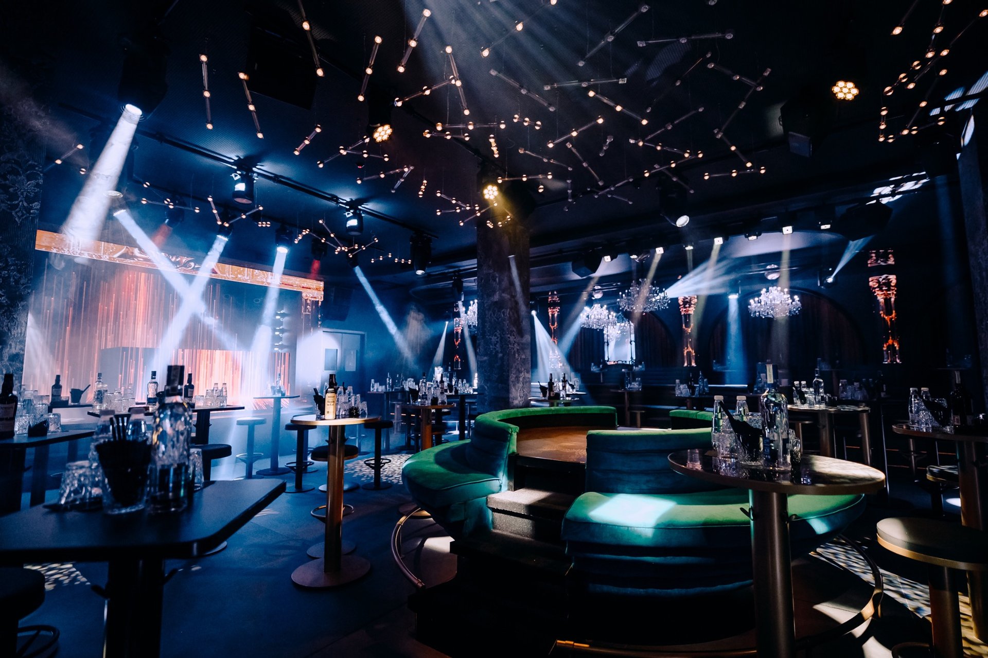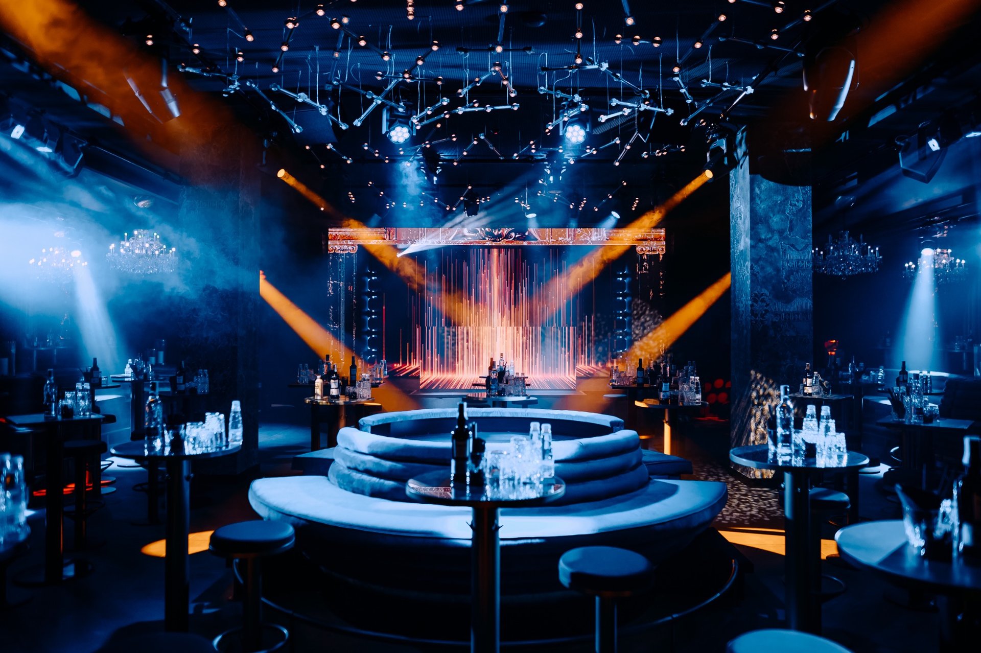 The stage and LED system form the club’s visual nucleus. State-of-the-art 3D, curved, and multilayered LED screens create a strong sense of depth and three-dimensionality. The stage is designed to accommodate both DJ sets and live performances, including an active zone behind the DJ booth where the audience becomes part of the stage composition.