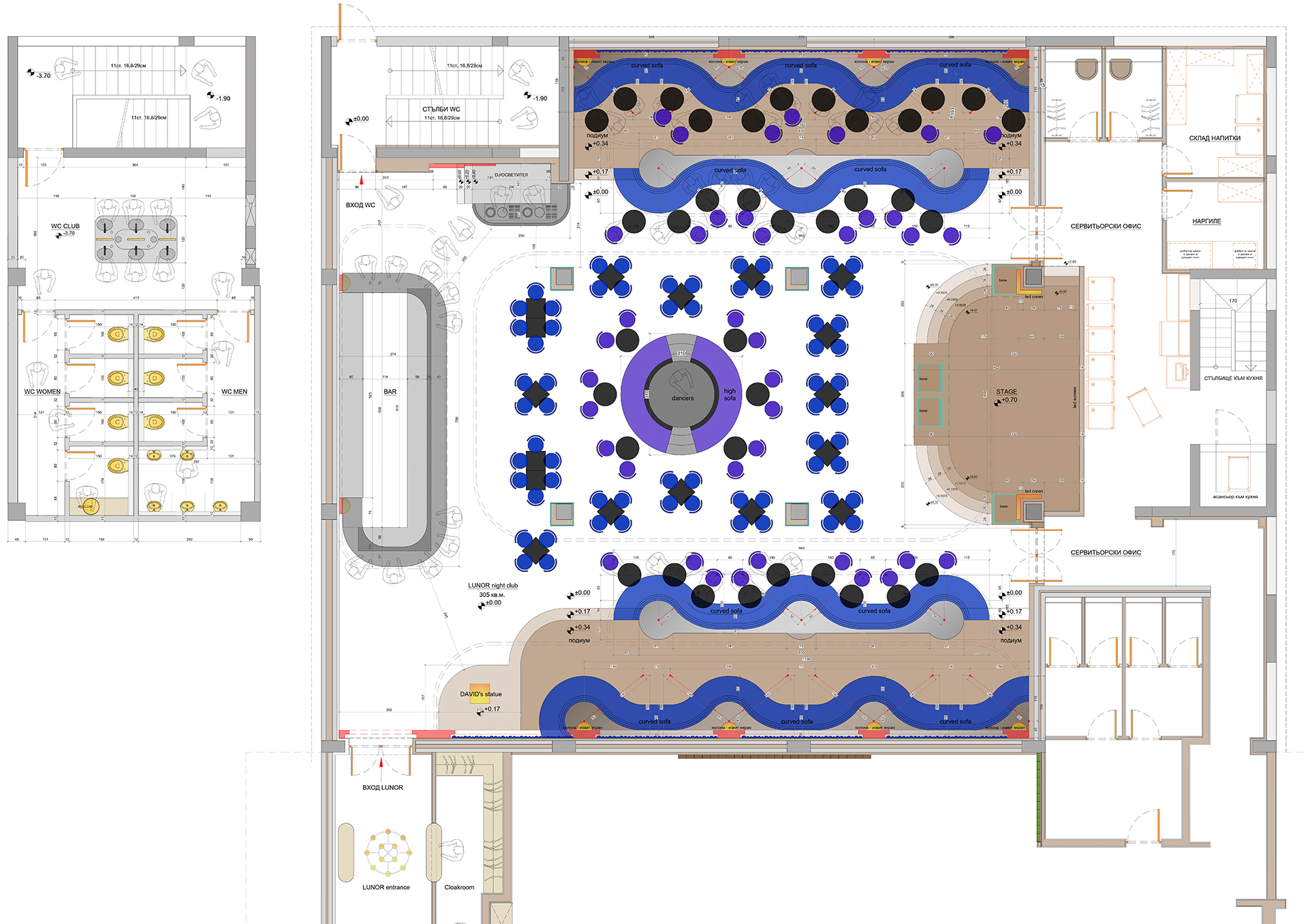The spatial organization follows a theatrical logic oriented toward the stage. The main seating areas are positioned along the two long sides of the hall on two levels, forming an amphitheatrical composition that directs visual focus toward the central zone. Soft, curved forms upholstered in velvet fabrics in truffle and royal blue tones create a sense of comfort and refined luxury. The central area features high tables, while at its core a circular elevated booth functions as a dancers’ podium, transforming the center of the hall into an active stage element.
