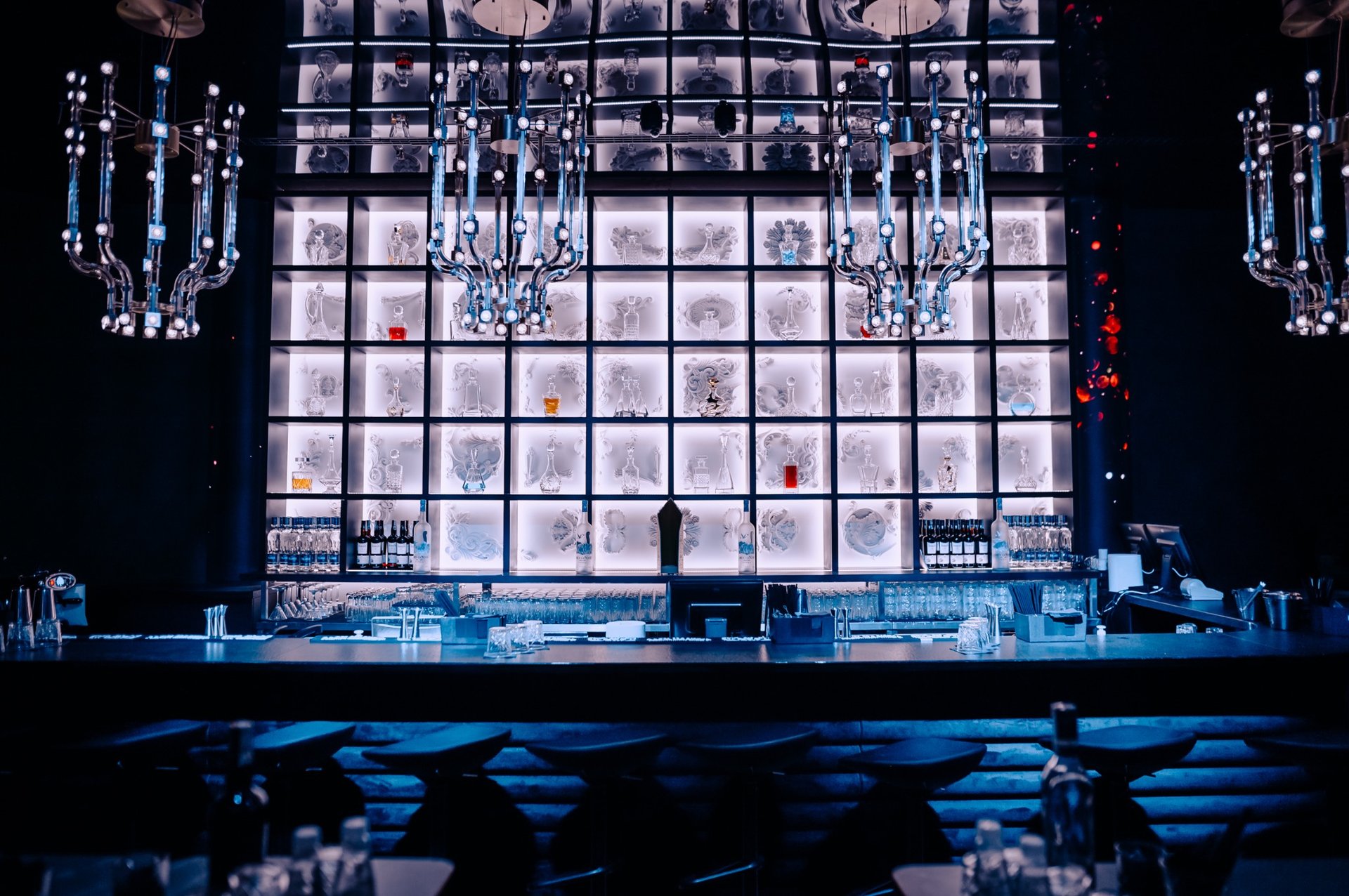 Материалната концепция залага на тъмни тонове, черен мрамор за масите, неонови 3D декоративни елементи и месингови детайли, които присъстват като постоянен мотив. Барът е третиран като архитектурна инсталация и визуален фокус.