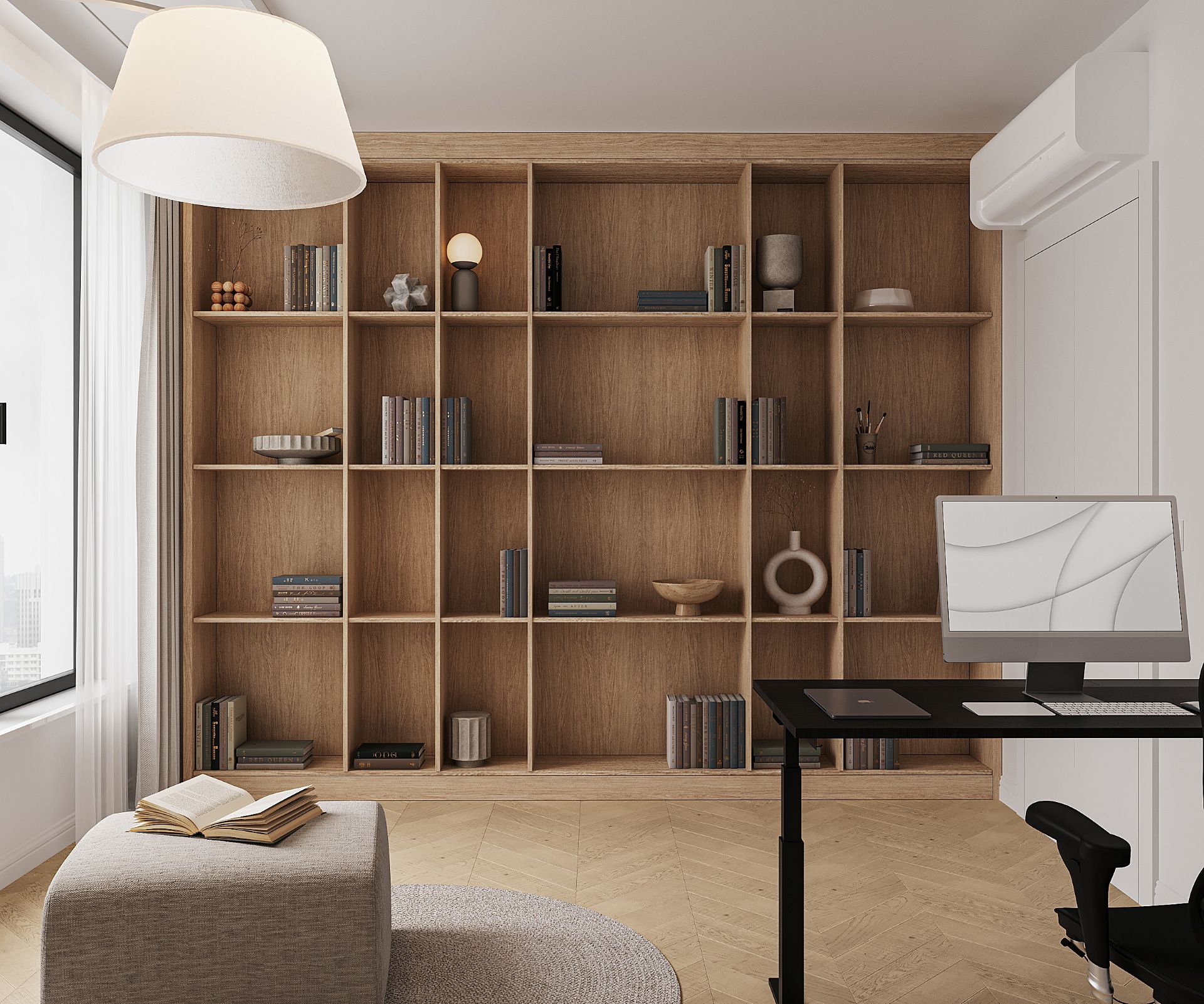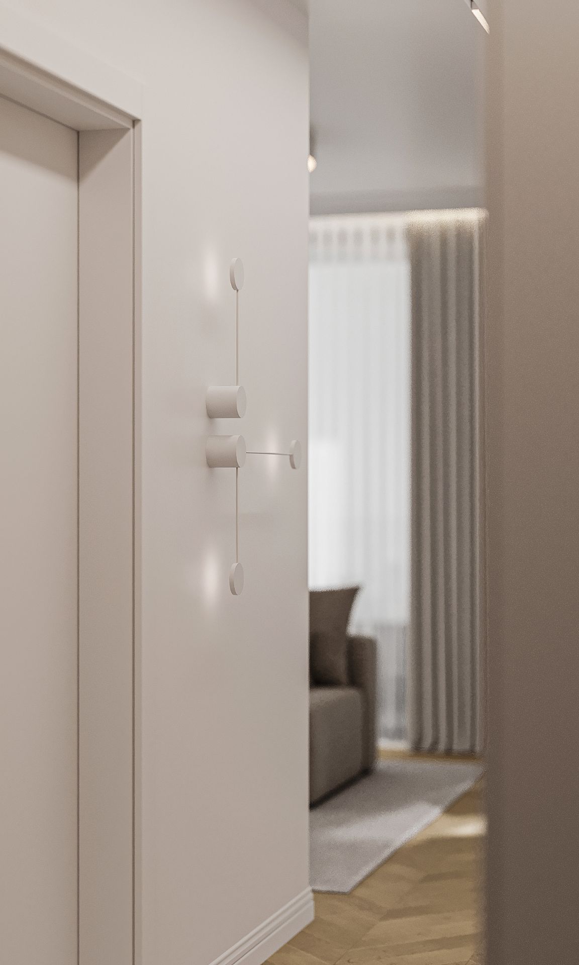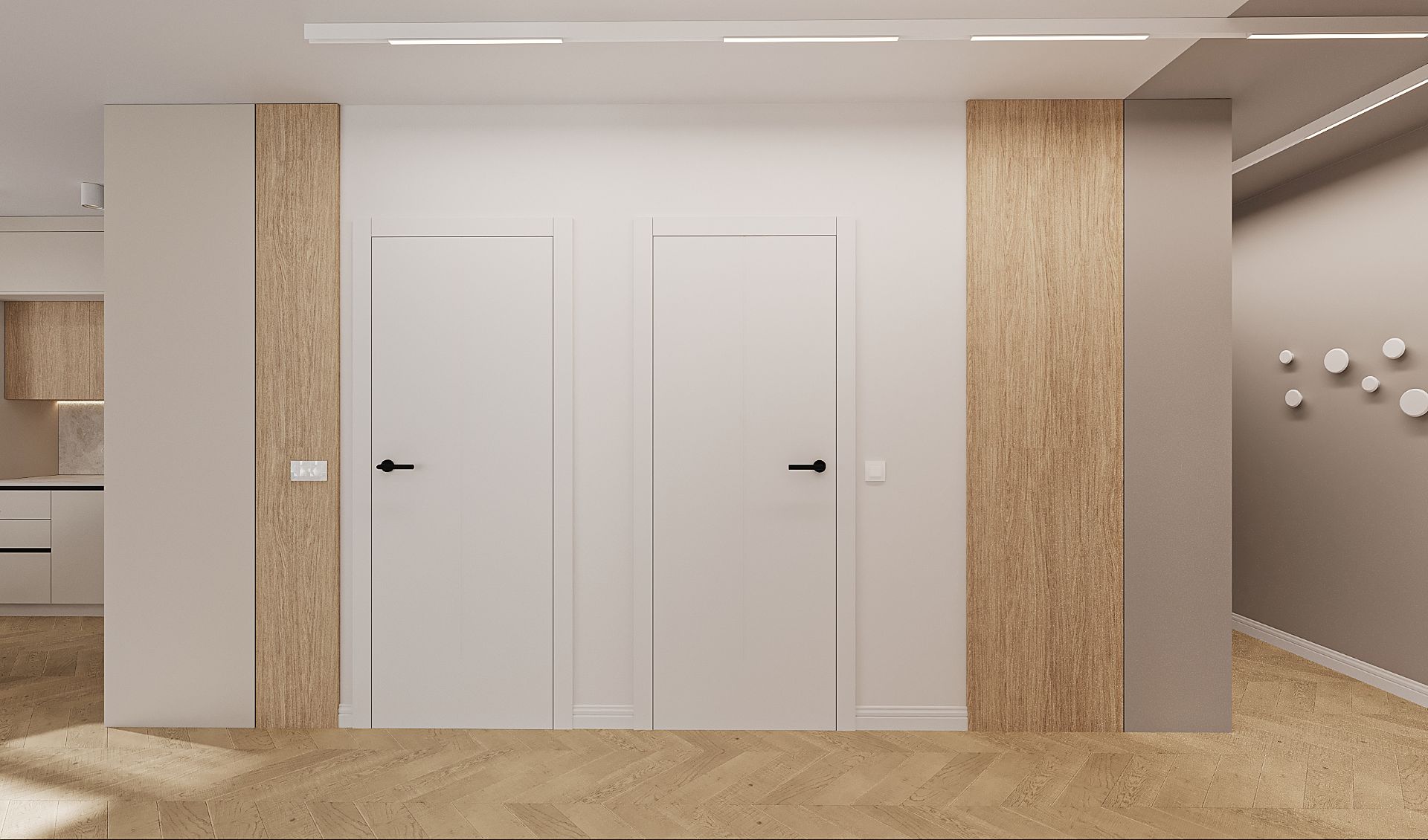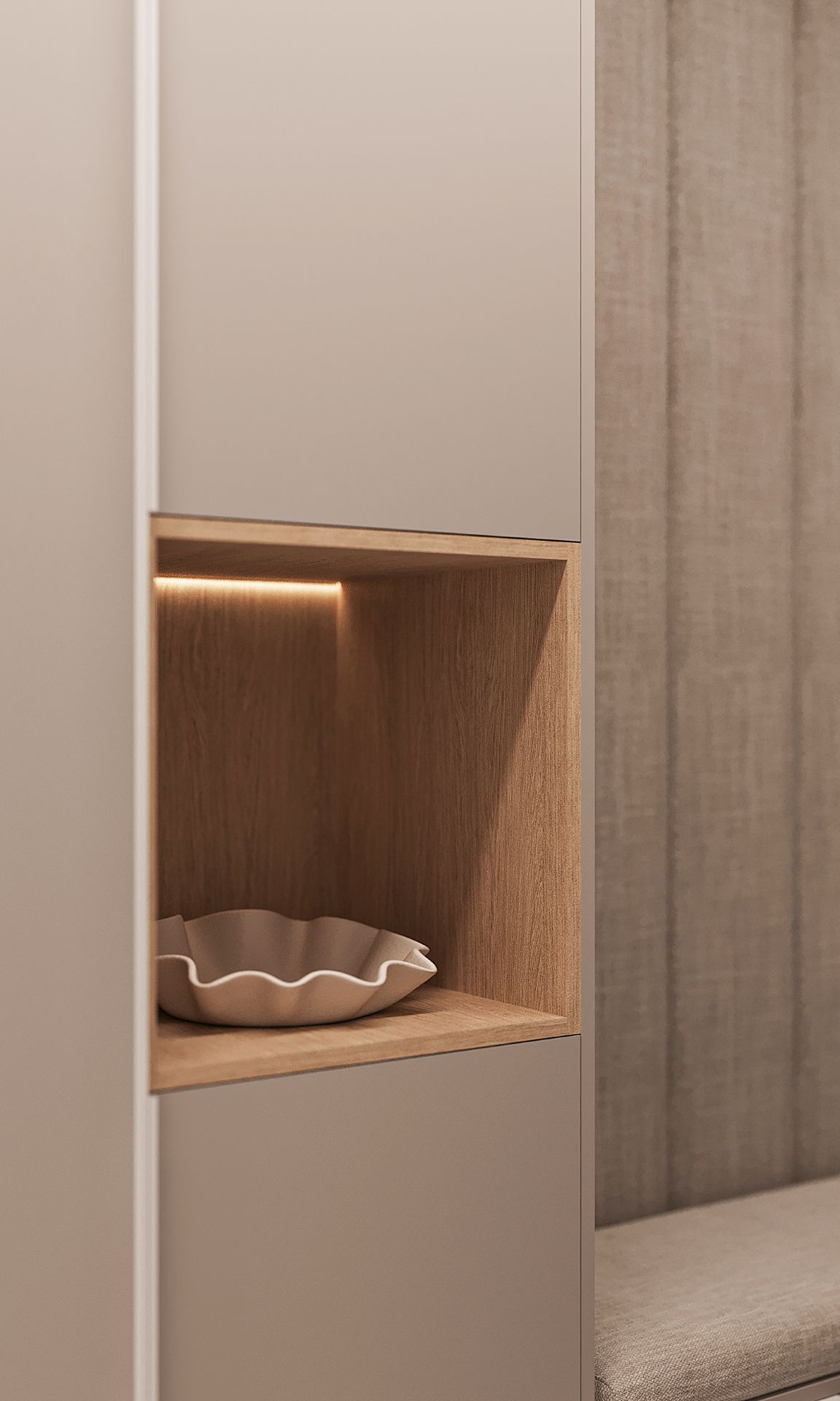 MONA е интериор, изграден върху последователна палитра от кашмирени тонове и топъл дъб, с ясно структурирани обеми и контролирана геометрия. Проектът развива еднаква логика във всички помещения – от по-дълбоките нюанси в антрето до светлата композиция на дневната, ритмичната библиотека в кабинета и панелния дървен гръб в спалнята. Всеки елемент е част от единна концепция, в която материалите, линиите и светлината работят заедно, за да оформят подредена и спокойна среда.