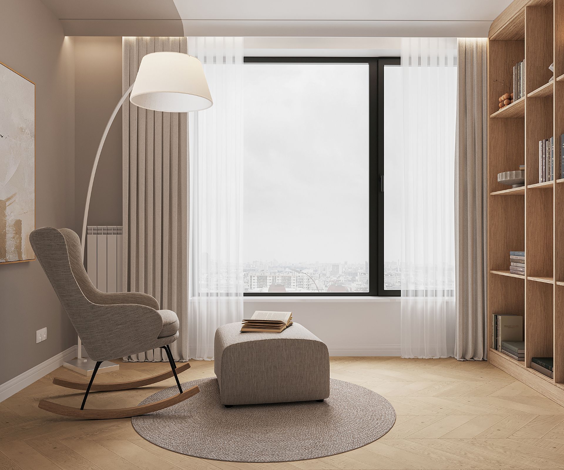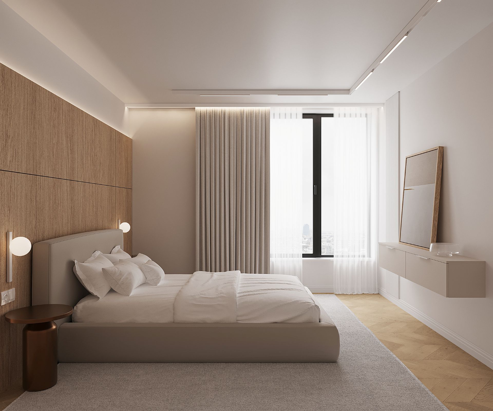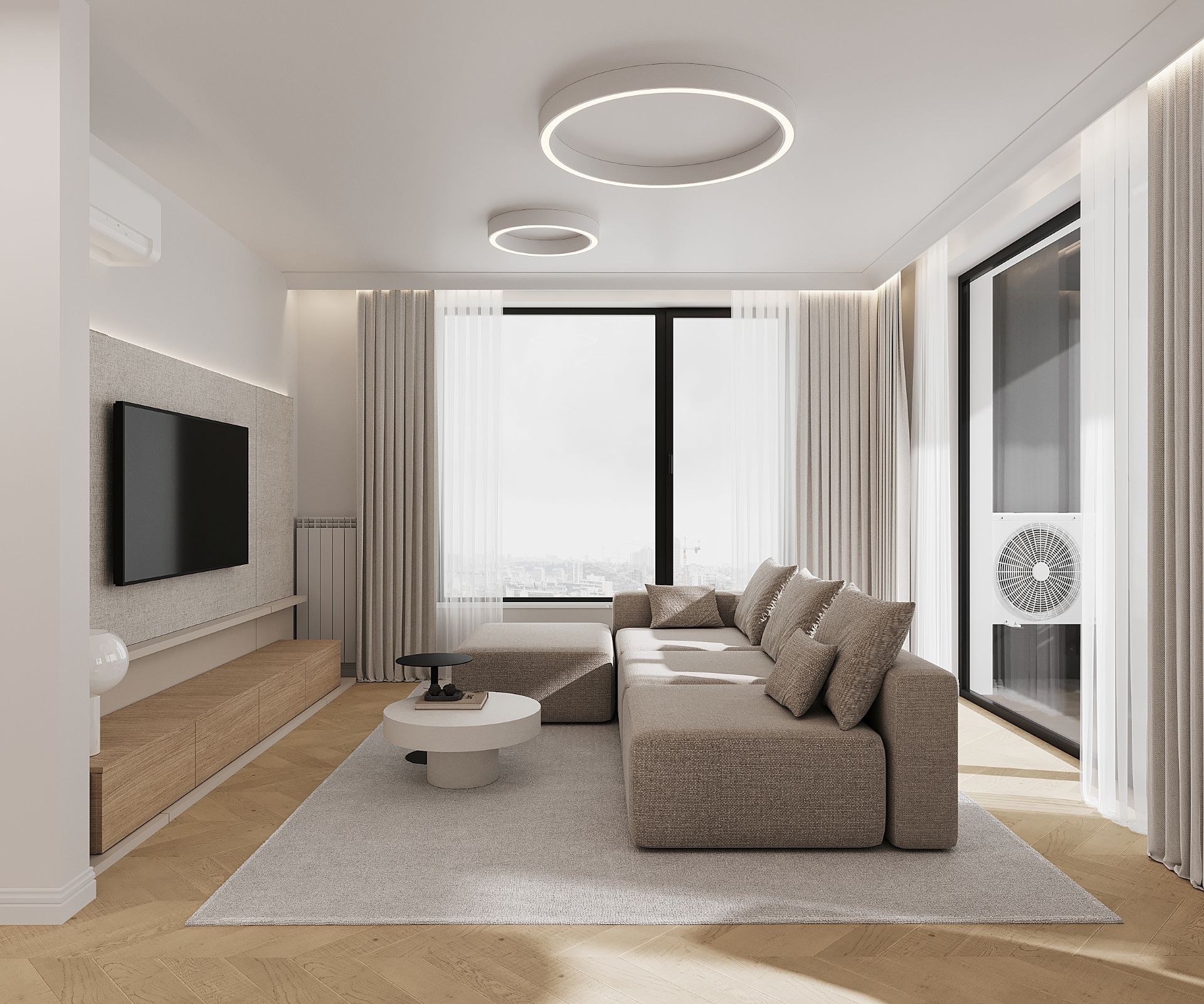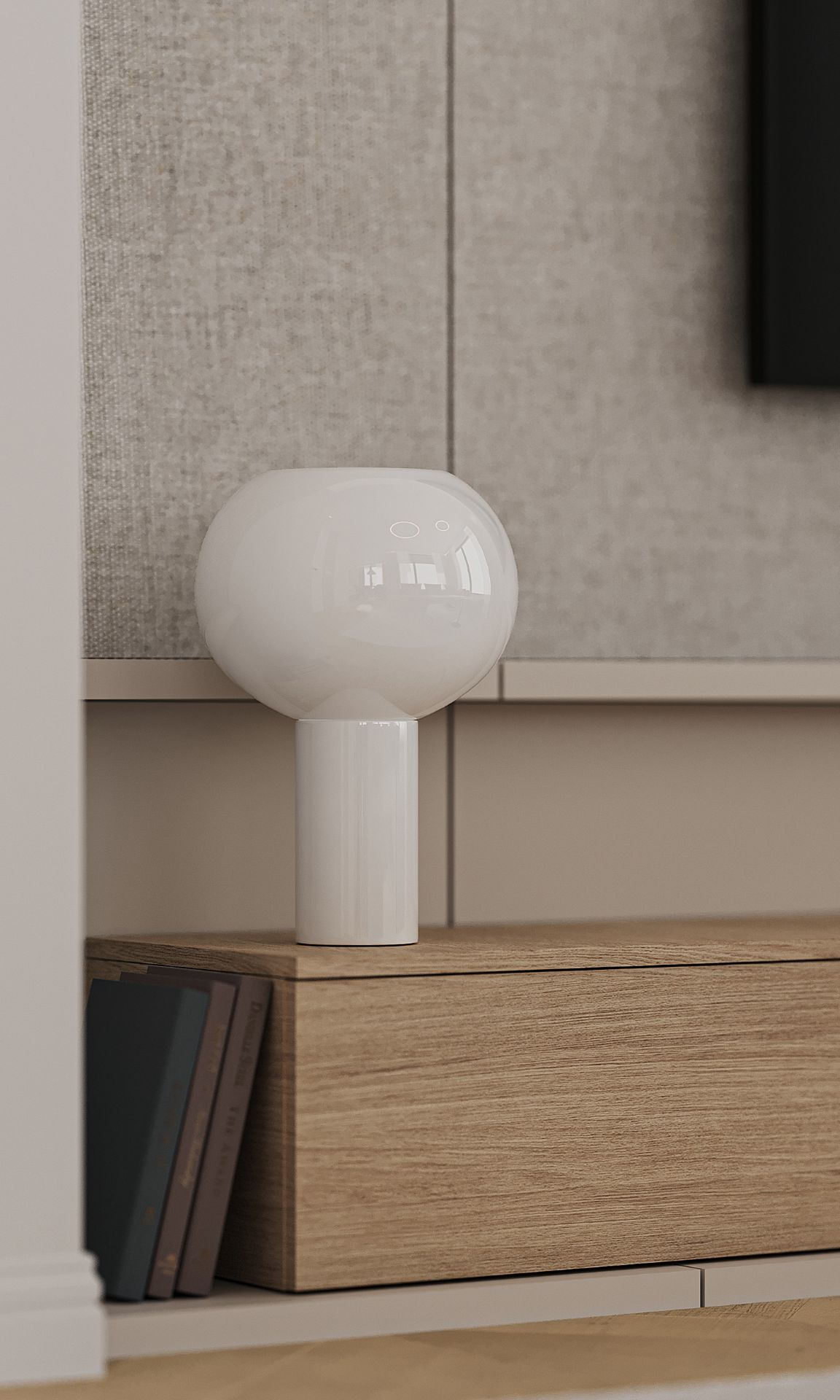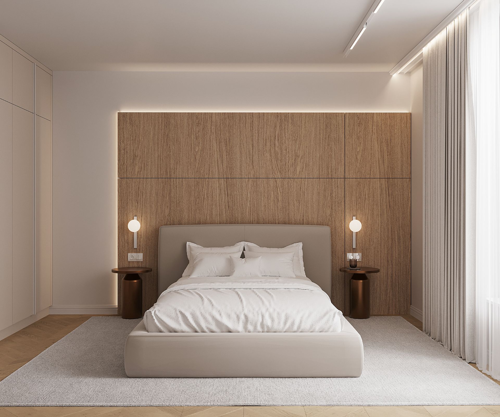 MONA е интериор, изграден върху последователна палитра от кашмирени тонове и топъл дъб, с ясно структурирани обеми и контролирана геометрия. Проектът развива еднаква логика във всички помещения – от по-дълбоките нюанси в антрето до светлата композиция на дневната, ритмичната библиотека в кабинета и панелния дървен гръб в спалнята. Всеки елемент е част от единна концепция, в която материалите, линиите и светлината работят заедно, за да оформят подредена и спокойна среда.
