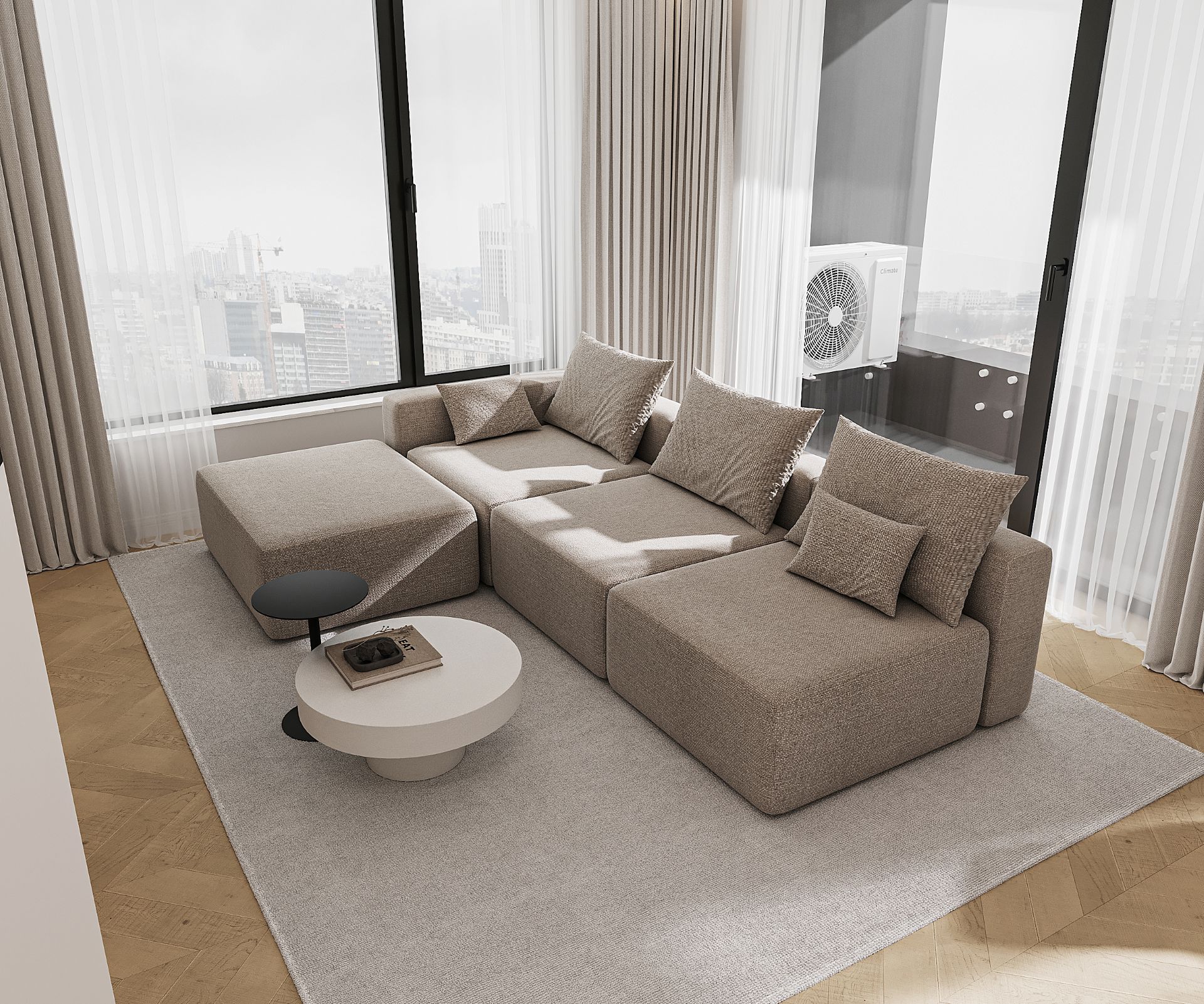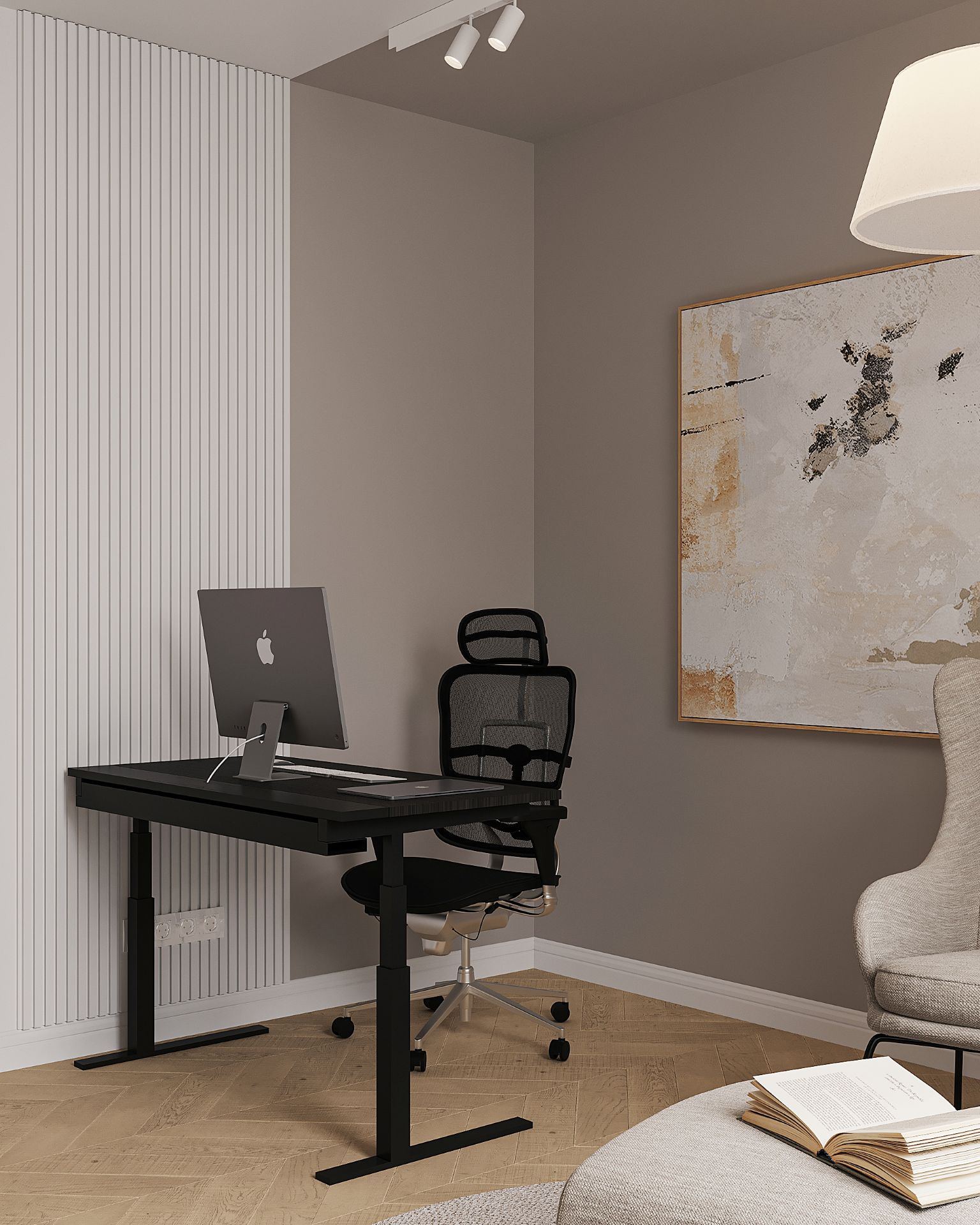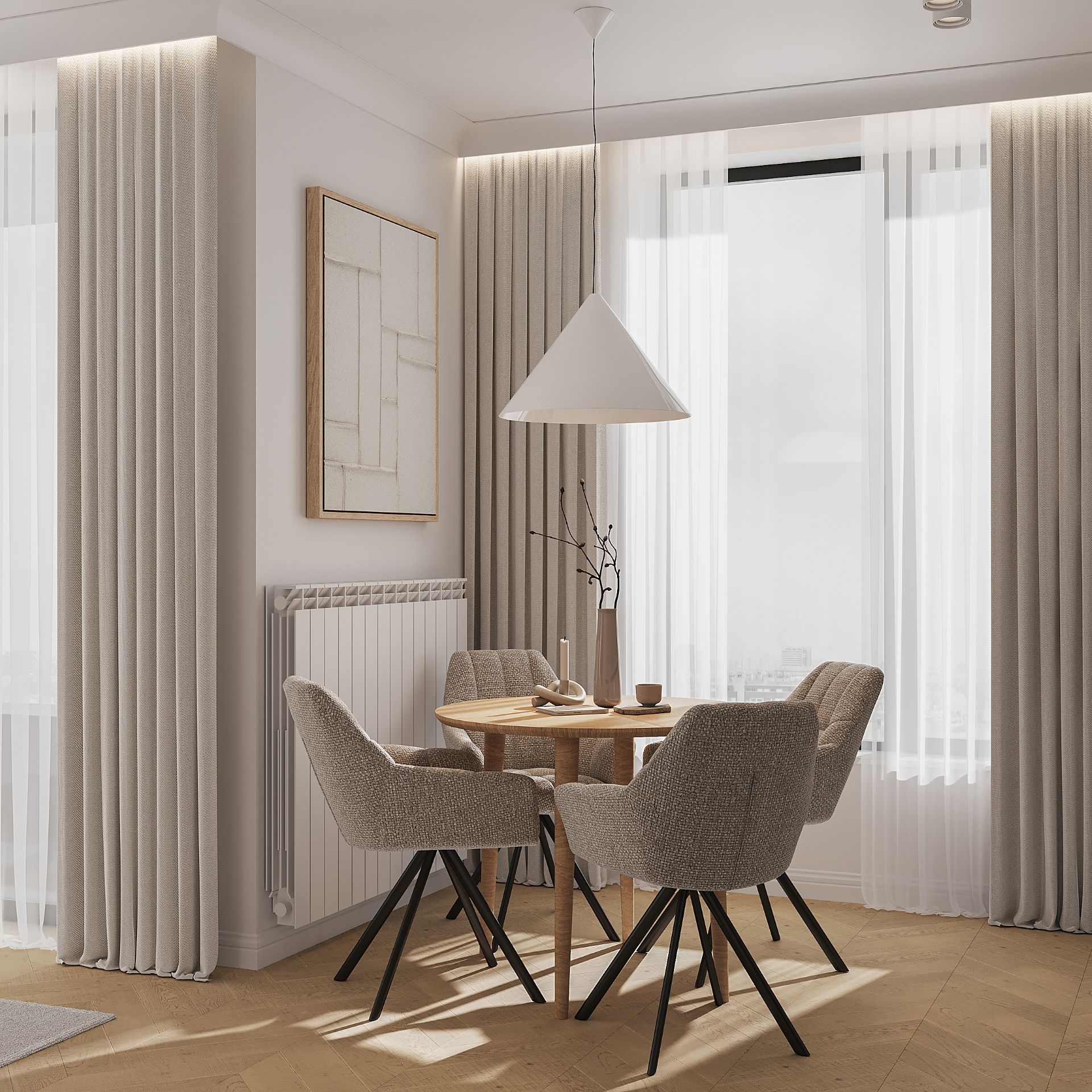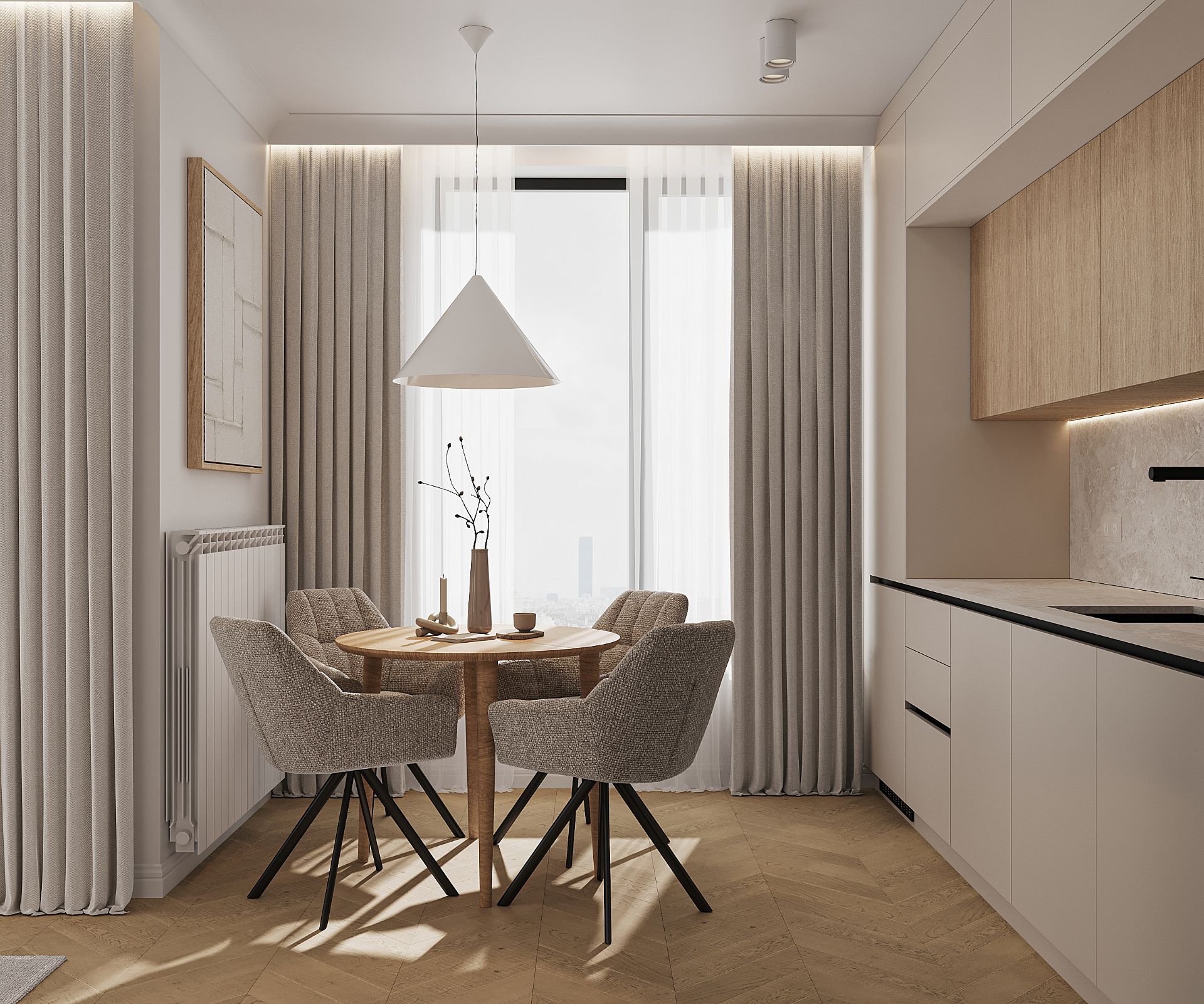 MONA е интериор, изграден върху последователна палитра от кашмирени тонове и топъл дъб, с ясно структурирани обеми и контролирана геометрия. Проектът развива еднаква логика във всички помещения – от по-дълбоките нюанси в антрето до светлата композиция на дневната, ритмичната библиотека в кабинета и панелния дървен гръб в спалнята. Всеки елемент е част от единна концепция, в която материалите, линиите и светлината работят заедно, за да оформят подредена и спокойна среда.