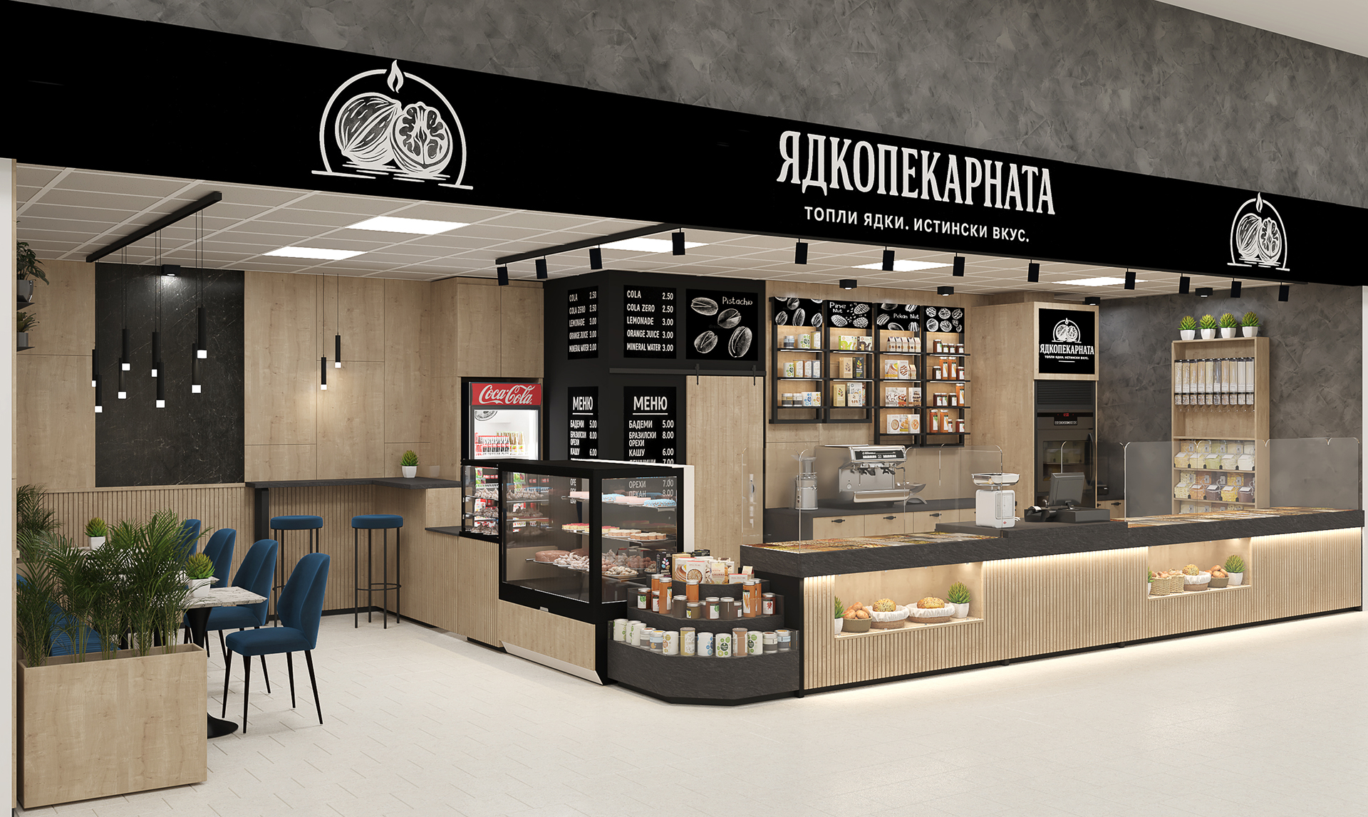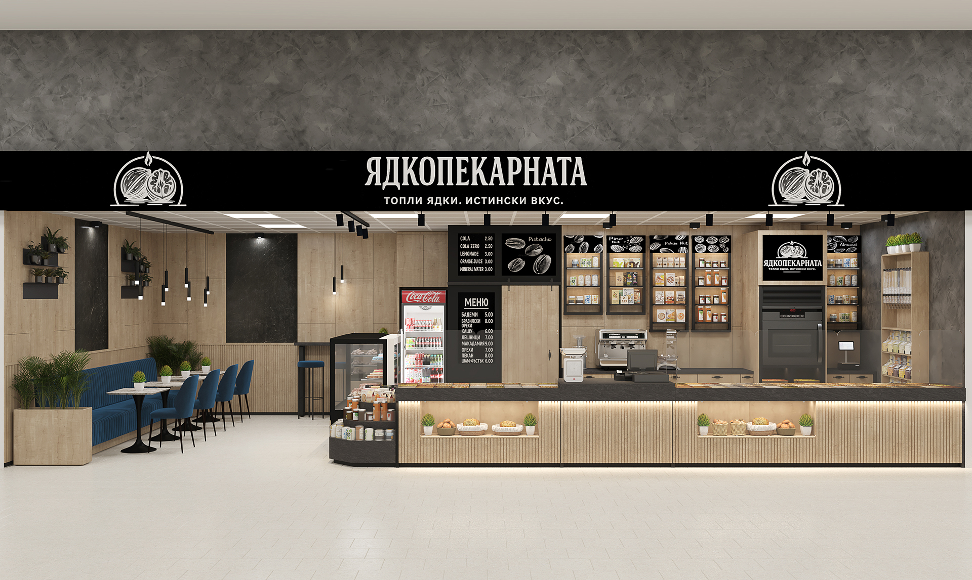 В магазина има поместена и ядко пекарна (ядките се изпичат на място) и дизайнът трябваше да бъде съобразен и с тази функционалност. Дизайнът е минималистичен, с отчитане на факта, че всичко трябва да стане бързо и устойчиво за ползване във времето. Предизвикателствата са, че строително монтажните дейности трябва да са устойчиви за ползване, но с минимални последствия за демонтаж след време и без да нанасят щети или да оставят трайни следи след време (поради нови наематели и/или бъдещи разширения на търговската площ). Използвани са дърво и в контраст на него, тъмни плоскости с релеф.
