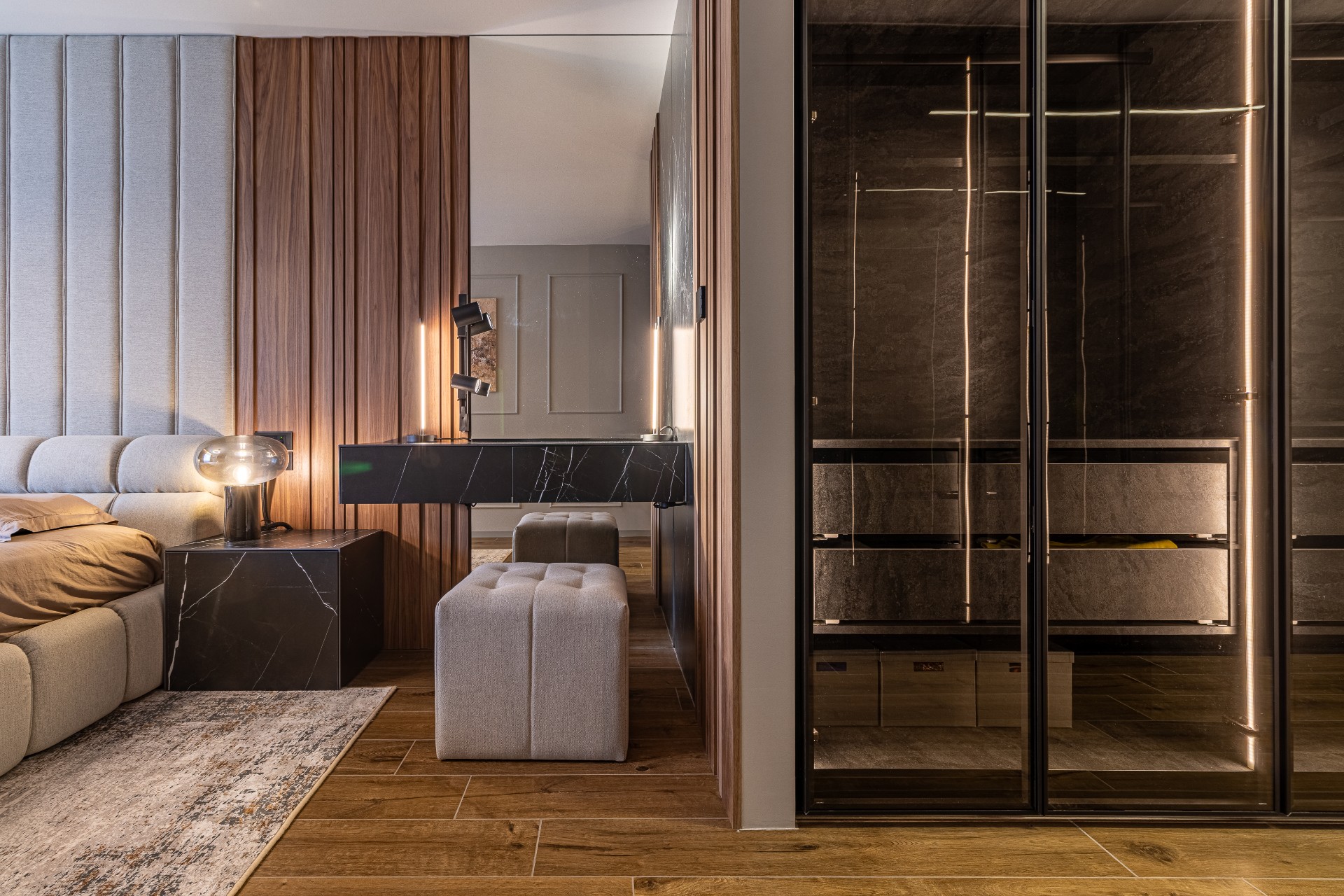 A key focus of the project is the creation of a calm, understated atmosphere, achieved through a carefully curated palette of soft, neutral tones combined with subtle accents and natural materials. These elements add depth and texture without disrupting visual balance; on the contrary, they enhance the feeling of warmth and refined elegance. Luxury here is not expressed through excess, but through tactile qualities and sensory experience — perceived in materials, light, and proportion.