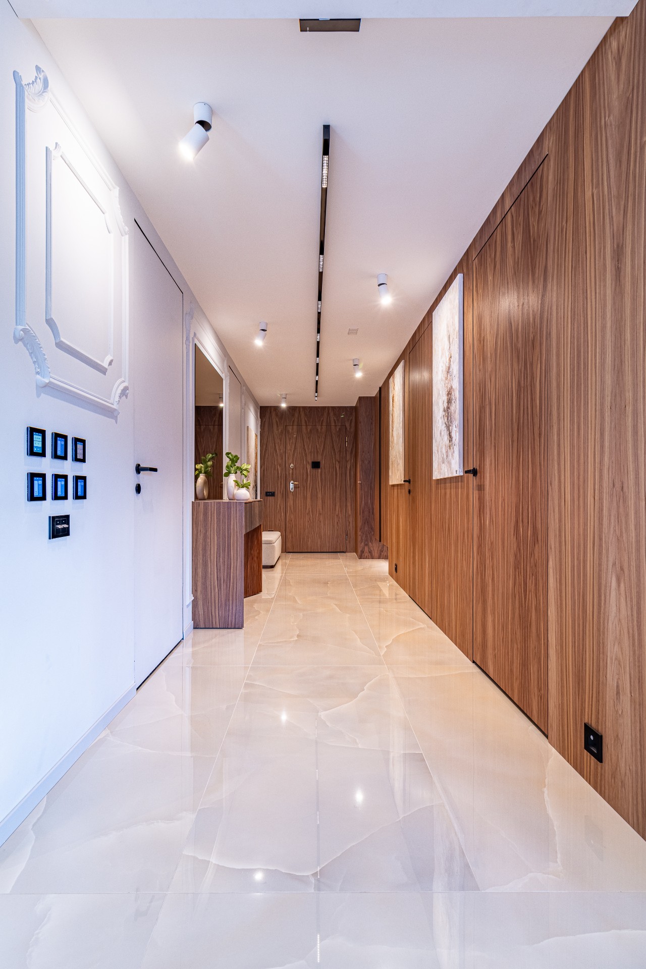 В този семеен апартамент концепцията за съвременен лукс е интерпретирана като състояние на баланс — между функционалност и емоция, между чиста архитектурна линия и усещане за уют. Пространството е проектирано като цялостна среда за живот, в която всяко решение следва ясна логика и допринася за хармонията на интериора.