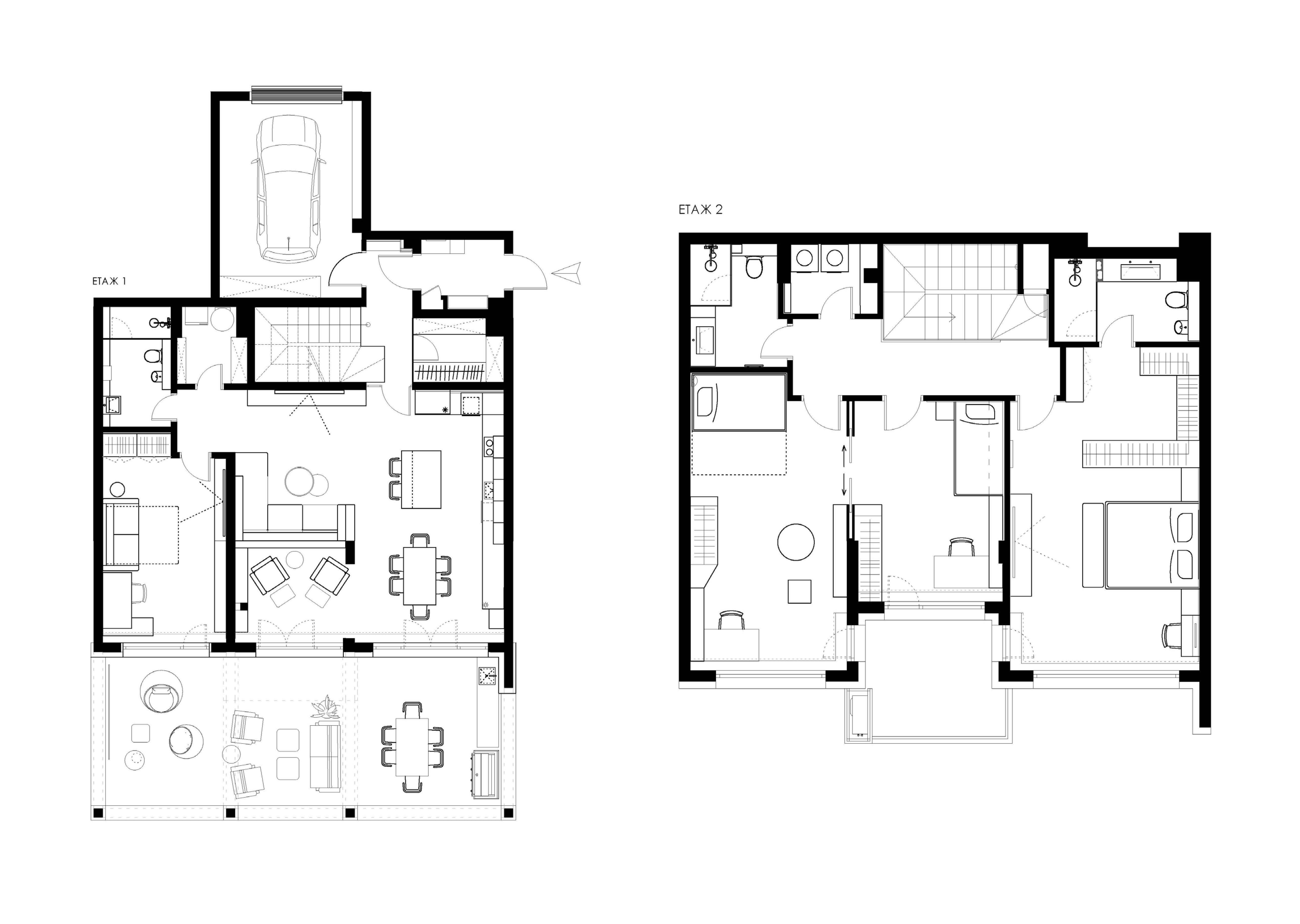 Идеята за обединяване на двете жилища възниква като естествено продължение на нуждата от повече синхрон и адаптивност в семейния живот. Първоначално обмисляни като самостоятелни апартаменти, те се превръщат в органичен, двуетажен дом, обединен от прецизно инженерно и дизайнерско решение.