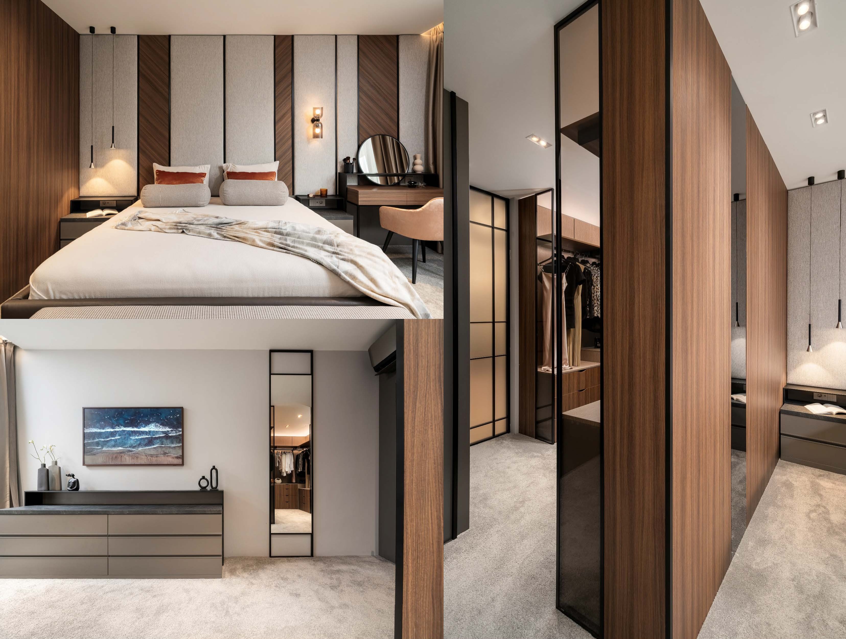Родителската спалня е проектирана като компактен мастър суит – със собствена баня, достъпна чрез отворена гардеробна, осигуряваща последователност и уединение.