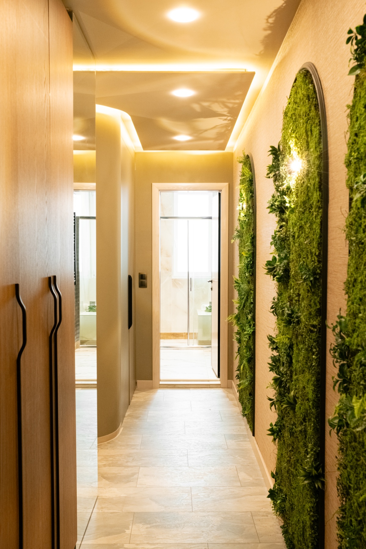 Distinctive features in this area include curved arches accented with moss, which introduce a living, biophilic element into the space. Carefully layered lighting enhances the textures and creates a tranquil ambiance, while a lowered ceiling in the secondary corridor adds rhythm and intimacy. Bamboo wallpaper further enriches the tactile quality of the space, reinforcing the connection to nature. The darker, earth-based color palette enhances the feeling of grounding and introspection, evoking a subtle sense of zen.