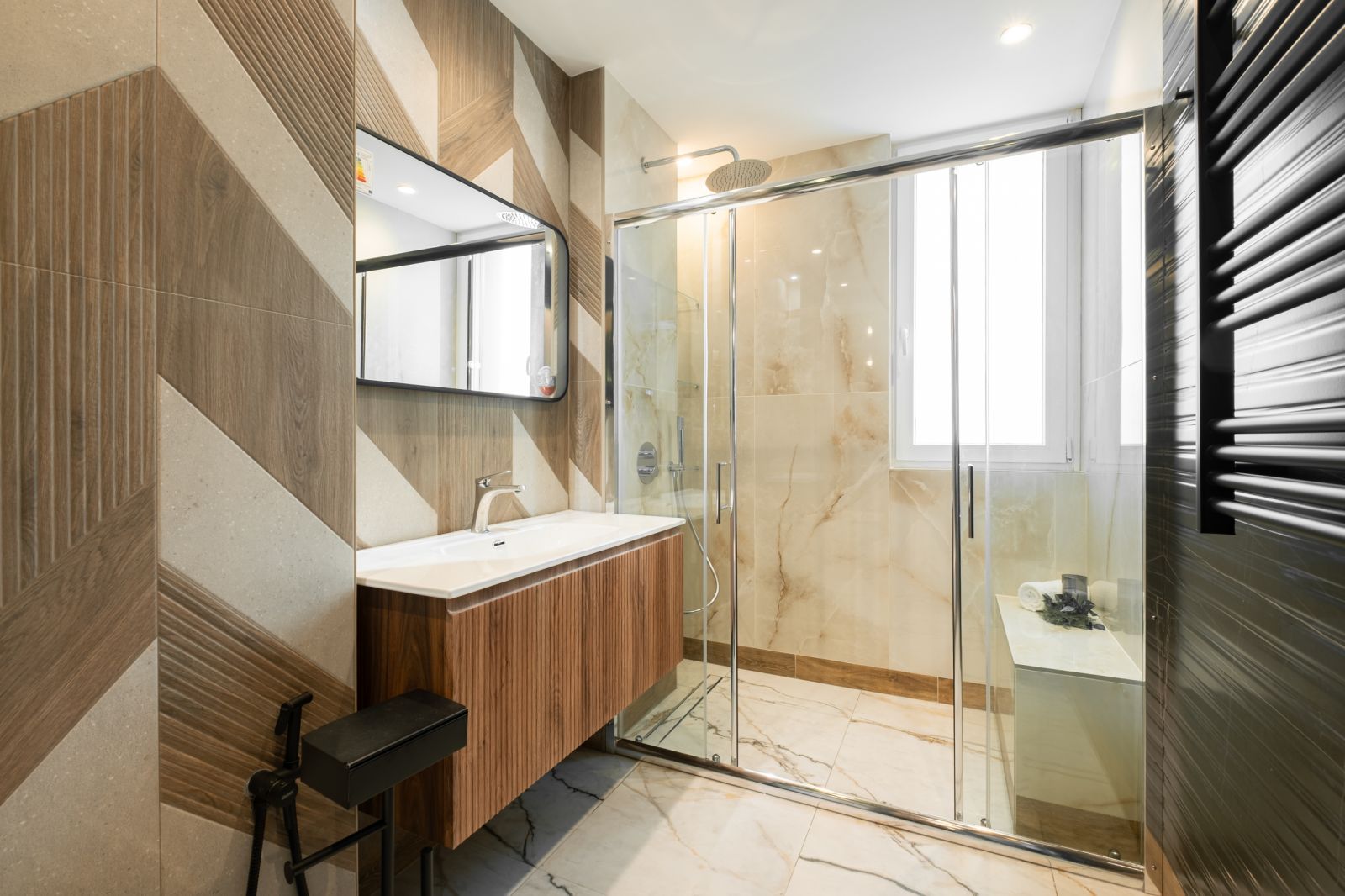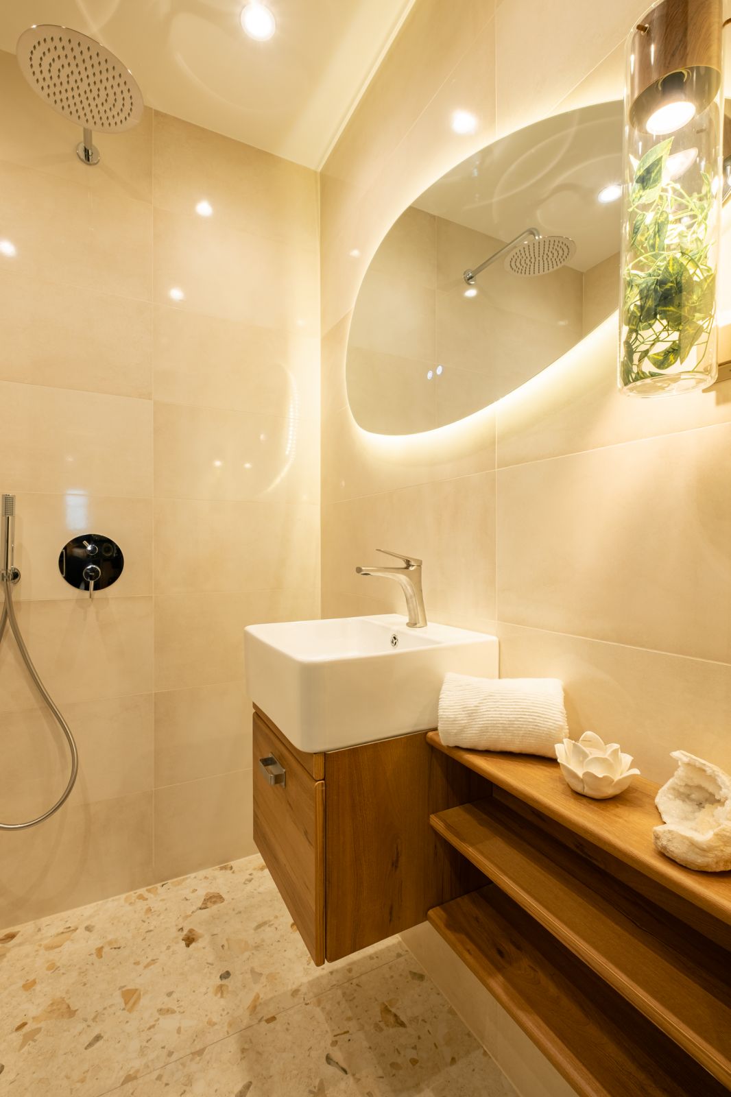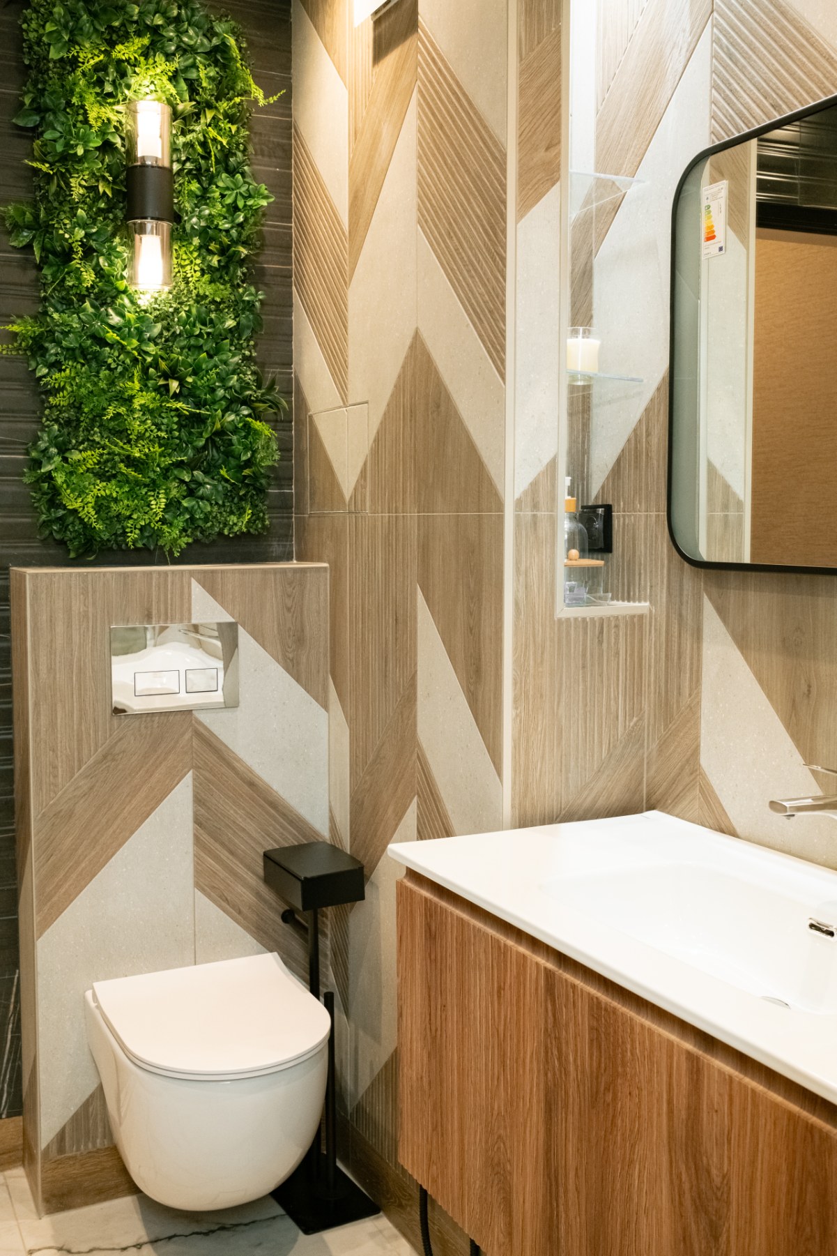 The main bathroom is designed as a private wellness retreat. Here, various natural textures—wood, stone, and mineral finishes—are combined in a balanced and refined composition. A green accent panel above the toilet introduces color and softness, echoing the biophilic elements found throughout the apartment. Because the bathroom benefits from natural daylight through a window, the design allowed for the inclusion of a built-in bench within the shower area. This element transforms the daily ritual of bathing into a spa-like experience, encouraging relaxation and presence.