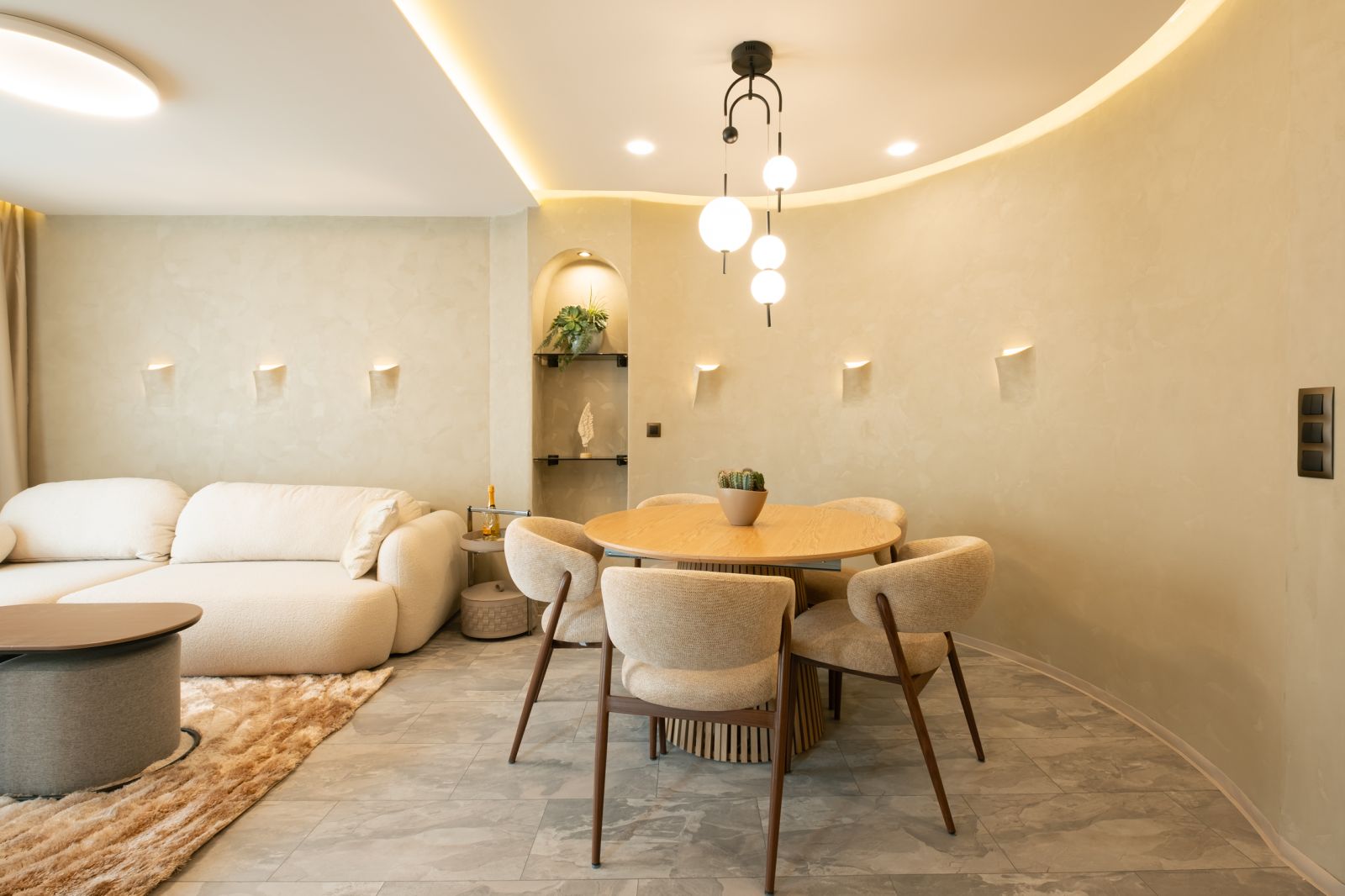 Ключов архитектурен елемент в дневната е декоративната заоблена стена, проектирана едновременно като визуален акцент и мек пространствен разделител. Скулптурната ѝ форма нежно води погледа към зоната с дивана, подсилвайки усещането за движение и непрекъснатост. В стената са интегрирани гипсови луни на ACA Light – технически предизвикателно решение заради сложната извивка на повърхността. Осветлението е дискретно и атмосферно, подчертава формата на стената и създава мека, разсеяна светлина в пространството.