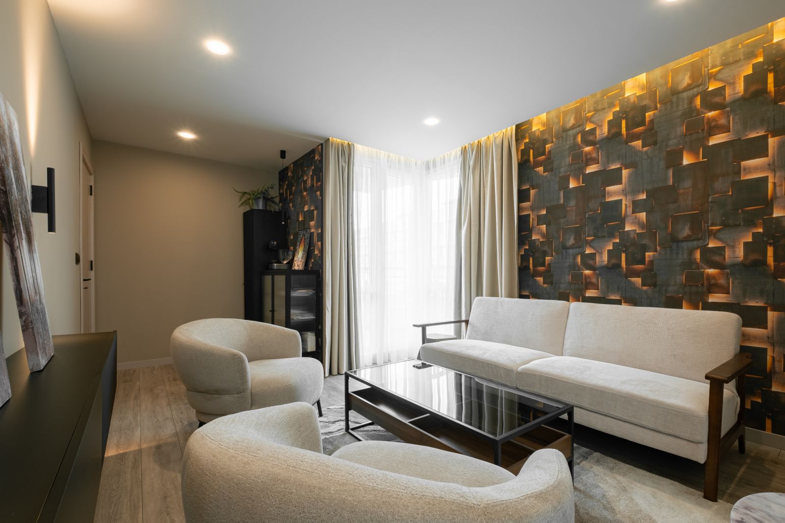A key architectural feature of the living space is the decorative curved wall, designed as both a visual guide and a spatial divider. Its sculptural form gently leads the eye toward the sofa area, reinforcing the idea of motion and continuity. Embedded within this wall are custom plaster recessed lights by ACA Light—a technically demanding solution due to the complex curvature of the surface. The lighting is subtle and atmospheric, accentuating the wall’s form while maintaining a calm, diffused glow throughout the space.