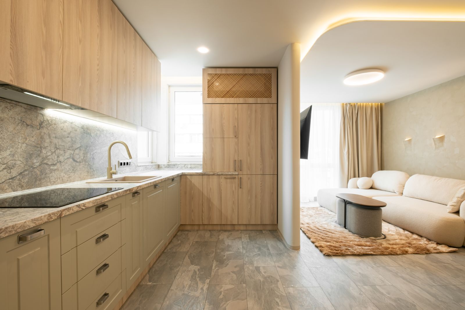 To support this concept, the original layout was reimagined. The kitchen and living area were repositioned, allowing the primary living spaces to benefit from increased natural light and improved spatial proportions. This change immediately enhanced the openness of the apartment and reinforced the sense of airiness that defines the project. The kitchen now integrates effortlessly into the living environment, becoming part of a unified social zone rather than a separate, enclosed function.