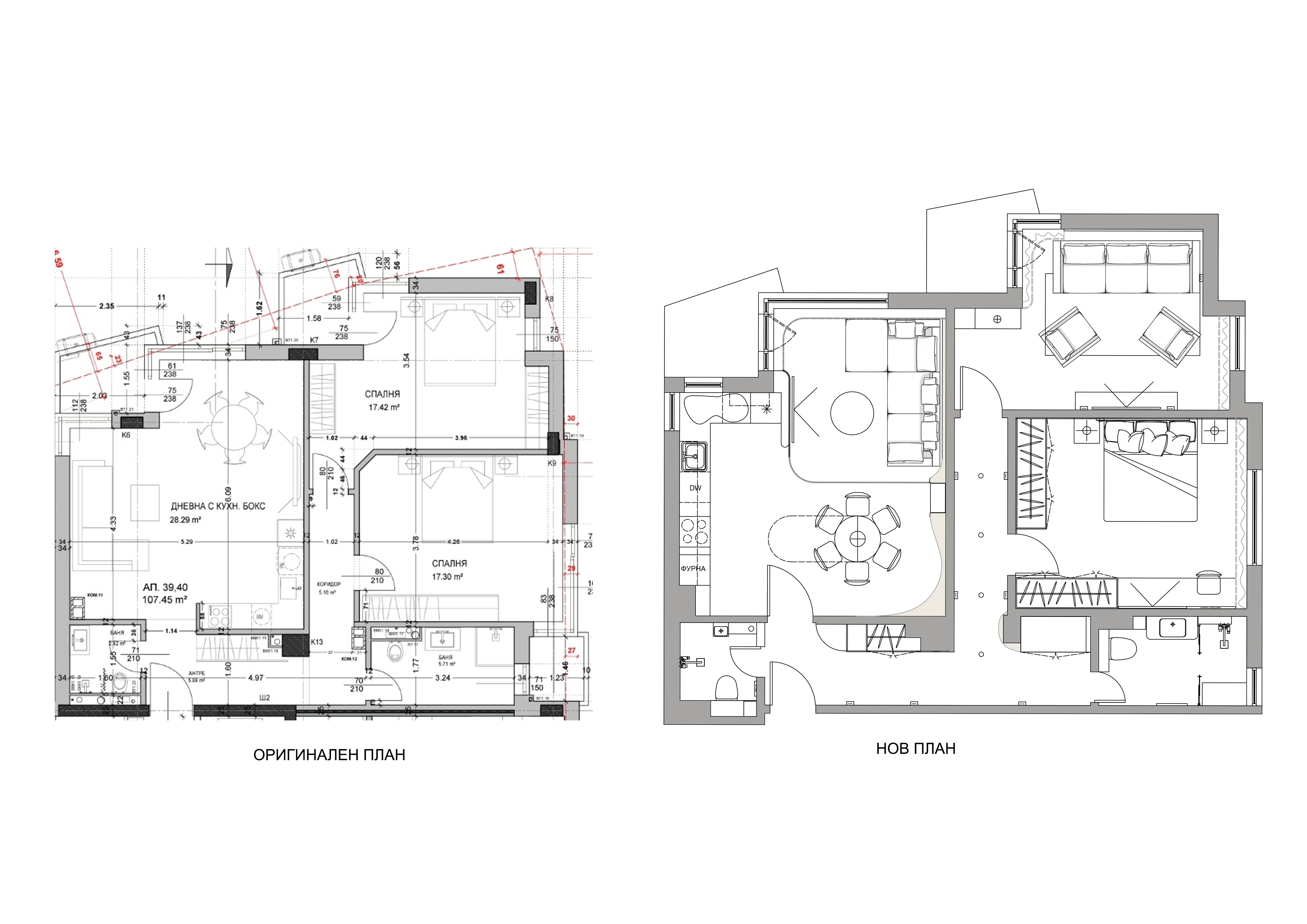За да подкрепим тази концепция, първоначалното разпределение беше преосмислено. Кухнята и дневната зона размениха местата си, което позволи основните жилищни пространства да се възползват от повече естествена светлина и по-добри пропорции. Тази промяна веднага подобри усещането за отвореност и лекота в апартамента. Кухнята вече се вписва безпроблемно в дневната среда, превръщайки се в част от единно социално пространство, а не в изолирана функционална зона.