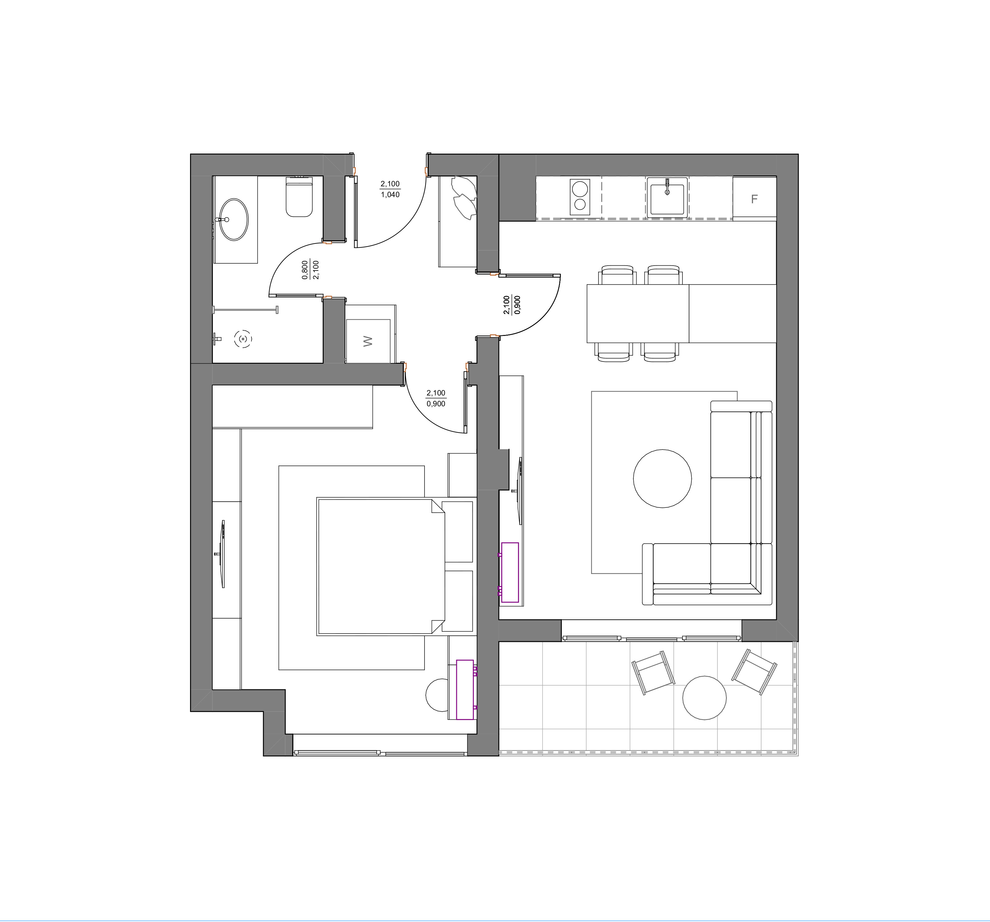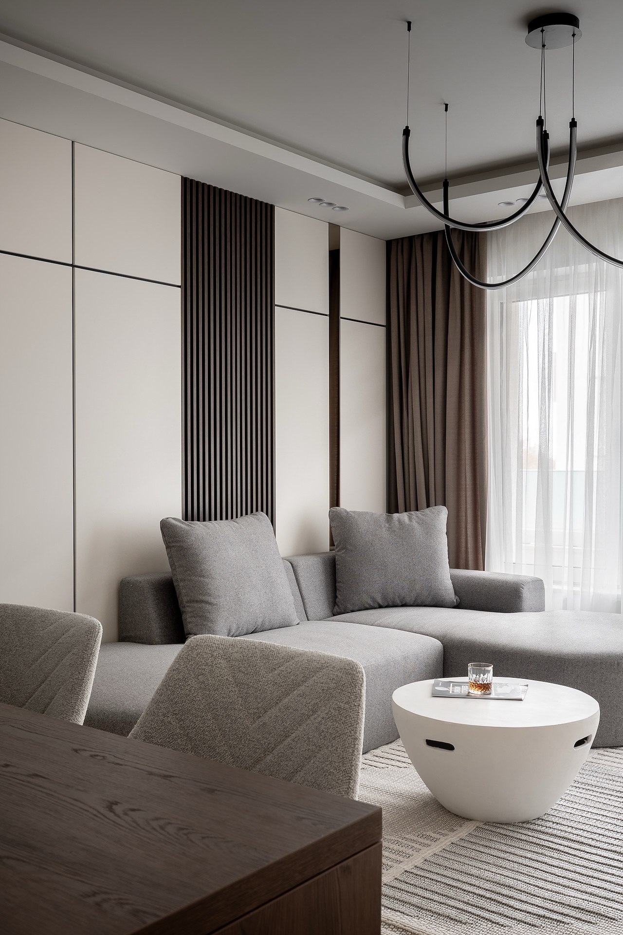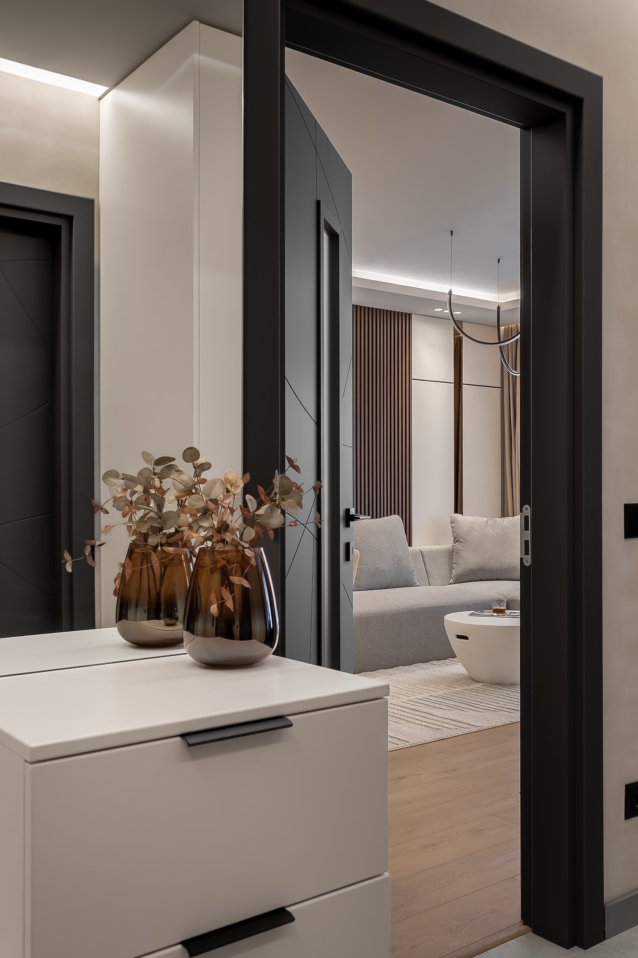 Интериорът следва принципа за чисти визуални линии и спокойна атмосфера. Всяко решение в него служи на реалните навици на домакина и прави жилището функционално, приятно и ясно дефинирано като личен стил и характер — модерен дом за съвременен джентълмен.