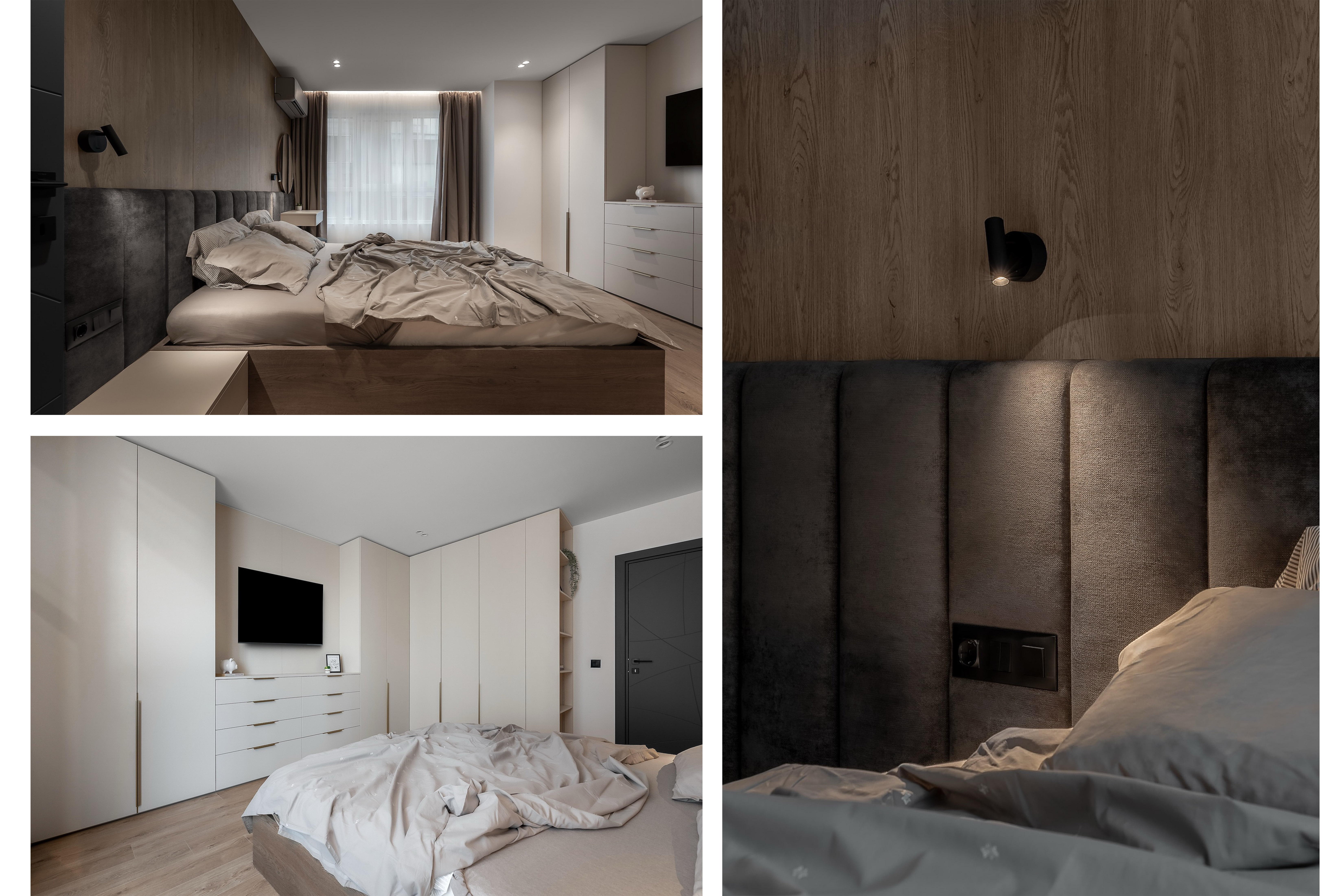 Едно от ключовите функционални решения е максималното оползотворяване на площта: корпусната мебел е разработена така, че да осигури достатъчно и дискретно пространство за съхранение, а всяка зона е ясно дефинирана и подчинена на ежедневния комфорт, без да натоварва визуално интериора.
