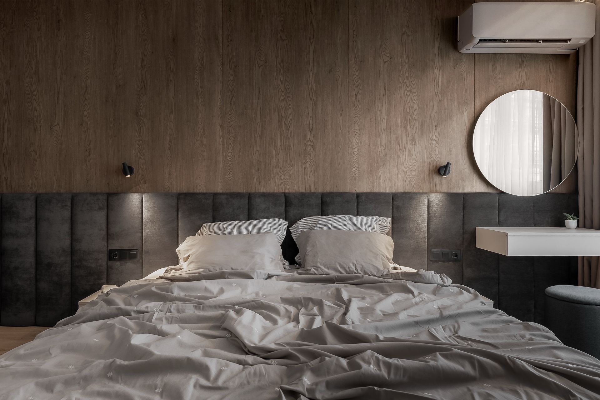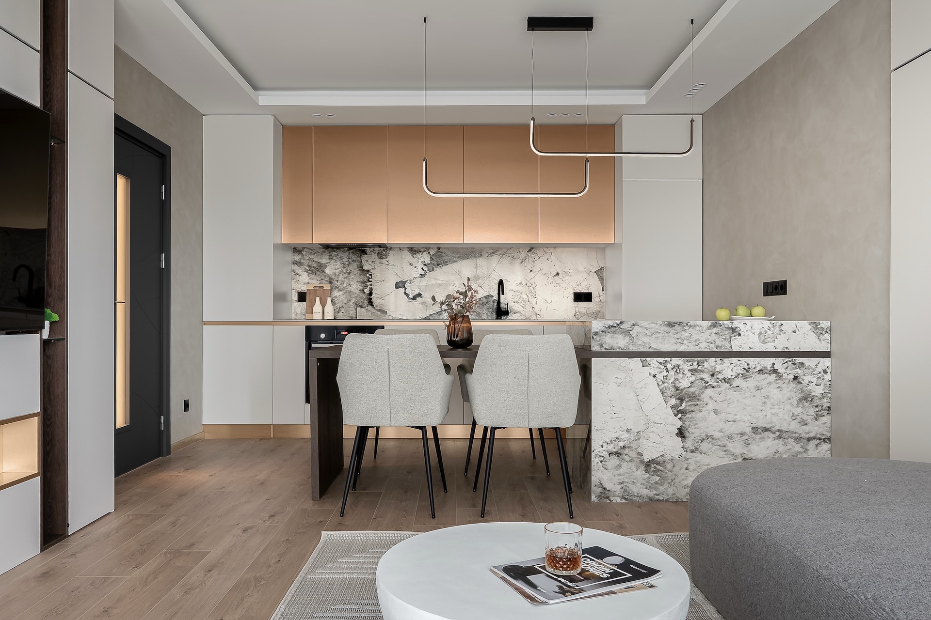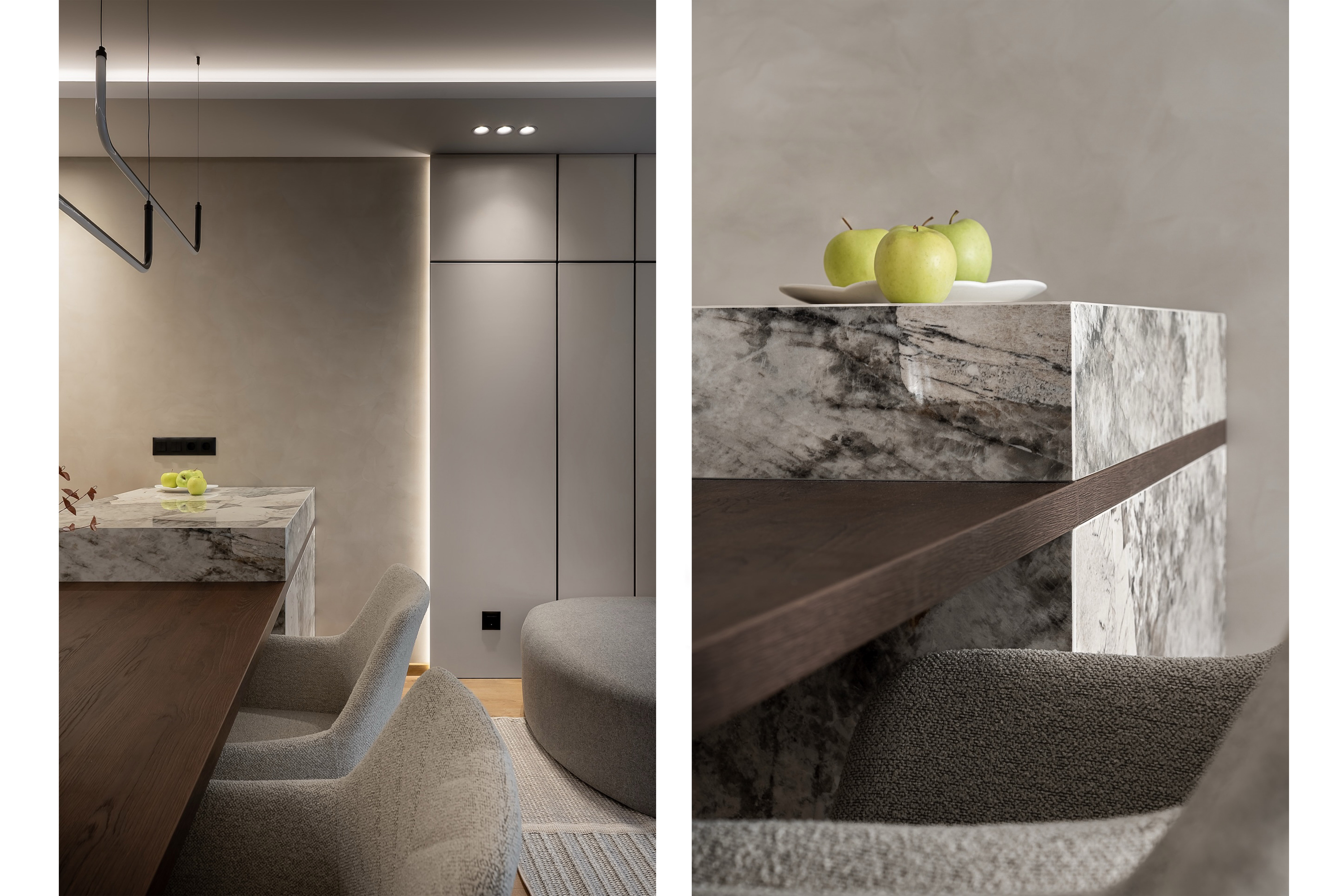 To meet a budget-friendly framework, high-quality textured MFC is used throughout, complemented by ceramic finishes with a stone-like appearance for durability and easy maintenance. The soft seating is upholstered in a textured fabric that reinforces the intentionally masculine, “gentleman’s” aesthetic — slightly raw, yet comfortable and stylish. Concealed LED lighting, wall paneling and decorative plasters give depth and dimension without visually overloading the space.