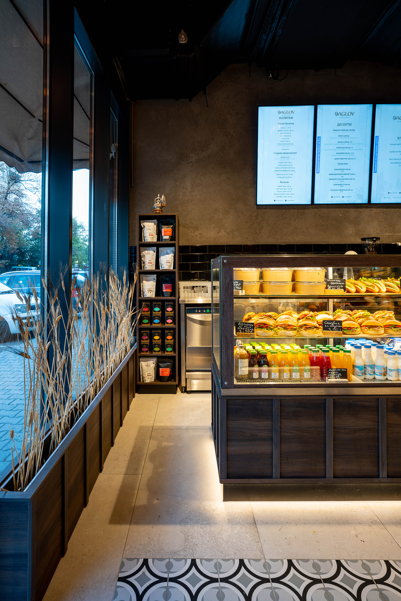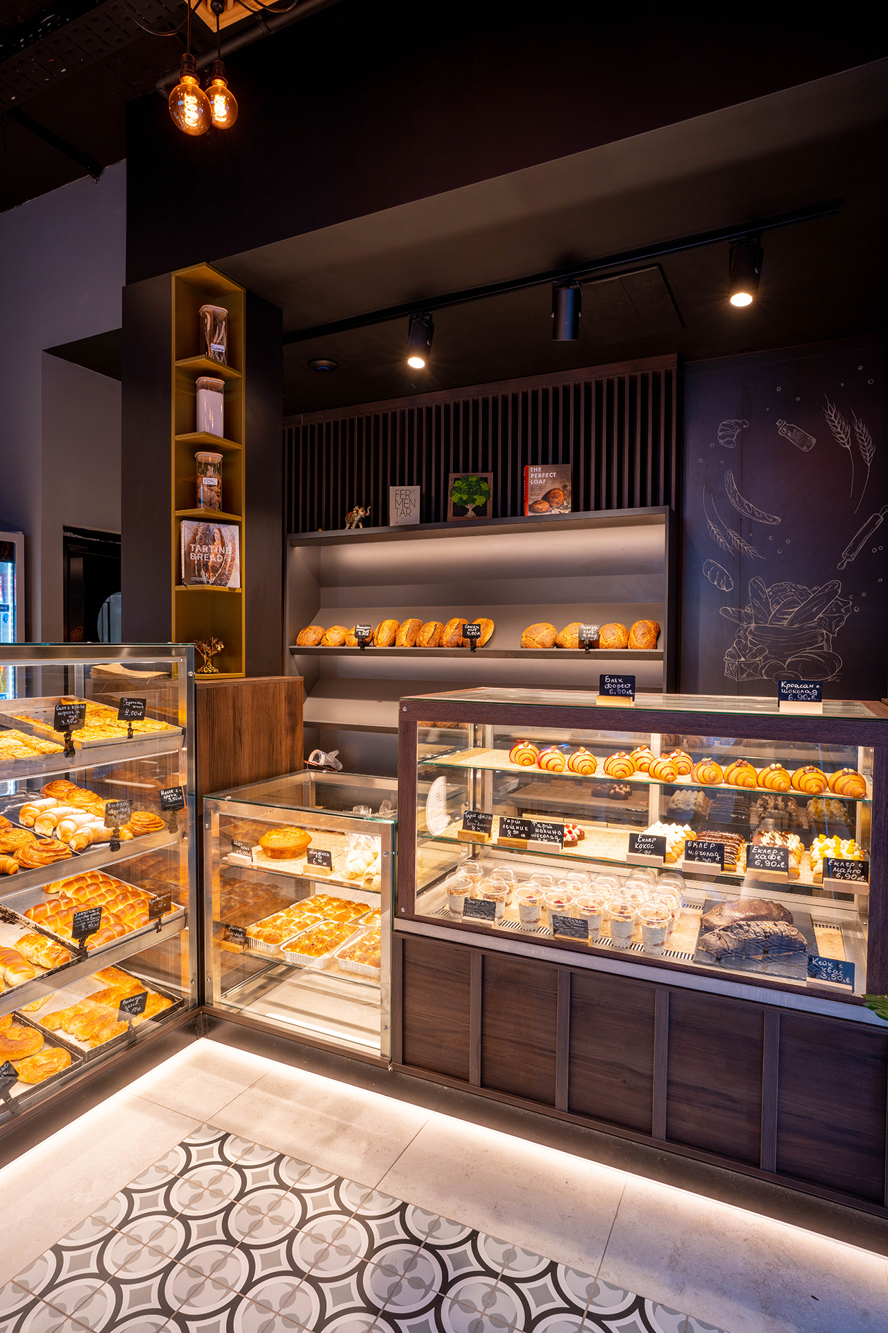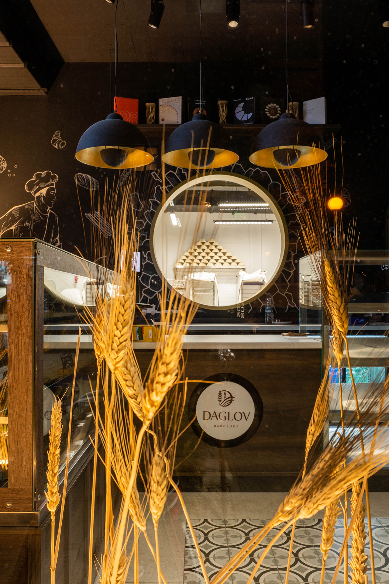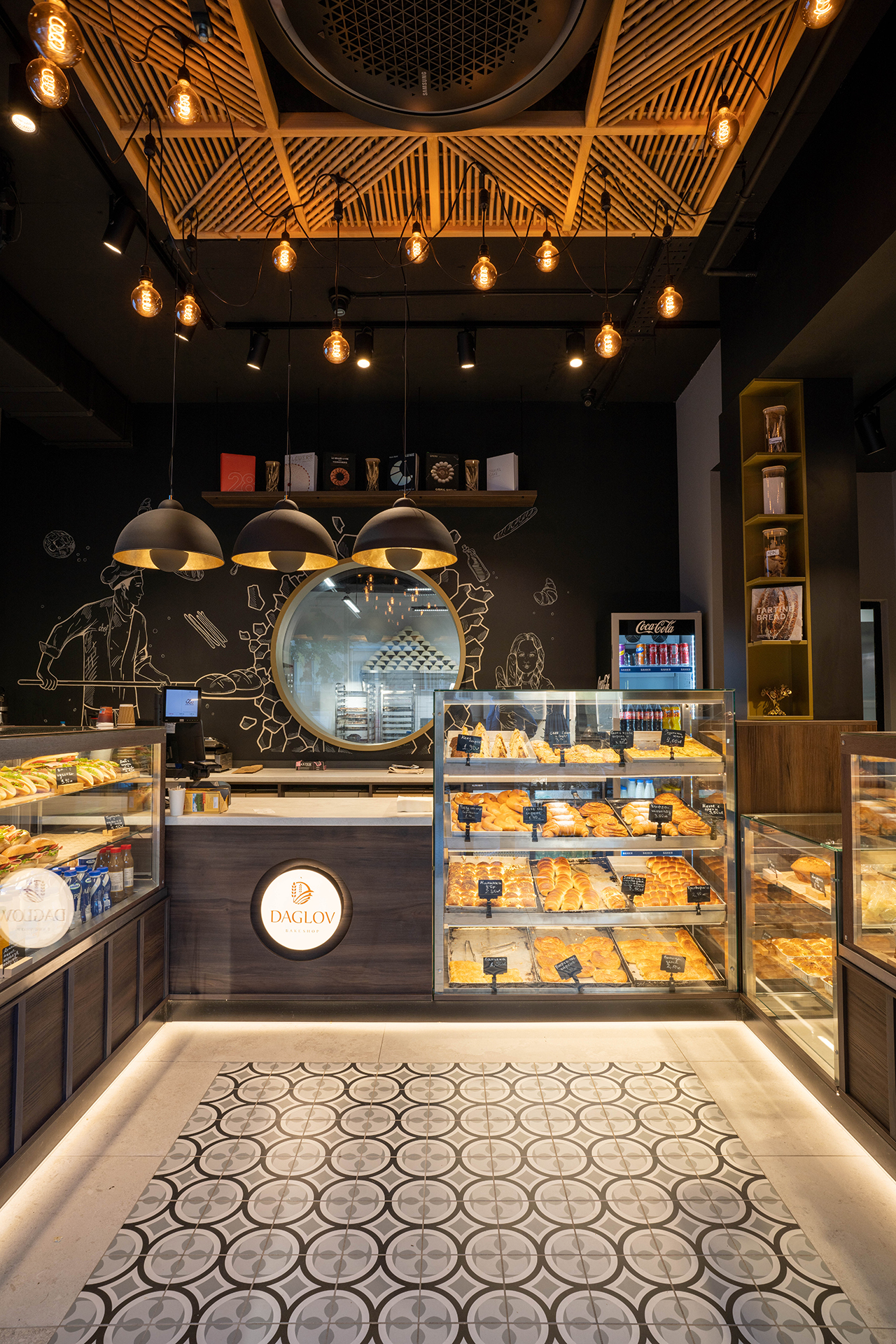 В този проект уловихме традицията и дългогодишния семеен опит на пекарите, като създадохме пространство, което подчертава както историята, така и самите печива. Използвахме тъмна основа – черни стени, тавани и тъмно дърво – като фон, върху който изпъкват естествени материали и детайли, вдъхновени от Родопите и българските корени. Мотивите в плочките, бронзовите акценти в лампите, нажежаемите крушки, декоративната пшеница и плетът от бамбук на тавана допринасят за усещане за автентичност.