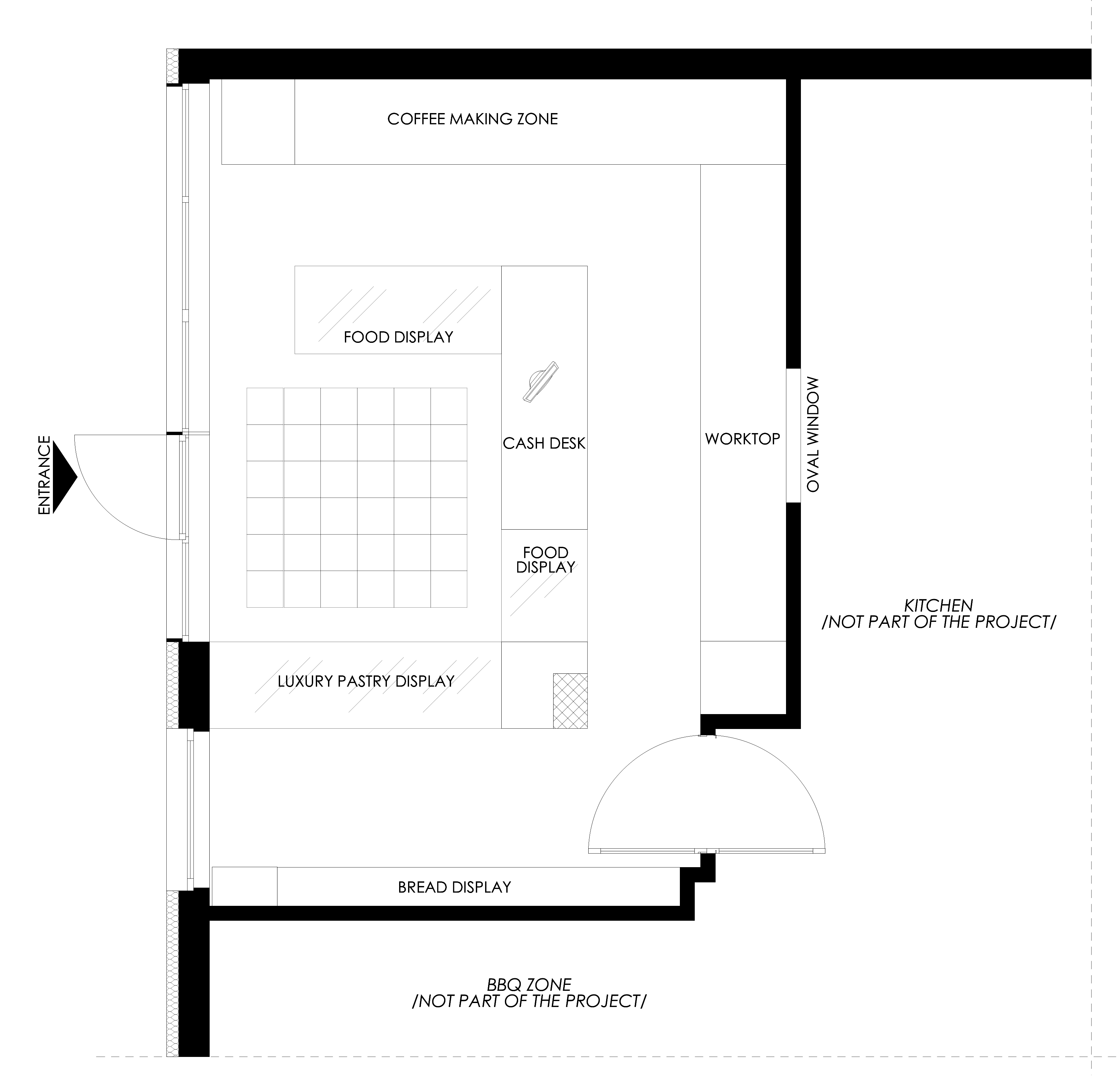 Печивата са основният акцент в търговската зона. Ключов момент е стената зад касата – символ на връзката между клиент и пекар. Кръгъл отвор с прозорец разкрива поглед към кухнята, а около него художник изобрази самия пекар в процес на работа. Проектът вплита история и традиция във всеки детайл.