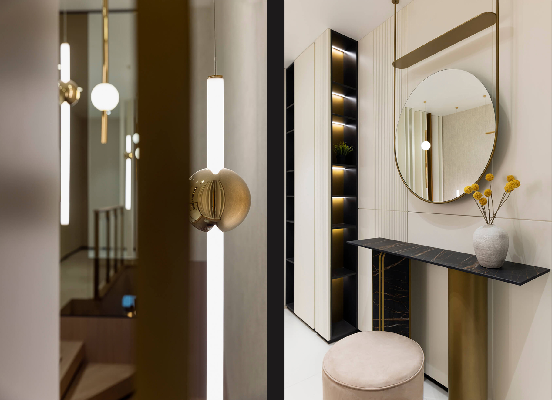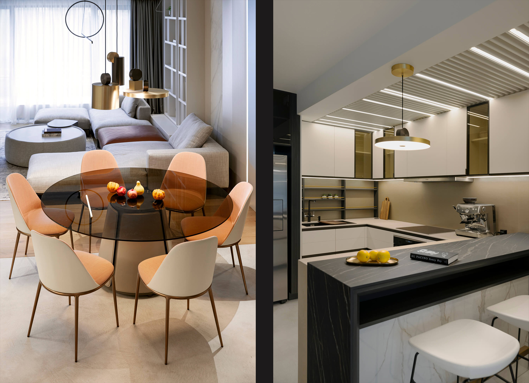 Комбинацията от тапети с различни текстури, циментобетонът по таваните и пода, акцентното осветление, мекото дърво и металните елементи присъстват във всички помещения и създават интериор, който е едновременно модерен и хармоничен.