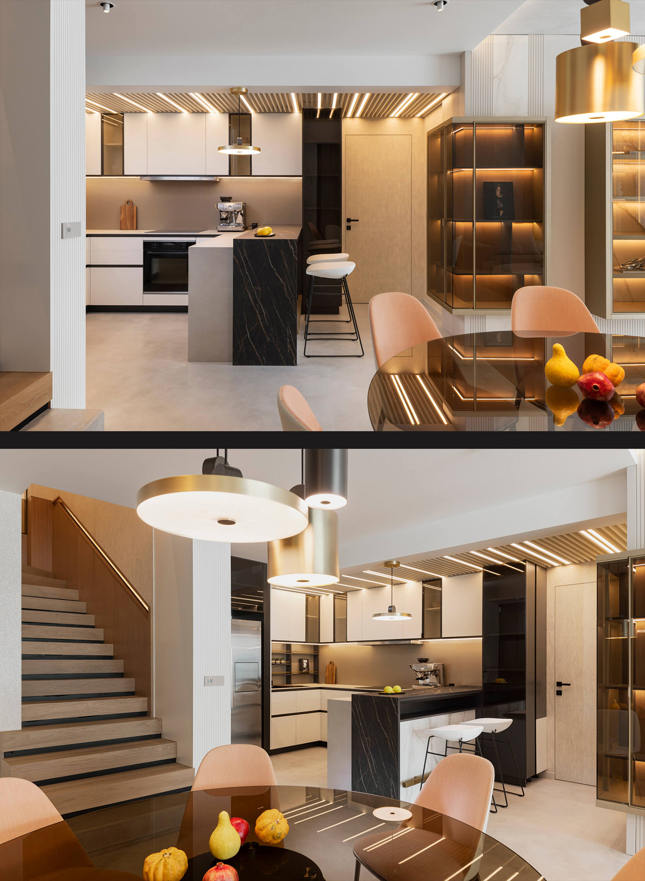 This spacious maisonette impresses with carefully selected materials and textures that shape a distinctive and stylish interior with its own identity. It features both furniture from established Italian brands and custom-designed elements tailored to the specific space.