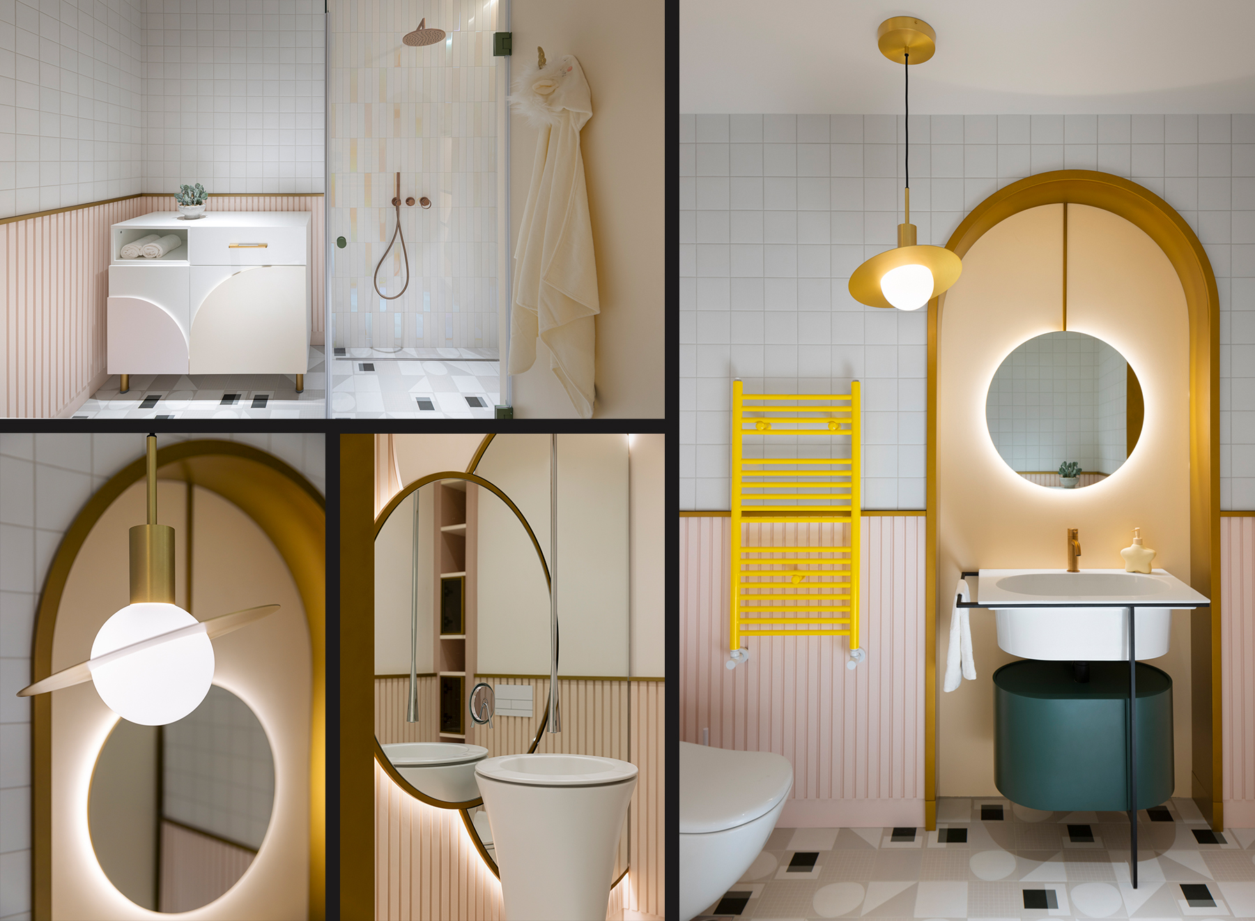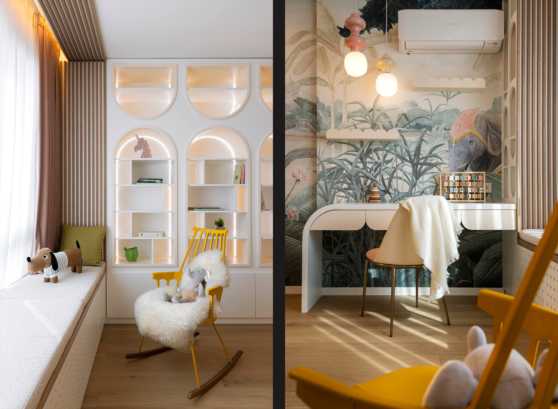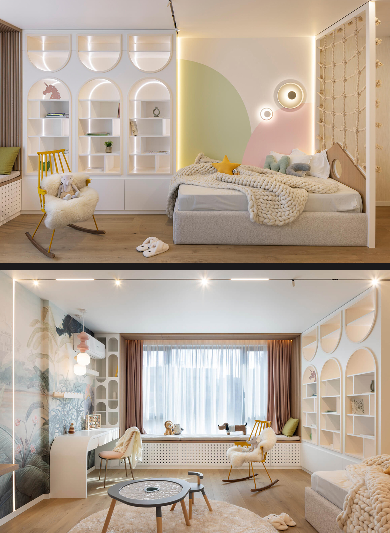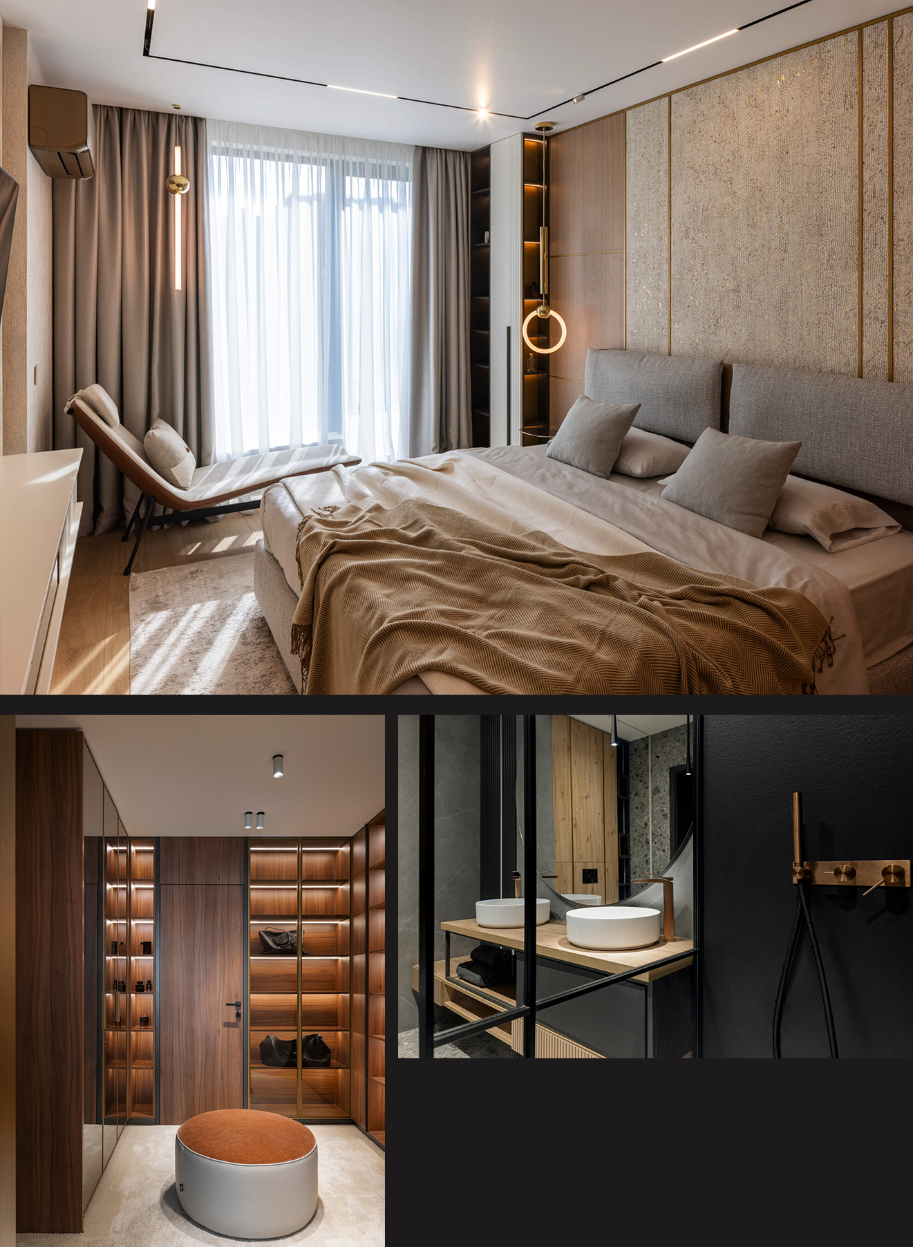 The combination of textured wallpapers, cement concrete on the ceilings and floors, accent lighting, warm wood, and metal details appears throughout all rooms, creating an interior that is both modern and harmonious.