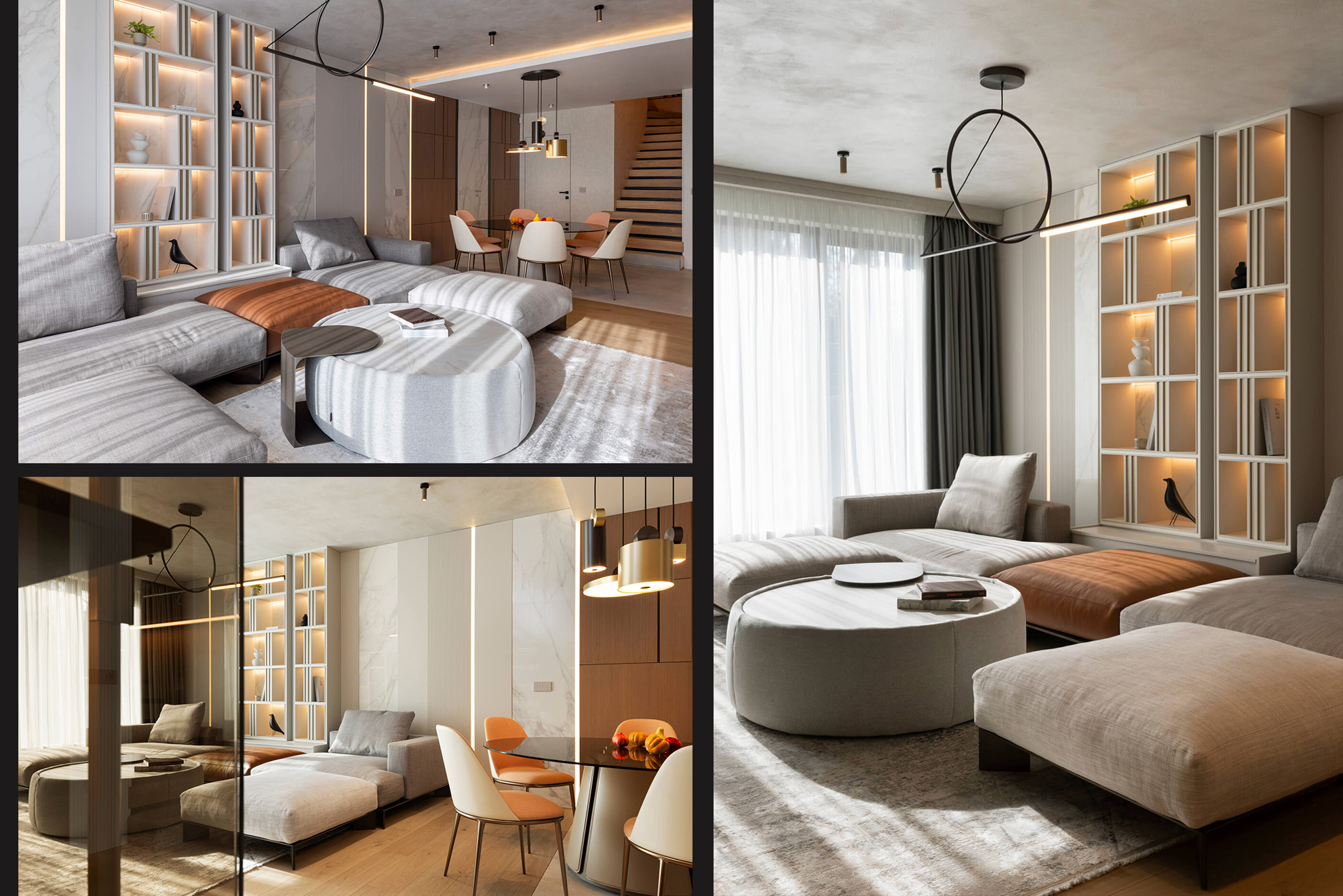 Този просторен мезонет впечатлява с внимателно подбрани материали и текстури, които оформят характерен и стилен интериор със собствена идентичност. Използвани са както мебели от утвърдени италиански брандове, така и специално проектирани елементи, съобразени с конкретното пространство.