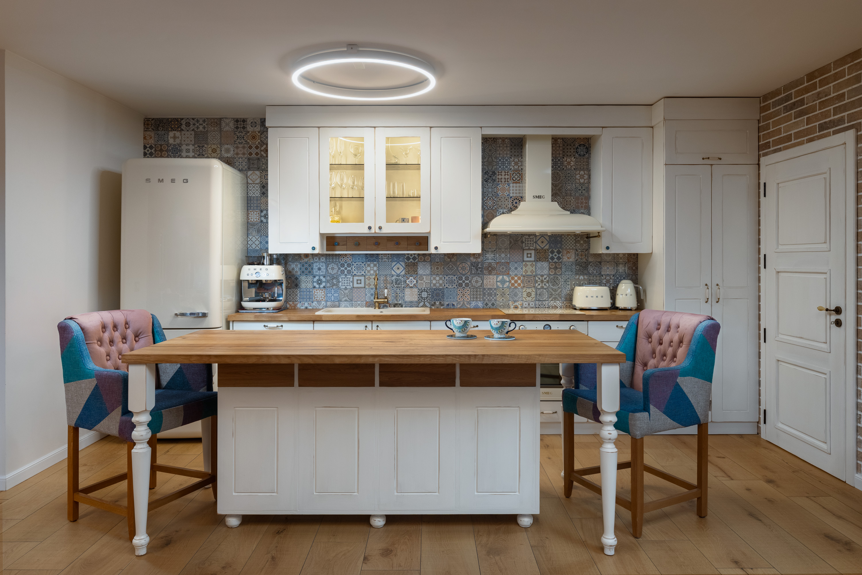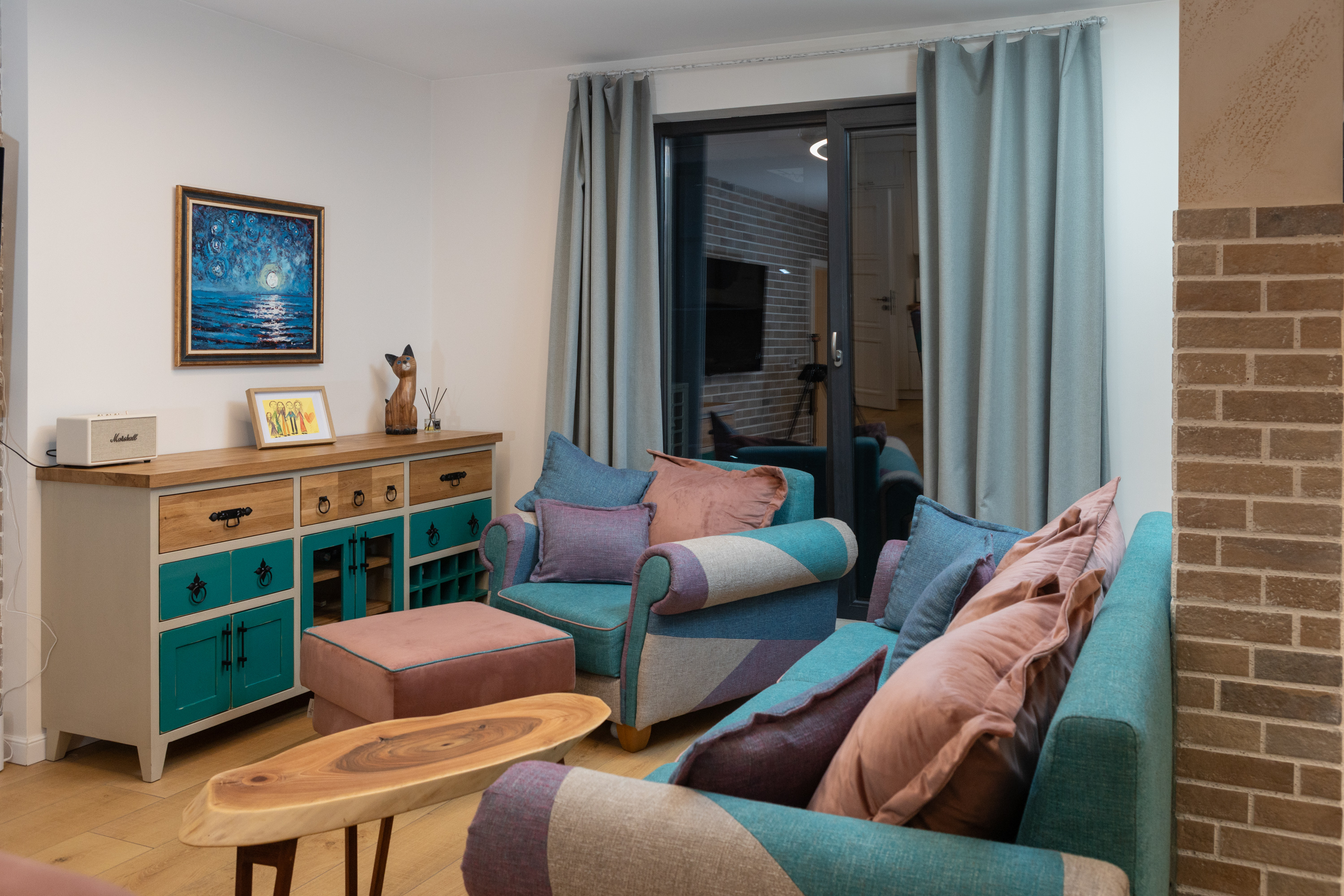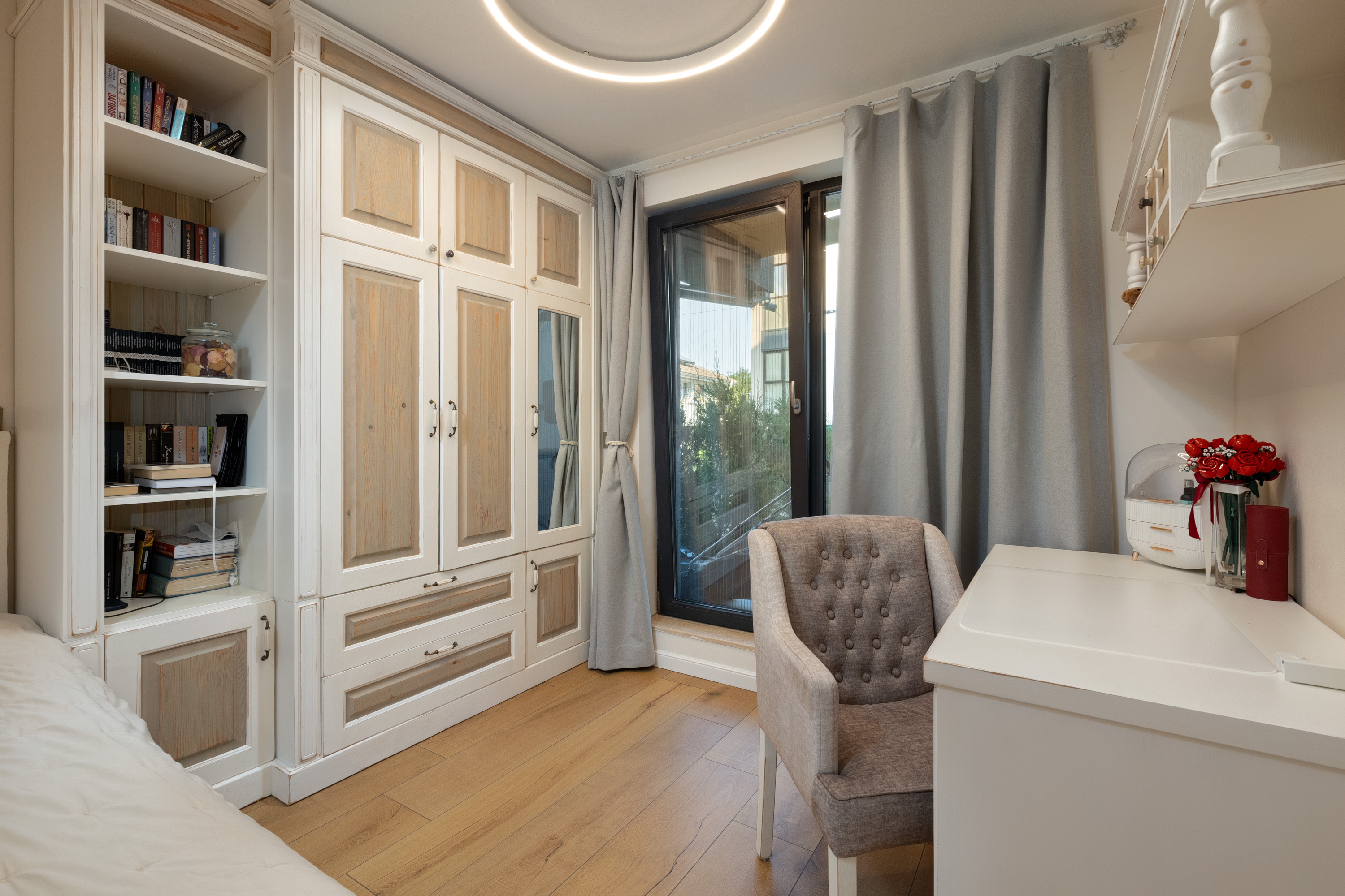 Апартаментът в полите на Витоша, разположен на приземен етаж с озеленен двор, създаващ усещане за простота, мир и спокойствие, присъщи на селото, беше напълно естествено да решим в Провансалски интериорен стил. Заложихме на по-груба мазилка и тухлени стени, естествено дъбово дюшеме за пода. Мебелите изработихме от естествена дървесина в бяло, пясъчно, кремаво.