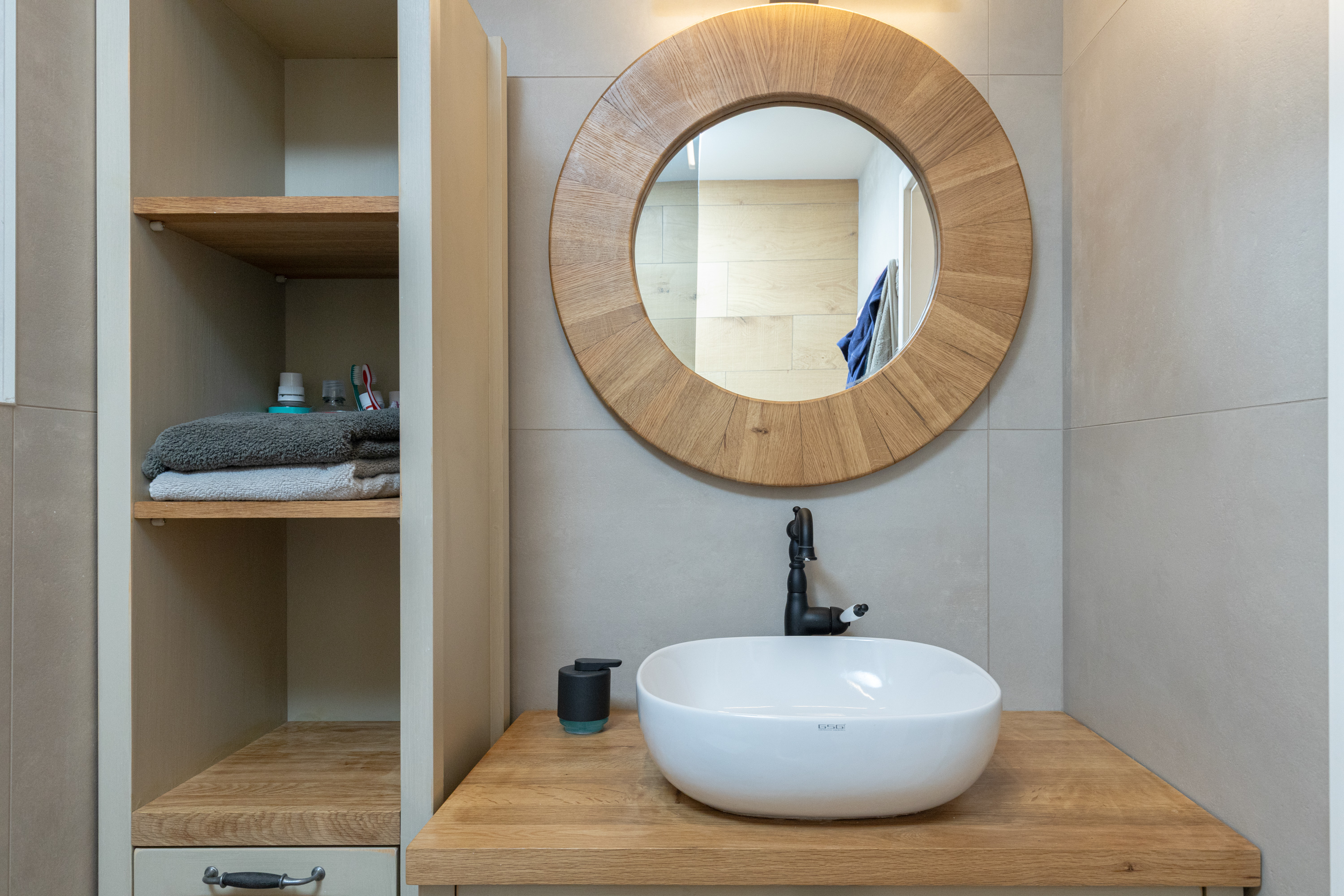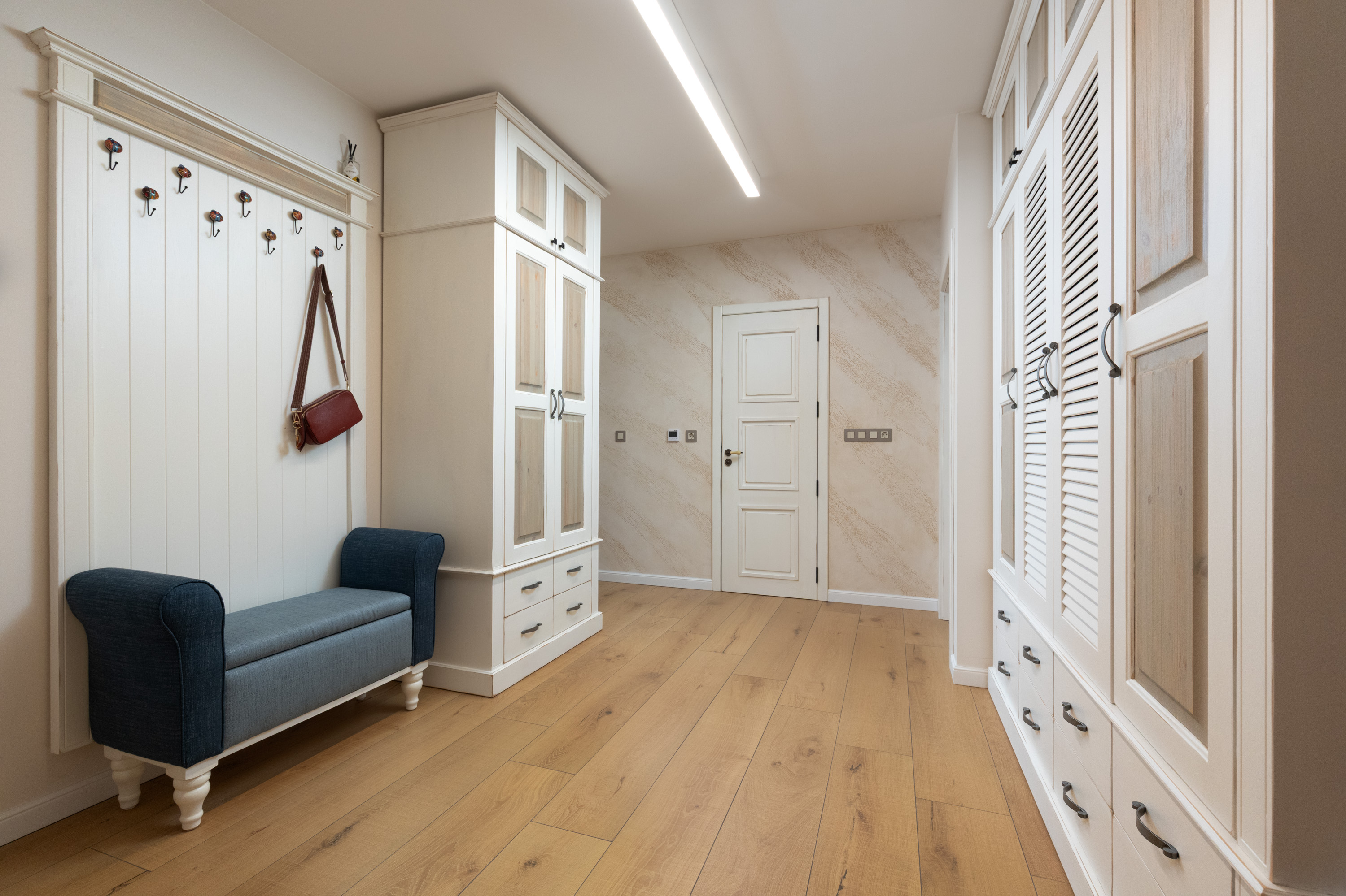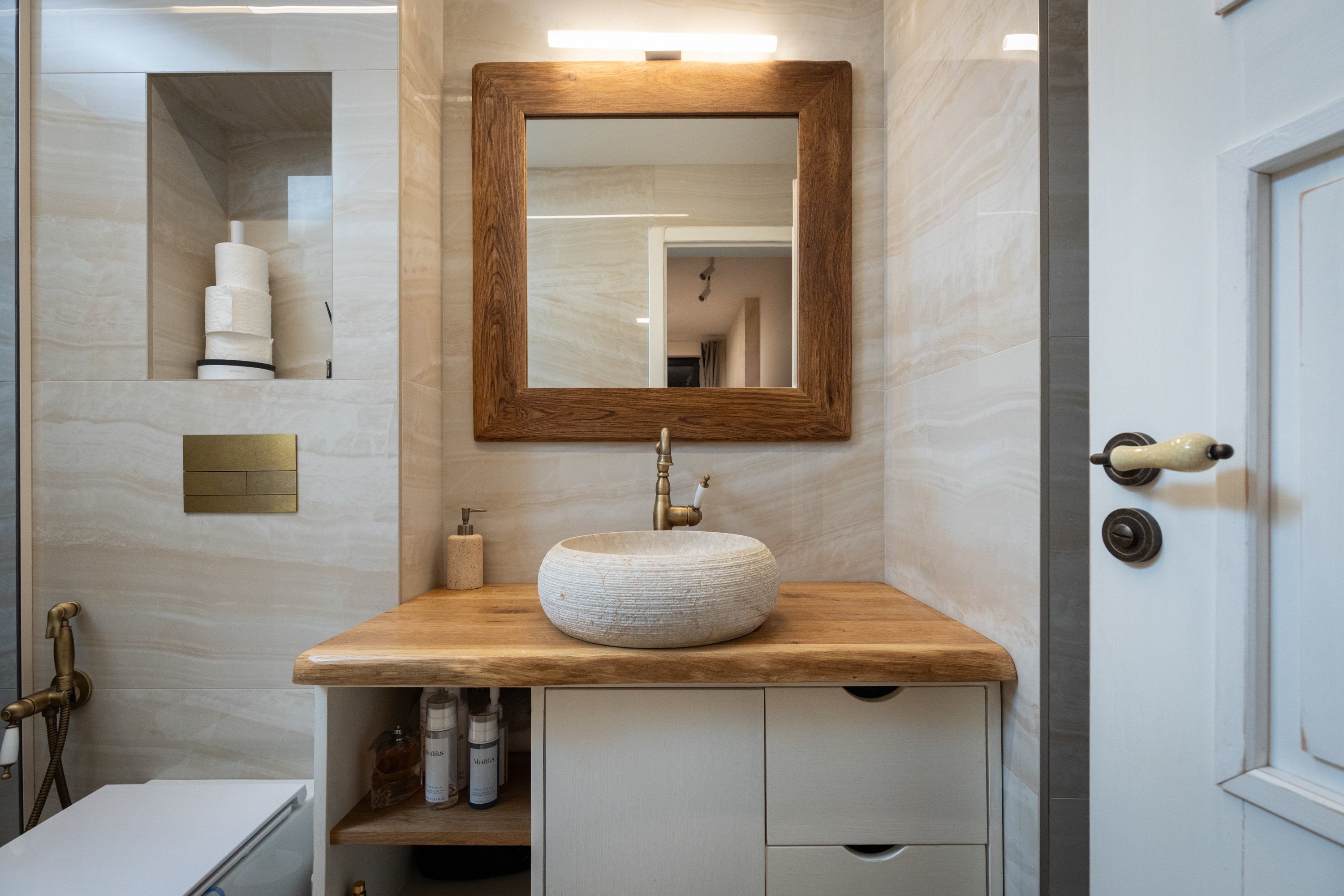 Апартаментът в полите на Витоша, разположен на приземен етаж с озеленен двор, създаващ усещане за простота, мир и спокойствие, присъщи на селото, беше напълно естествено да решим в Провансалски интериорен стил. Заложихме на по-груба мазилка и тухлени стени, естествено дъбово дюшеме за пода. Мебелите изработихме от естествена дървесина в бяло, пясъчно, кремаво.