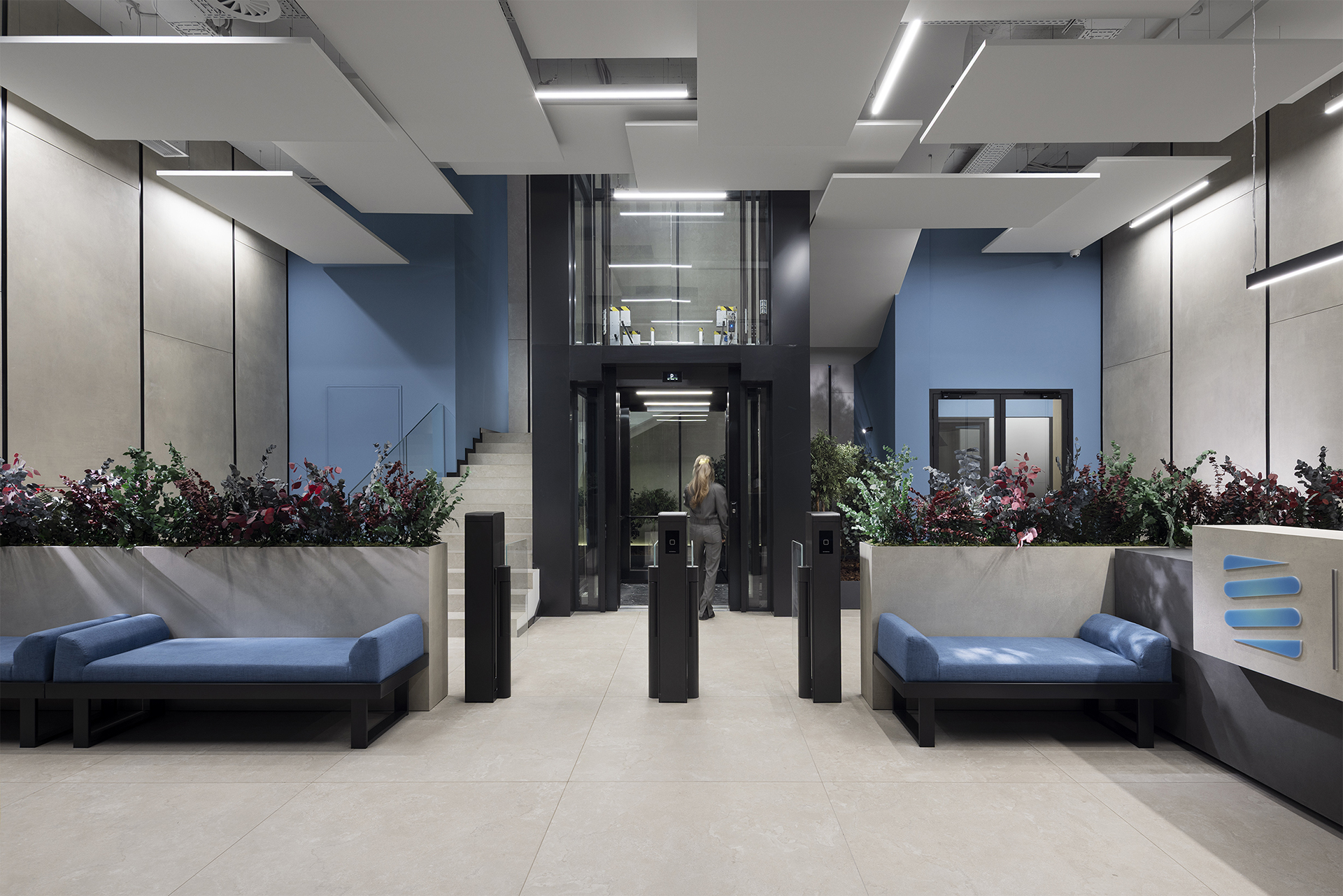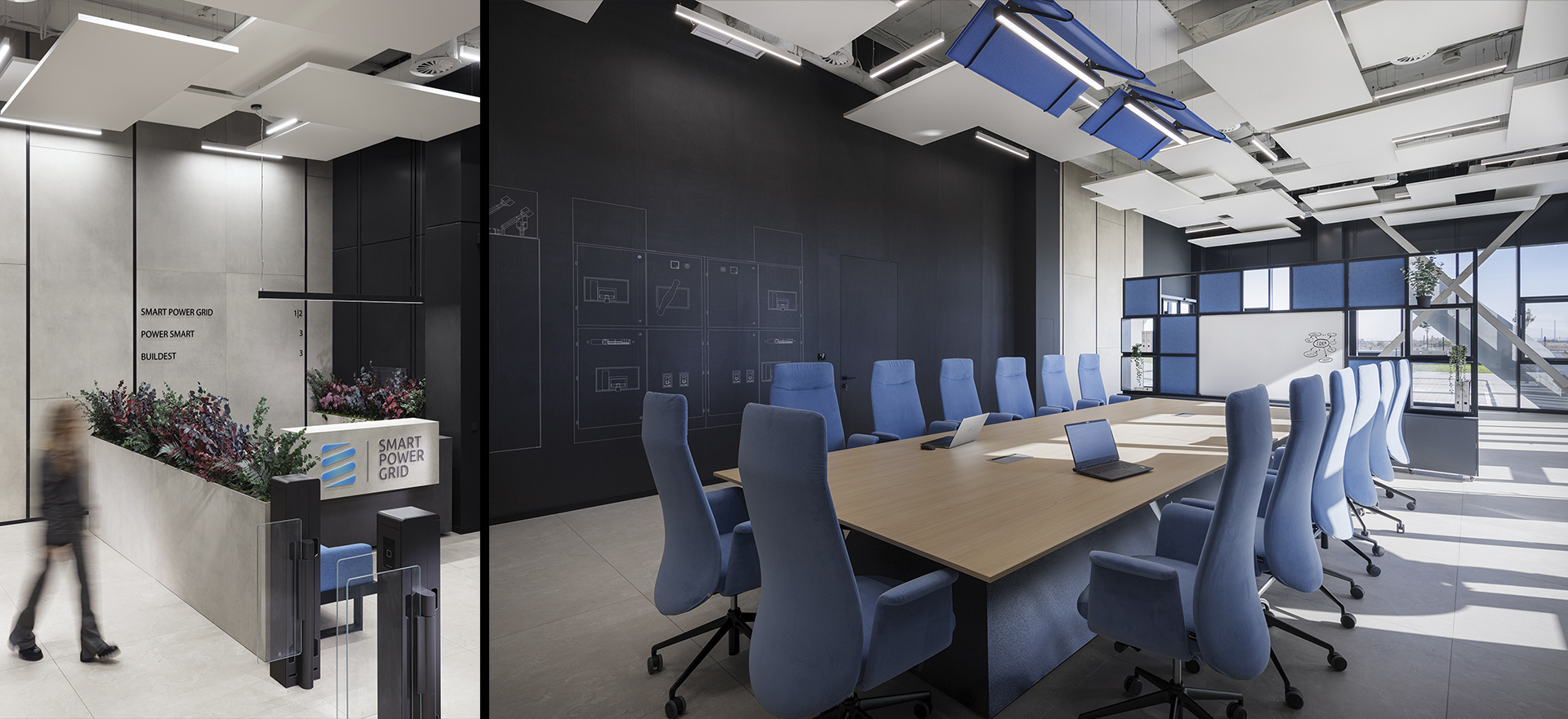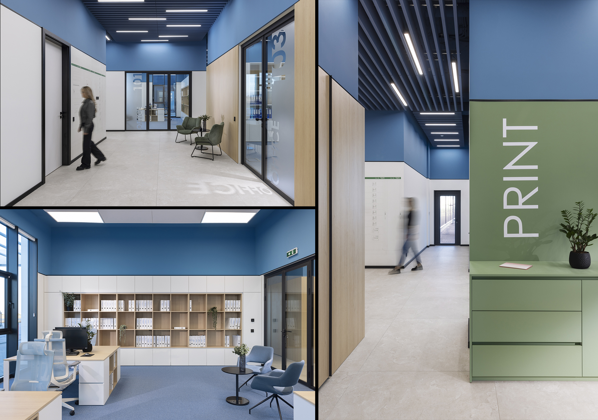 The interior project of the administrative building serving an electrical equipment manufacturing facility in Plovdiv covers a total area of 2,000 sq.m., of which 500 sq.m. are office spaces located within the production hall. The work began during the shell construction phase, allowing us to optimize the architectural layout and, where possible, adapt the engineering systems to the interior design concept. The brief called for a cellular office layout with supporting spaces, including a conference room, dining and relaxation areas, as well as sanitary facilities on each level. The design approach focuses on modular and standardized solutions for each functional unit, while ensuring the required level of acoustic comfort. A key element of the design is the horizontal division of materials and colors, which unifies the visual identity of all levels regardless of the differences in their heights. Visual techniques were employed to emphasize corporate colors and graphic elements related to the activities of the tenant companies. The reception area is designed as a representative space, highlighting the architectural characteristics of the zone, with a strong corporate identity and integrated greenery in the form of preserved natural plants. Ceiling design posed a major challenge due to structural and architectural differences between the levels. In the production area, the precast reinforced concrete elements are intentionally left exposed and complemented with acoustic panels. The top floor, occupied by another company, follows a similar concept, adapted with new color accents and a ceiling solution that provides maximum clear height.