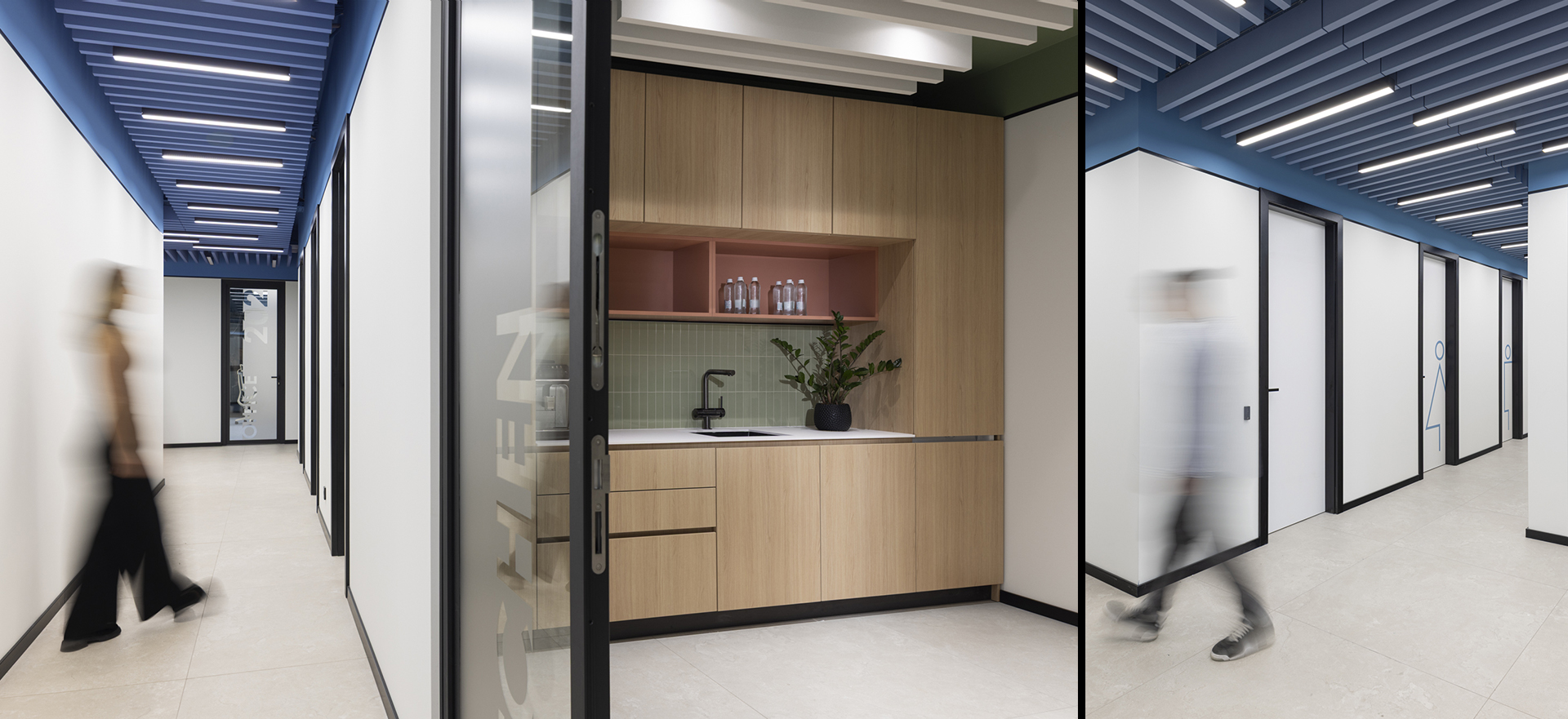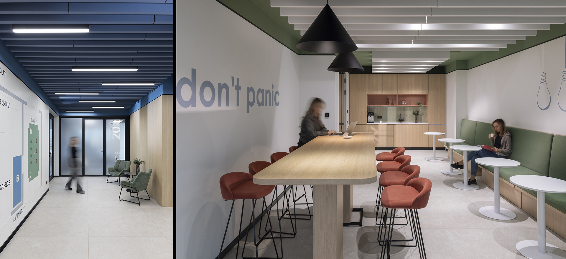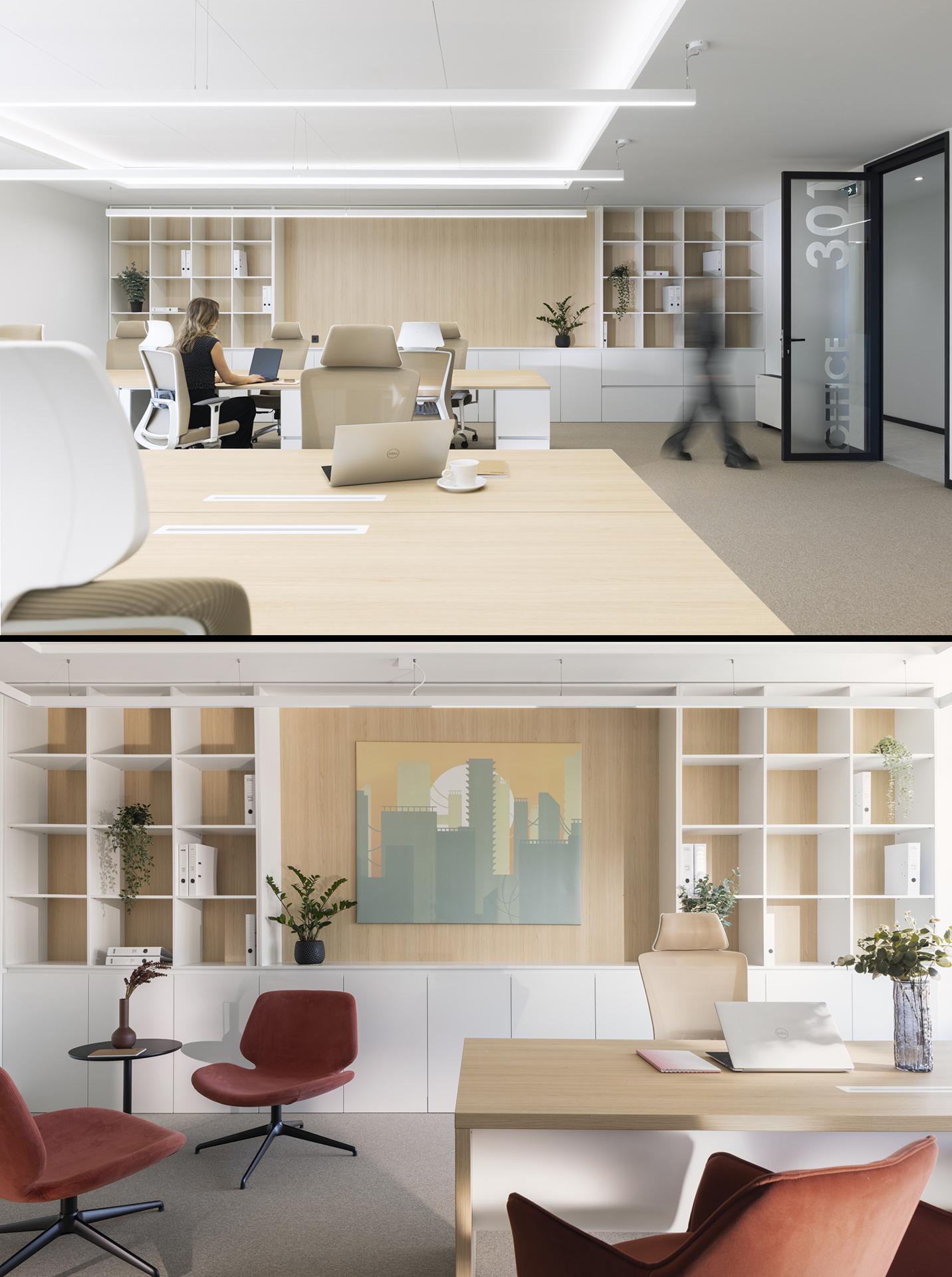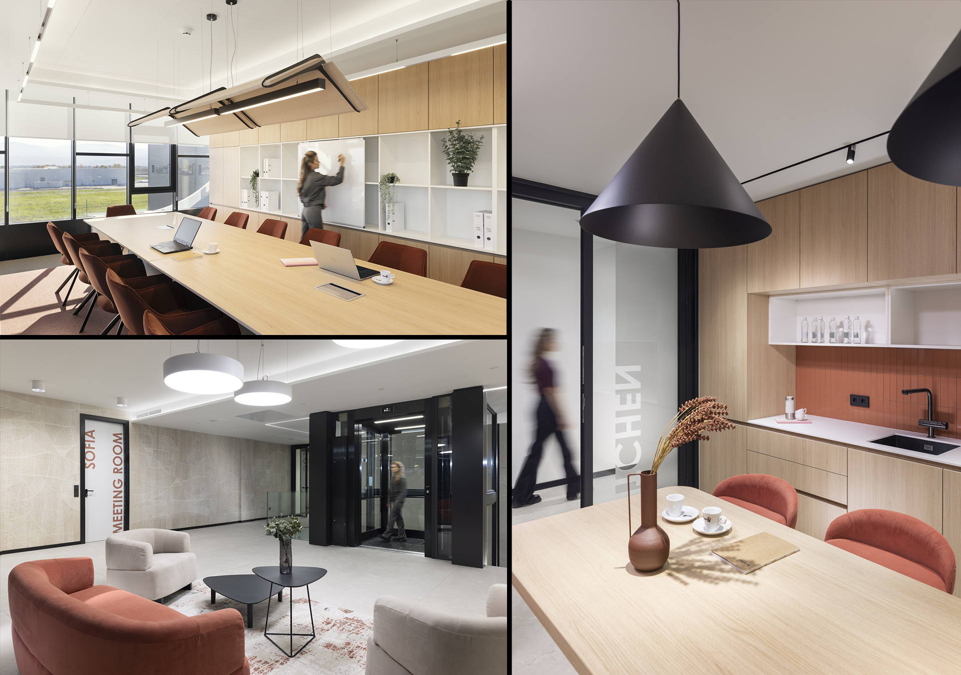 The interior project of the administrative building serving an electrical equipment manufacturing facility in Plovdiv covers a total area of 2,000 sq.m., of which 500 sq.m. are office spaces located within the production hall. The work began during the shell construction phase, allowing us to optimize the architectural layout and, where possible, adapt the engineering systems to the interior design concept. The brief called for a cellular office layout with supporting spaces, including a conference room, dining and relaxation areas, as well as sanitary facilities on each level. The design approach focuses on modular and standardized solutions for each functional unit, while ensuring the required level of acoustic comfort. A key element of the design is the horizontal division of materials and colors, which unifies the visual identity of all levels regardless of the differences in their heights. Visual techniques were employed to emphasize corporate colors and graphic elements related to the activities of the tenant companies. The reception area is designed as a representative space, highlighting the architectural characteristics of the zone, with a strong corporate identity and integrated greenery in the form of preserved natural plants. Ceiling design posed a major challenge due to structural and architectural differences between the levels. In the production area, the precast reinforced concrete elements are intentionally left exposed and complemented with acoustic panels. The top floor, occupied by another company, follows a similar concept, adapted with new color accents and a ceiling solution that provides maximum clear height.