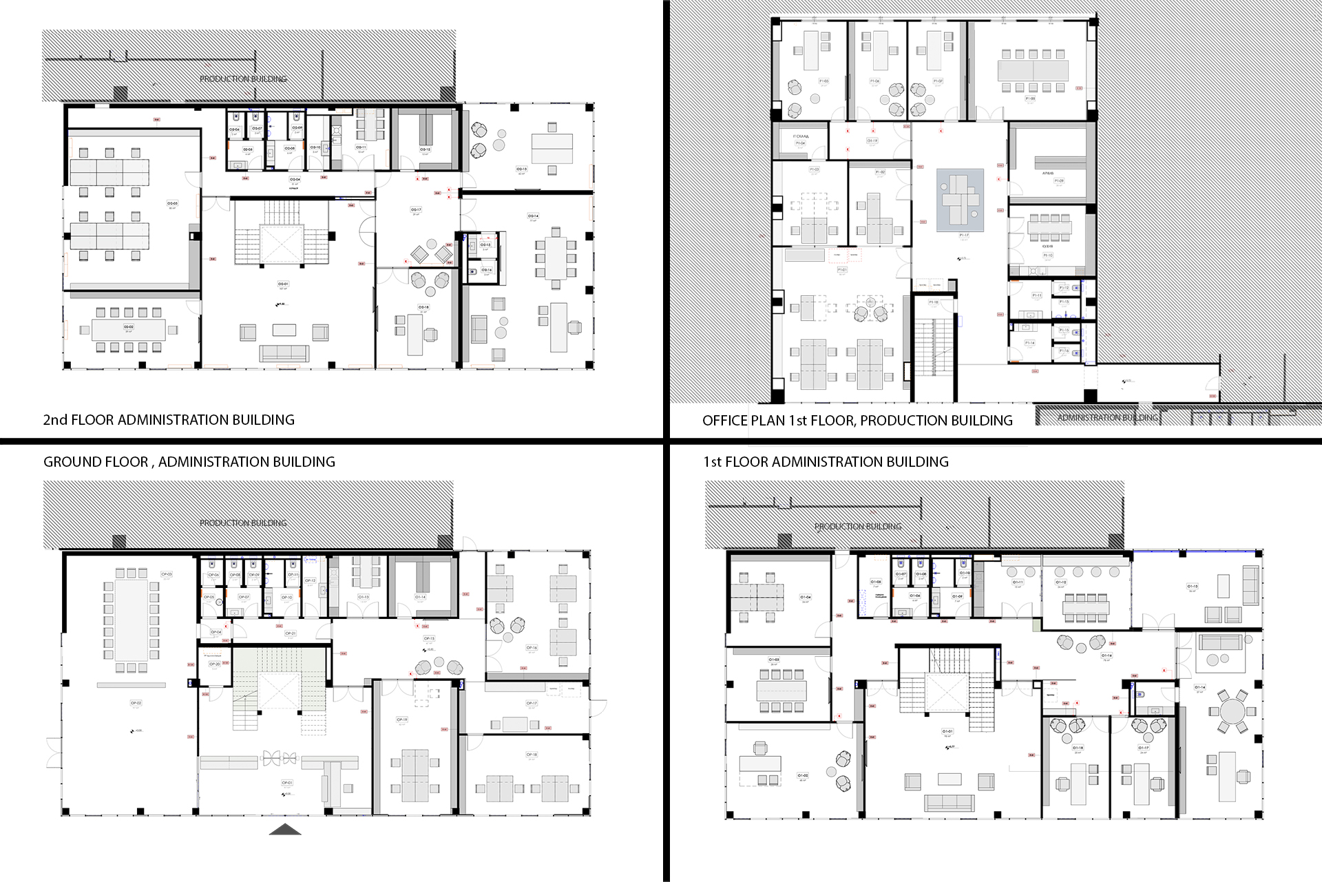 Интериорният проект на административната сграда към предприятие за производство на електроапаратура в гр. Пловдив обхваща площ от 2000 кв.м., като 500 кв.м. от тях са офисни пространства, разположени в производственото хале. Работата започна още във фаза груб строеж, което позволи да оптимизираме архитектурното разпределение и да адаптираме, до колкото е възможно, проектите на инженерните специалности спрямо интериорната концепция. Заданието предвиждаше кабинетен тип офисна система с прилежащи помещения – конферентна зала, зона за хранене и отдих, както и санитарни помещения на всяко ниво. Дизайнерският подход се фокусира върху модулни и типови решения за всяко функционално звено, като е осигурен и необходимият акустичен комфорт. Водещ елемент в дизайна е хоризонталното разделение на материали и цветове, което уеднаквява визията на всички нива, независимо от разликите във височините им. Използвани са визуални техники с акцент върху корпоративните цветове и графични елементи, свързани с дейността на фирмите ползватели. Рецепцията е оформена като представителна зона, с подчертани архитектурни дадености, силно изразена корпоративна идентичност и интегрирана зеленина от презервирани естествени растения. Таваните представляваха основно предизвикателство поради конструктивните и архитектурни различия между нивата. В производствената част целенасочено сглобяемите стоманобетонни елементи са оставени видими и допълнени с акустични панели. Последният етаж, използван от друга фирма, следва сходна концепция, адаптирана с нови цветови акценти и таванно решение, осигуряващо максимална светла височина.