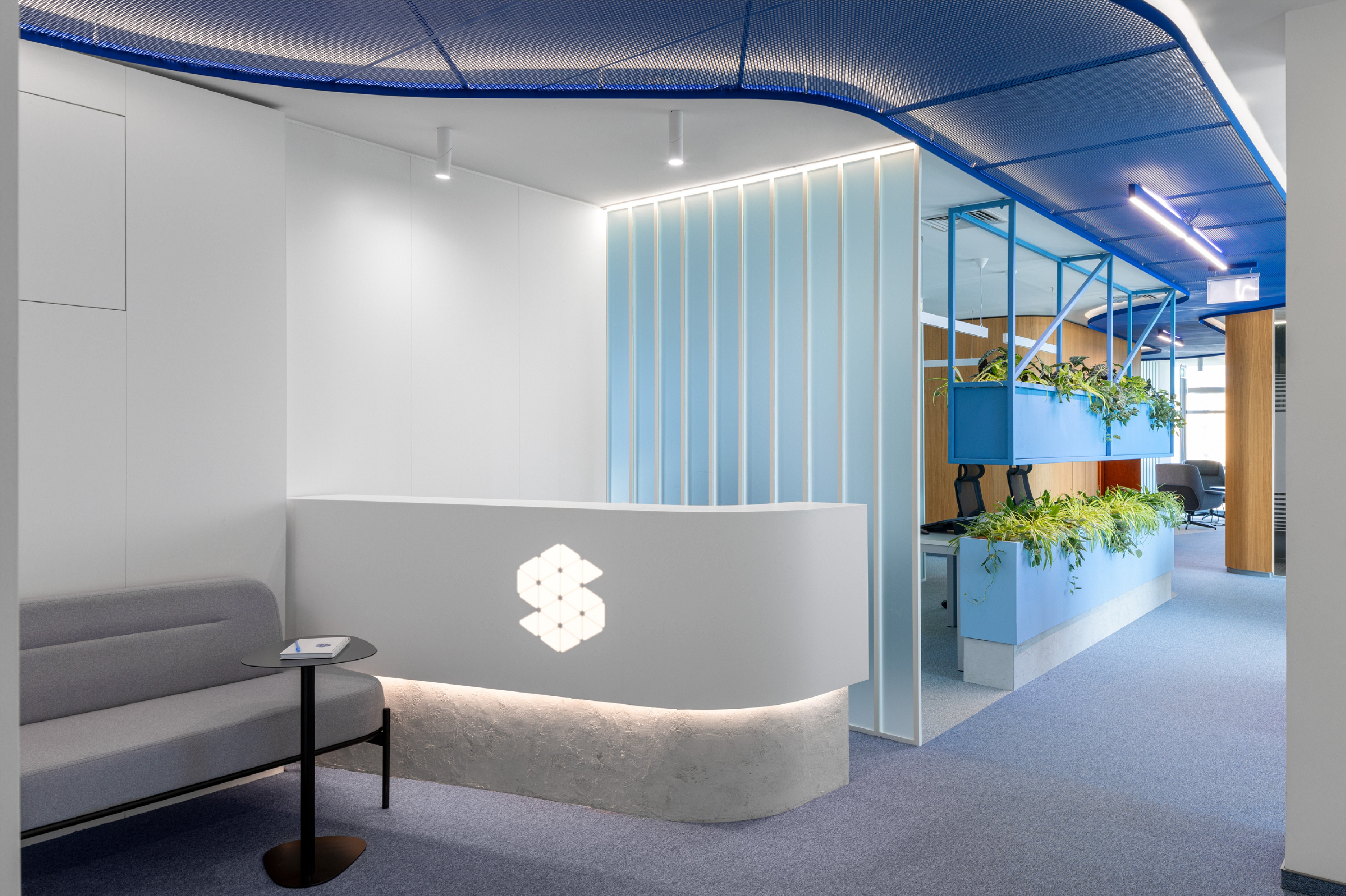 sheet, finished in Syscom’s characteristic blue. It organizes the space and acts as a visual