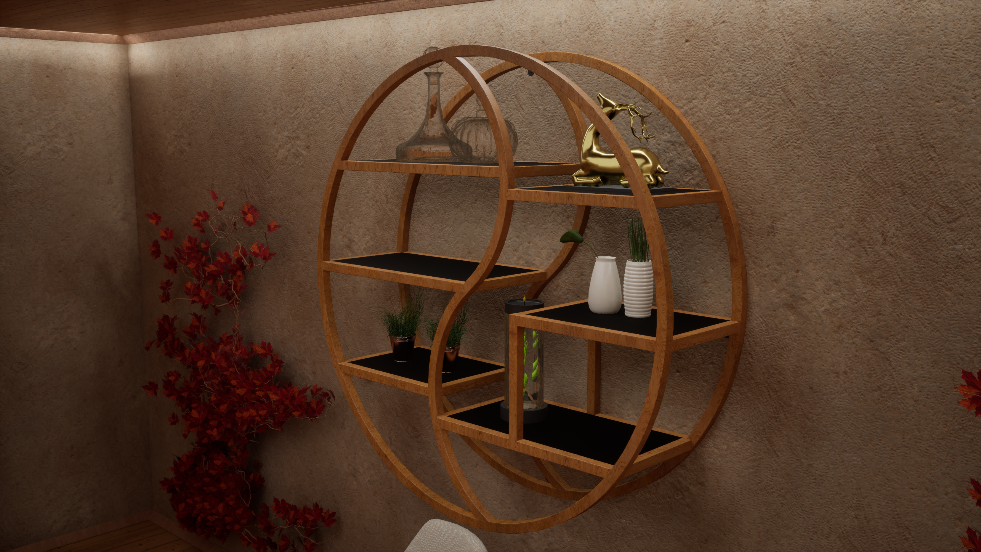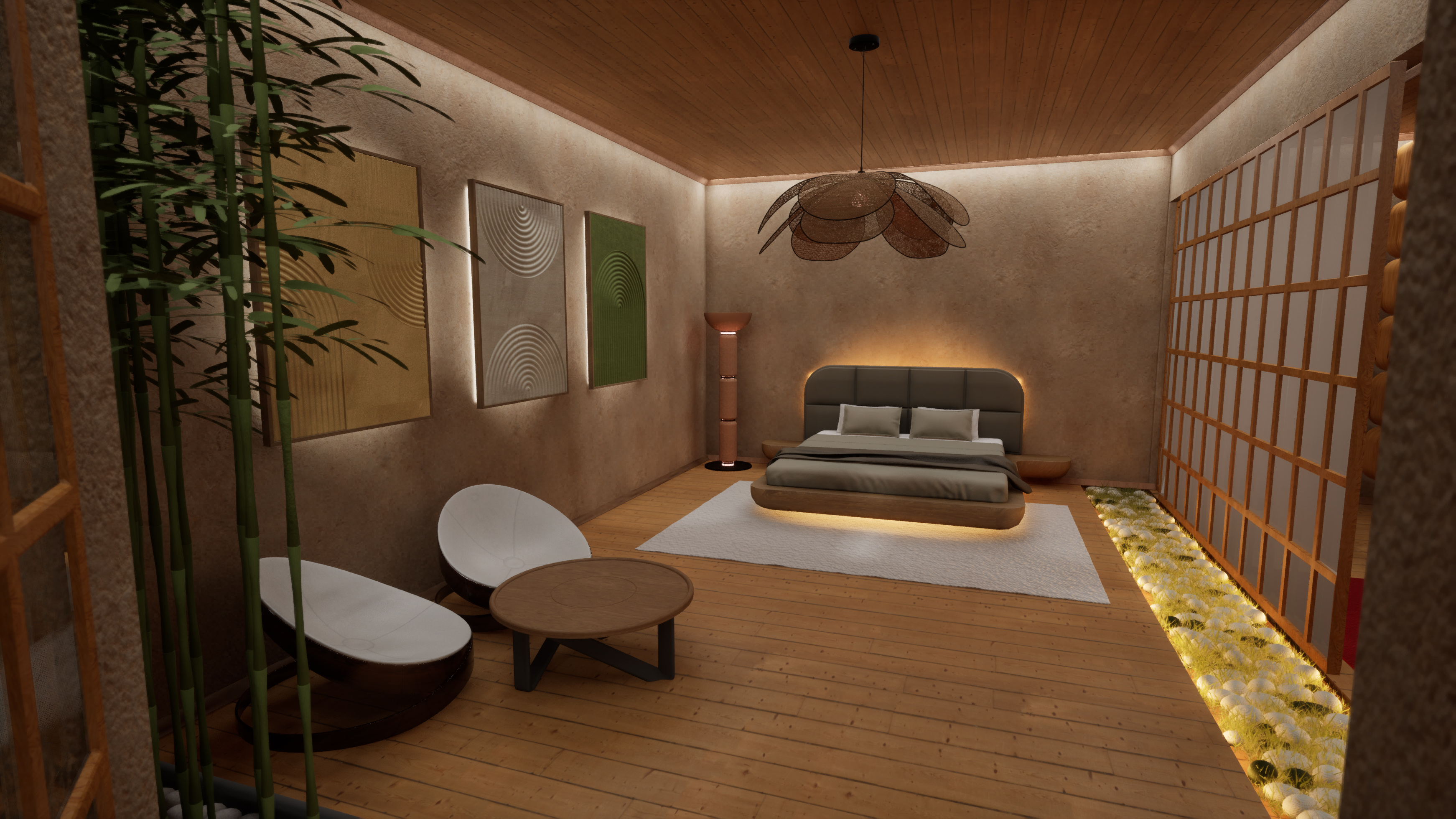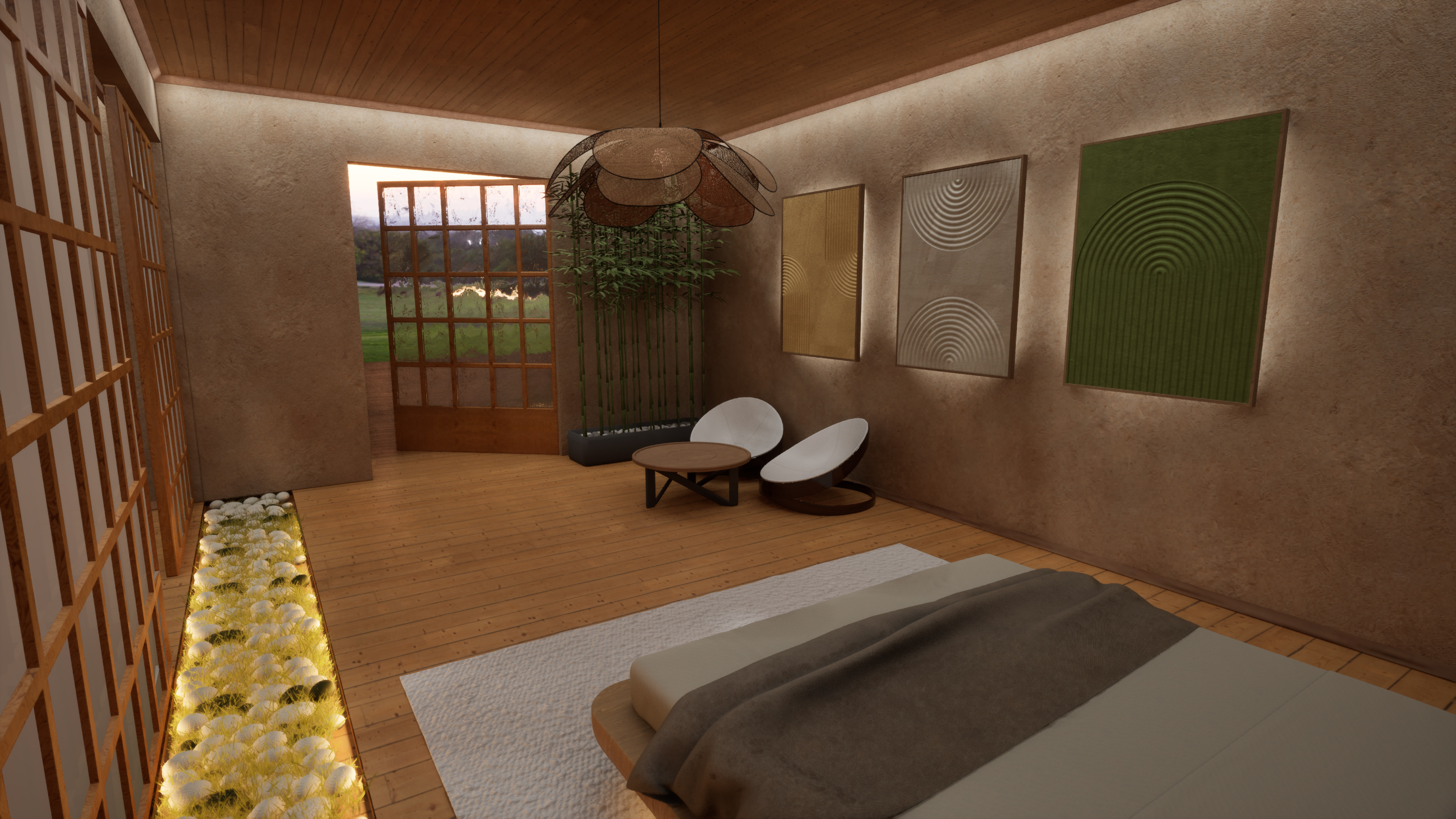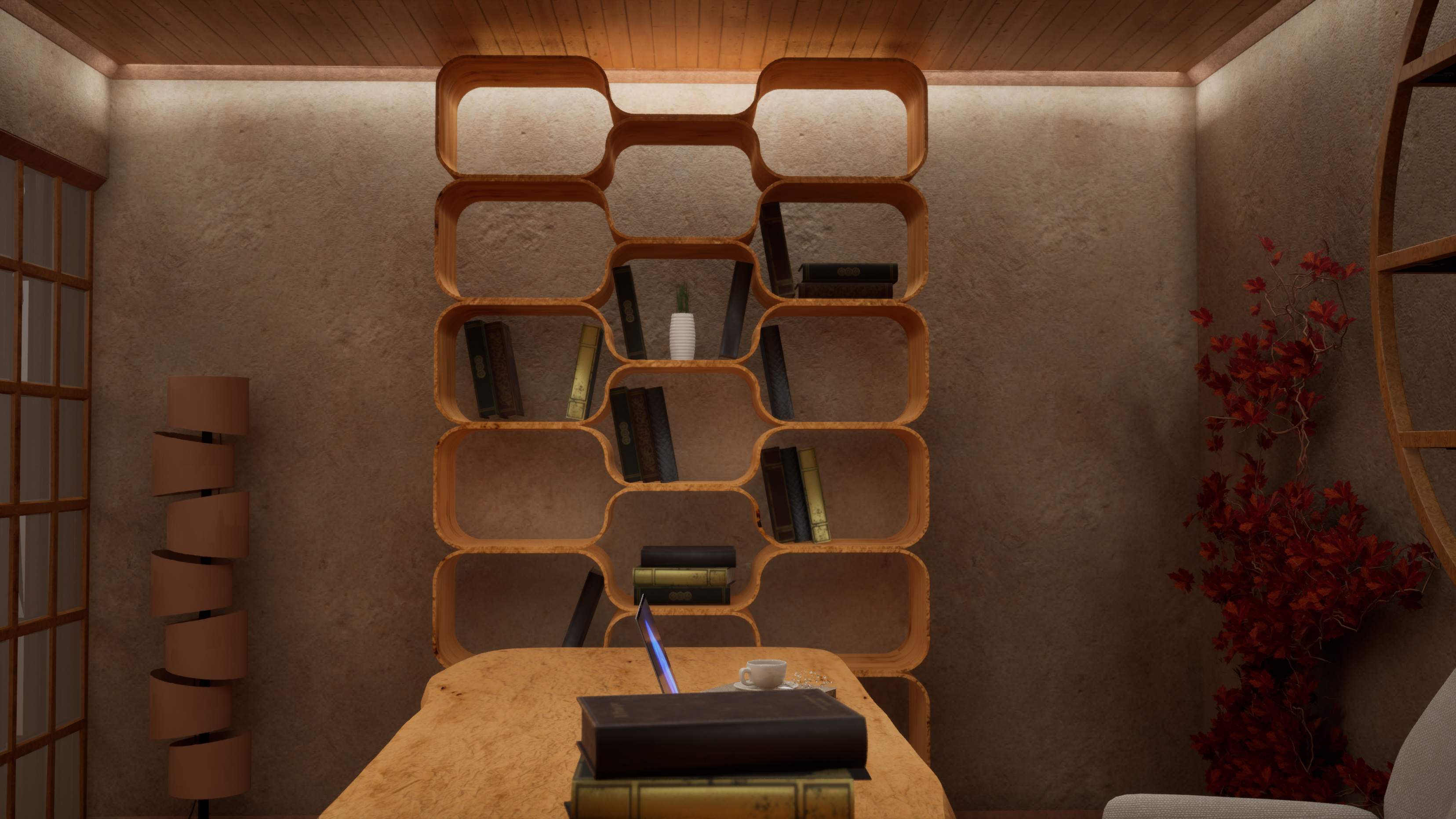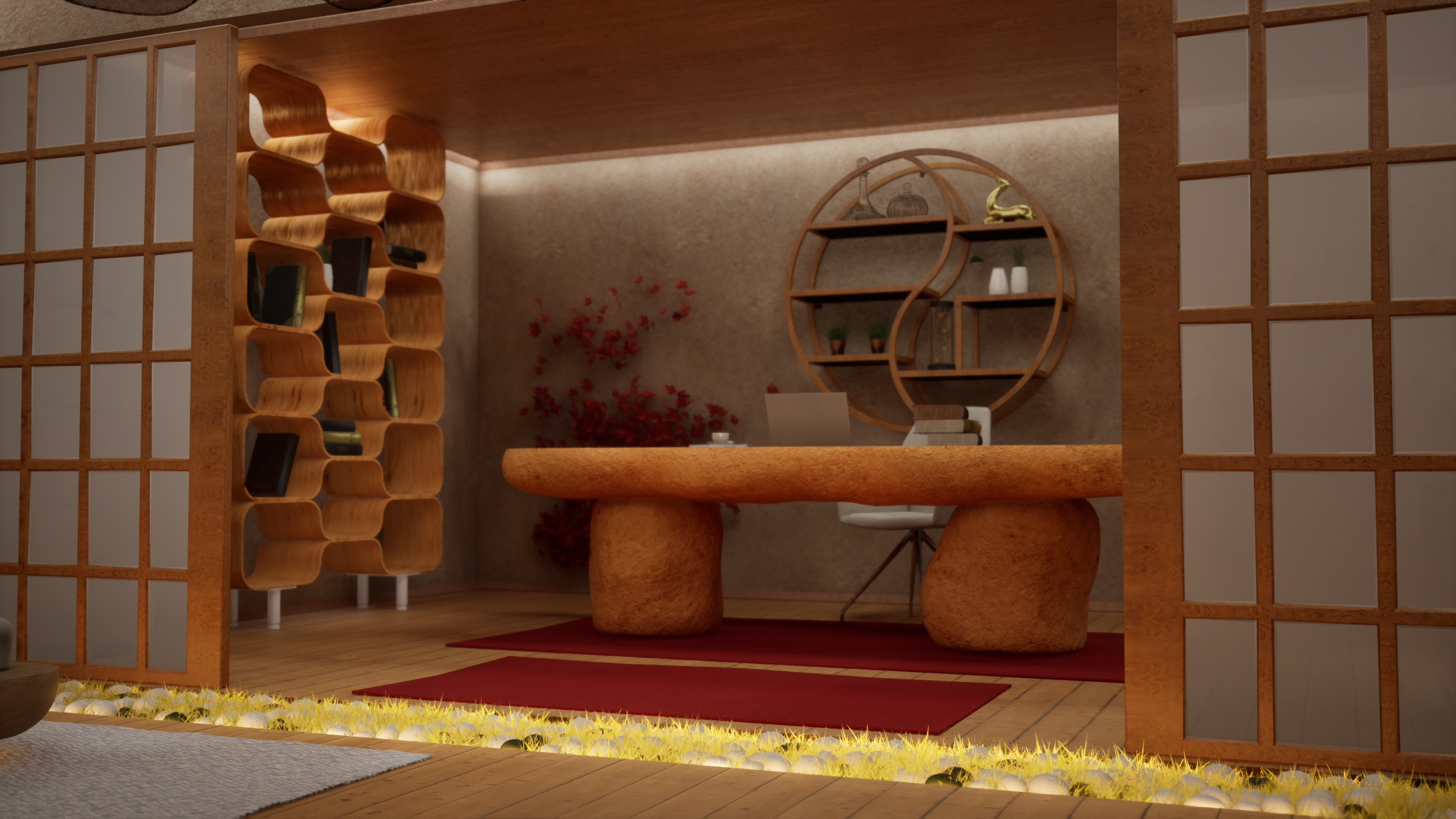Стените от микроцимент и декоративните елементи (тип Ин и Ян) оформят уютно убежище, което стимулира както фокуса, така и релаксацията. Проектът демонстрира иновативен workflow, съчетаващ параметрично моделиране в Rhino 8 & Blender с фотореализма в реално време на Unreal Engine 5.
