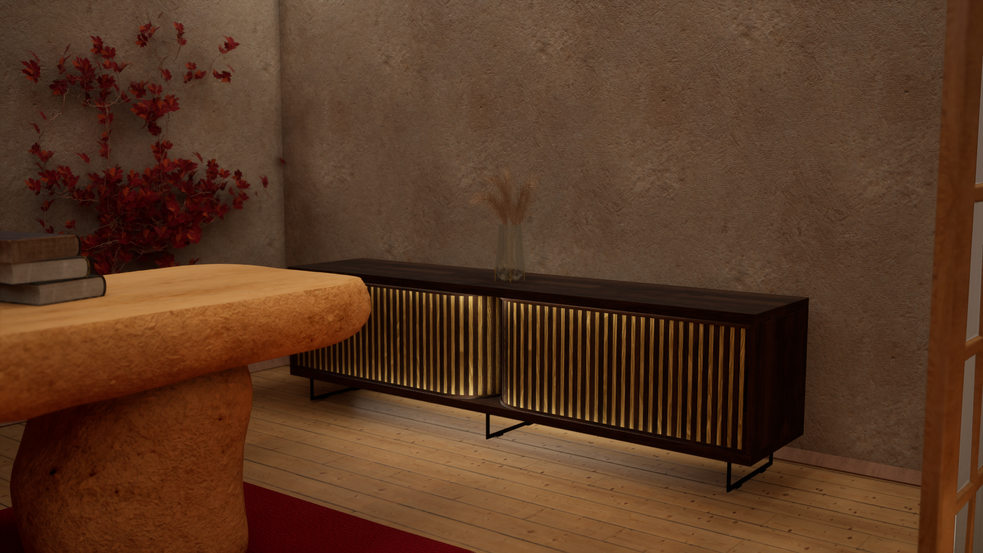 Този проект е визуален отговор на нуждата от баланс в дигиталната ера. Концепцията представя хибридно работно пространство, вдъхновено от философията на Wabi-Sabi и Boho естетиката. Органичните, флуидни форми на мебелите и топлината на масивното дърво контрастират с технологиите, създавайки усещане за „заземяване“ и спокойствие.