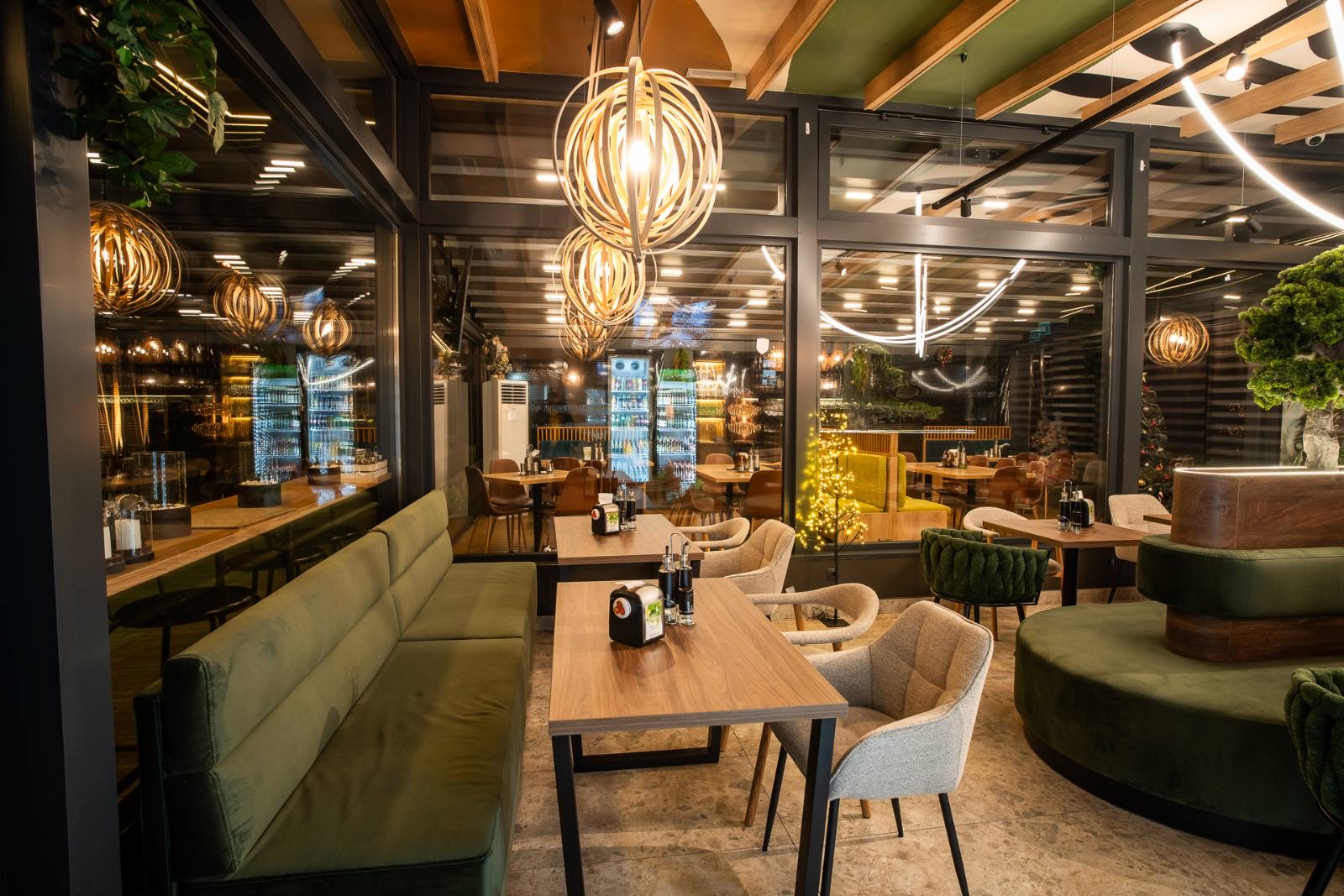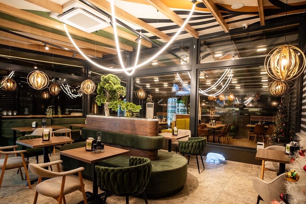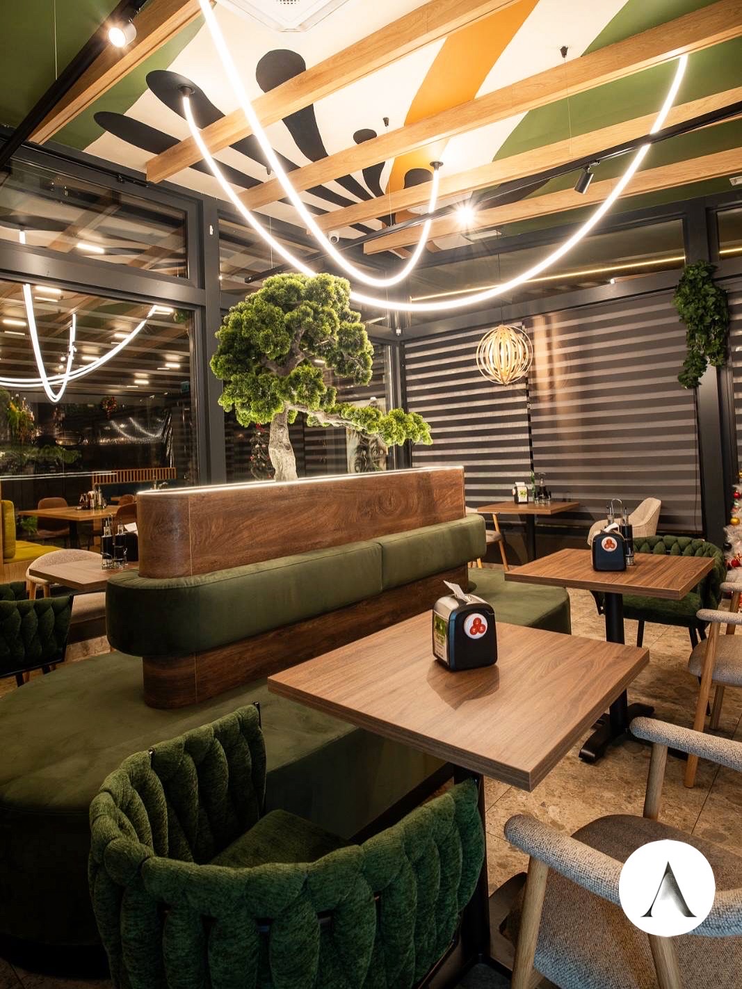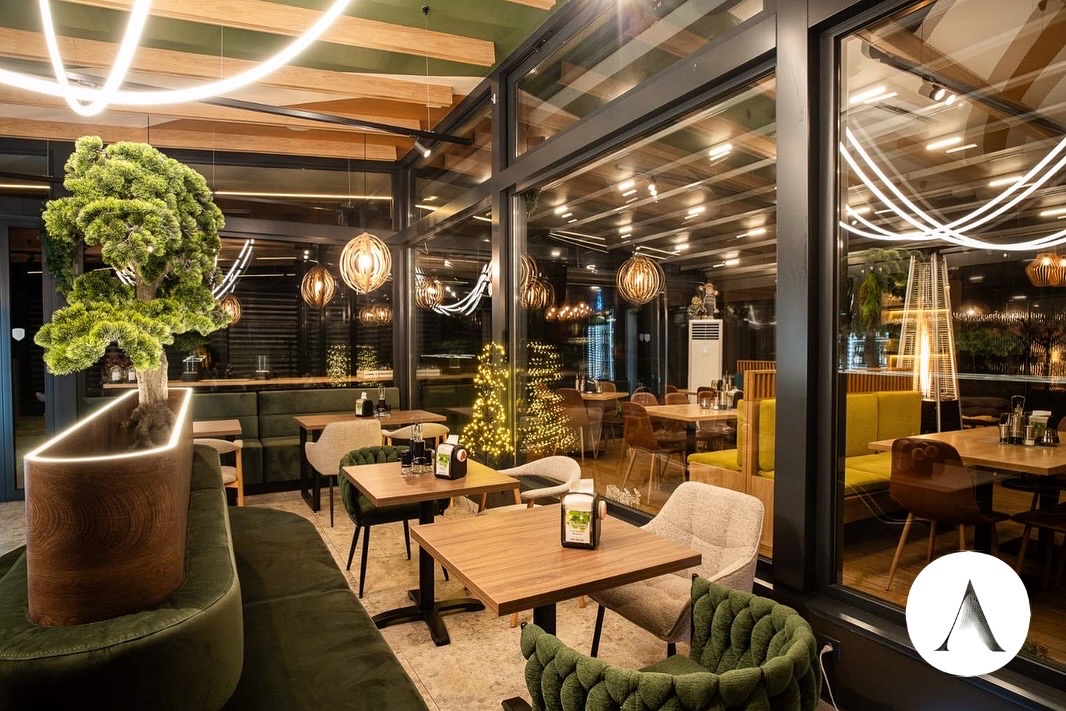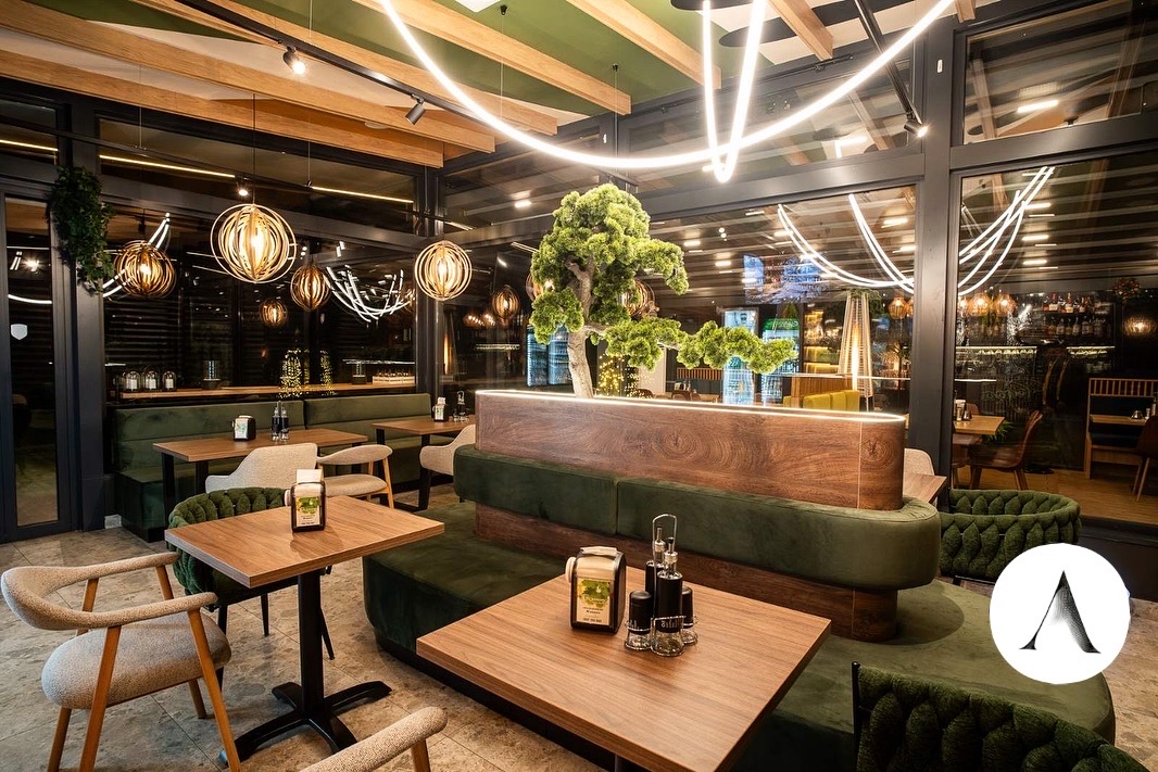 Интериорният проект разказва тиха, хармонична история, в която природата и модерният дизайн съществуват в пълен синхрон. Пространството е изградено около жив зелен акцент – стилизирано дърво, което сякаш пуска корени в сърцето на интериора и се превръща в негова душа. Около него меките линии на тапицираната пейка приканват към спокойствие, разговор и споделени моменти.