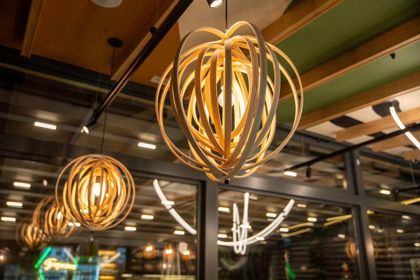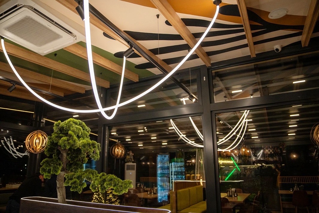 Цветовата палитра черпи вдъхновение от земята – дълбоки зелени нюанси, топли дървесни текстури и нежни неутрални тонове, които създават усещане за уют и естествен баланс. Светлината се разлива меко от скулптурните LED линии, които рисуват движения по тавана и придават на пространството ритъм и лекота. Органичните форми на осветителните тела допълват атмосферата с топлина и финес.