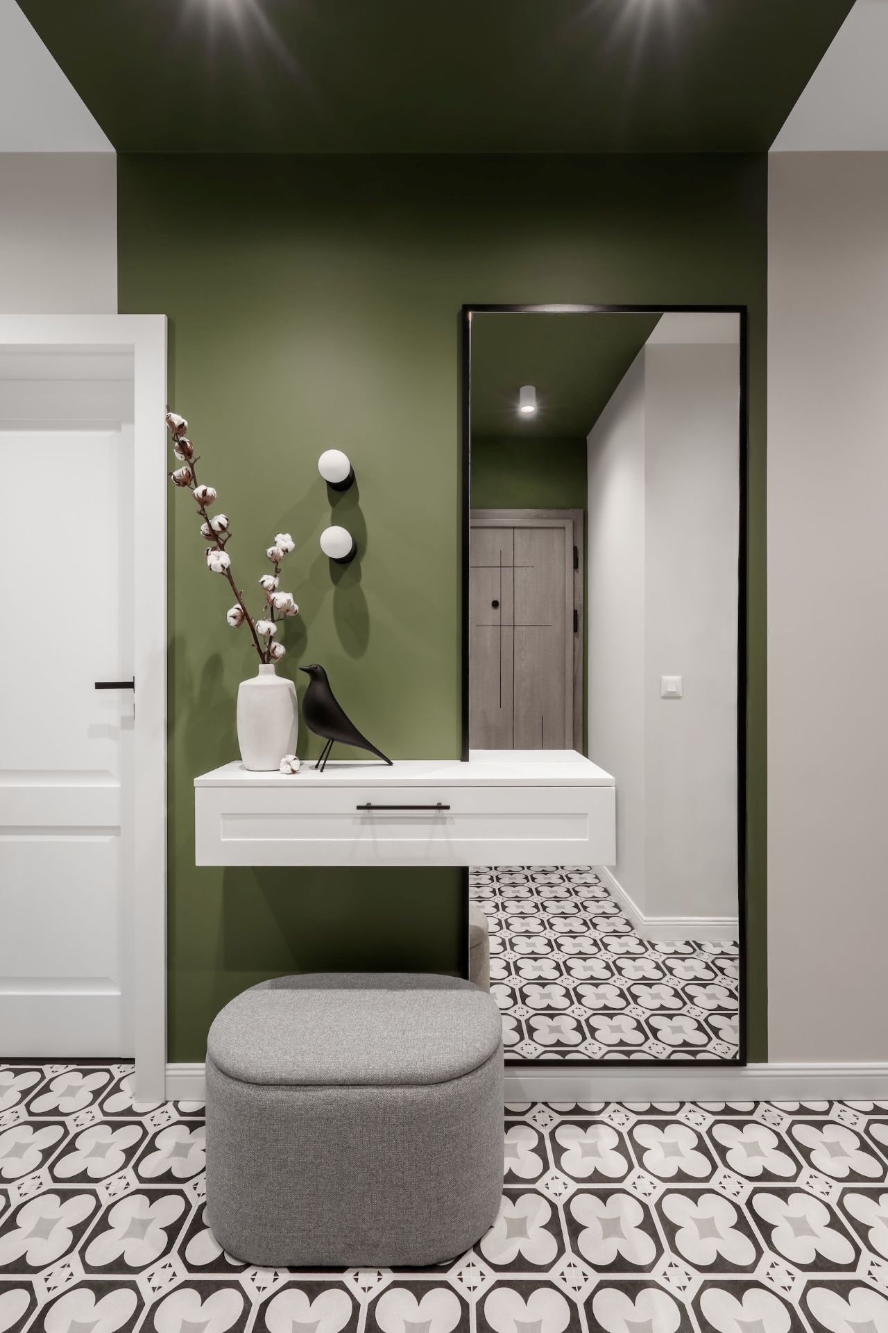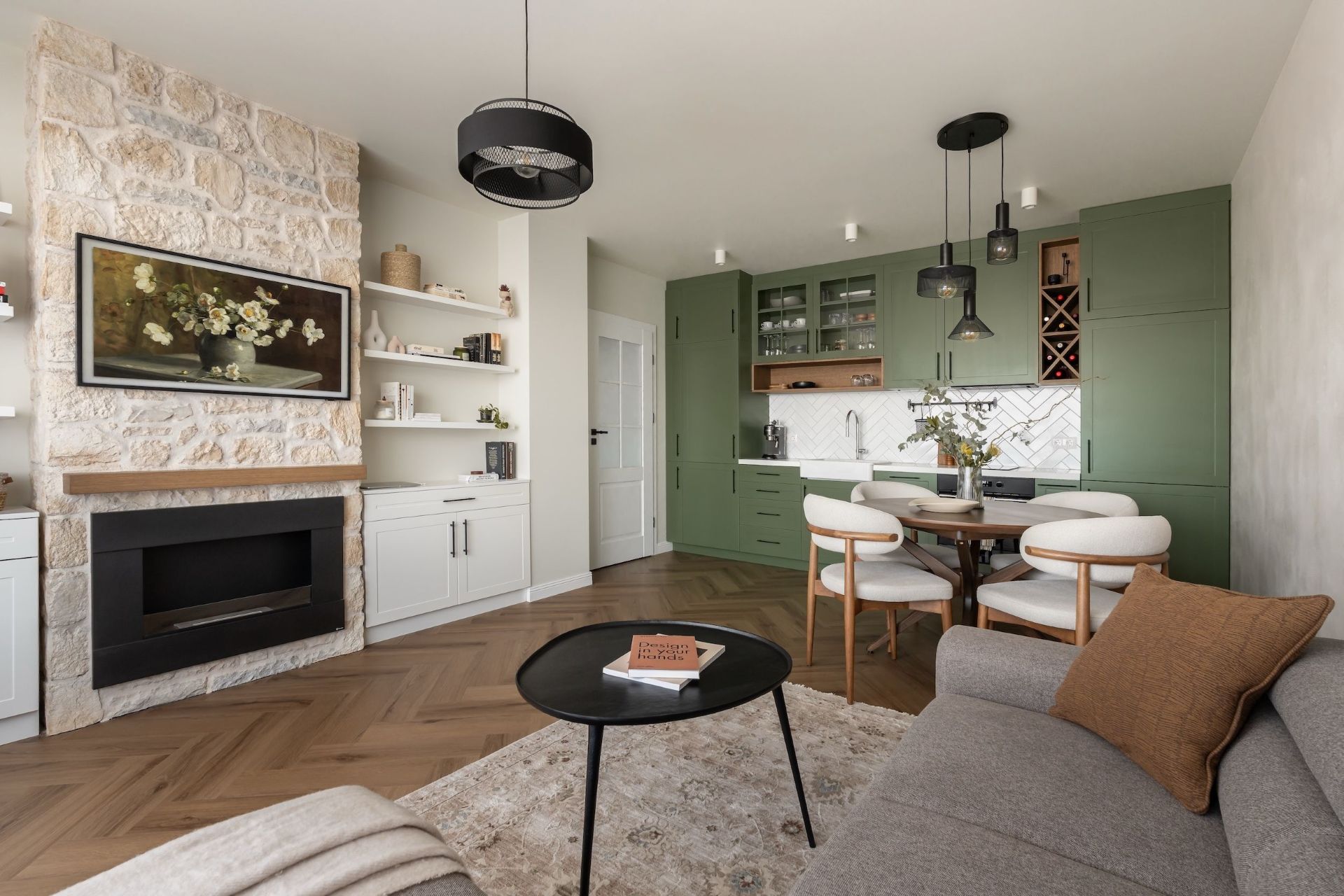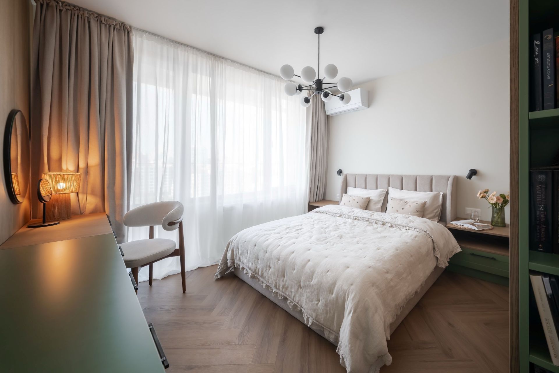 Апартамент Vert разглежда жилището като последователна среда, в която цветът, материалът и светлината работят в една обща логика. Маслиненото зелено се появява като повтарящ се елемент в различни мащаби и функции, свързвайки отделните пространства и придавайки ясно разпознаваема идентичност на интериора. То е балансирано от светли неутрални повърхности и топли дървесни тонове, които създават спокойна и добре подредена визуална структура.