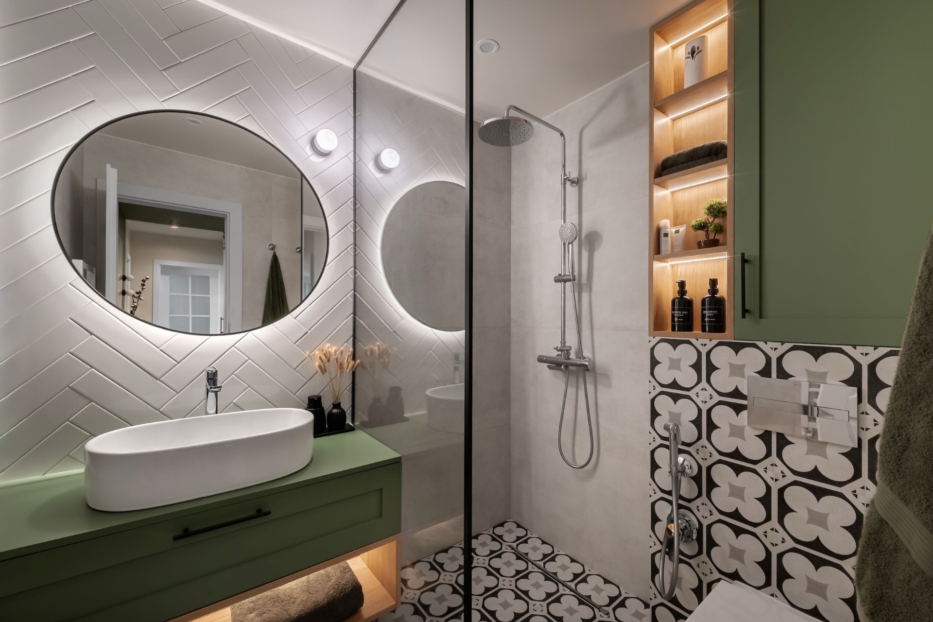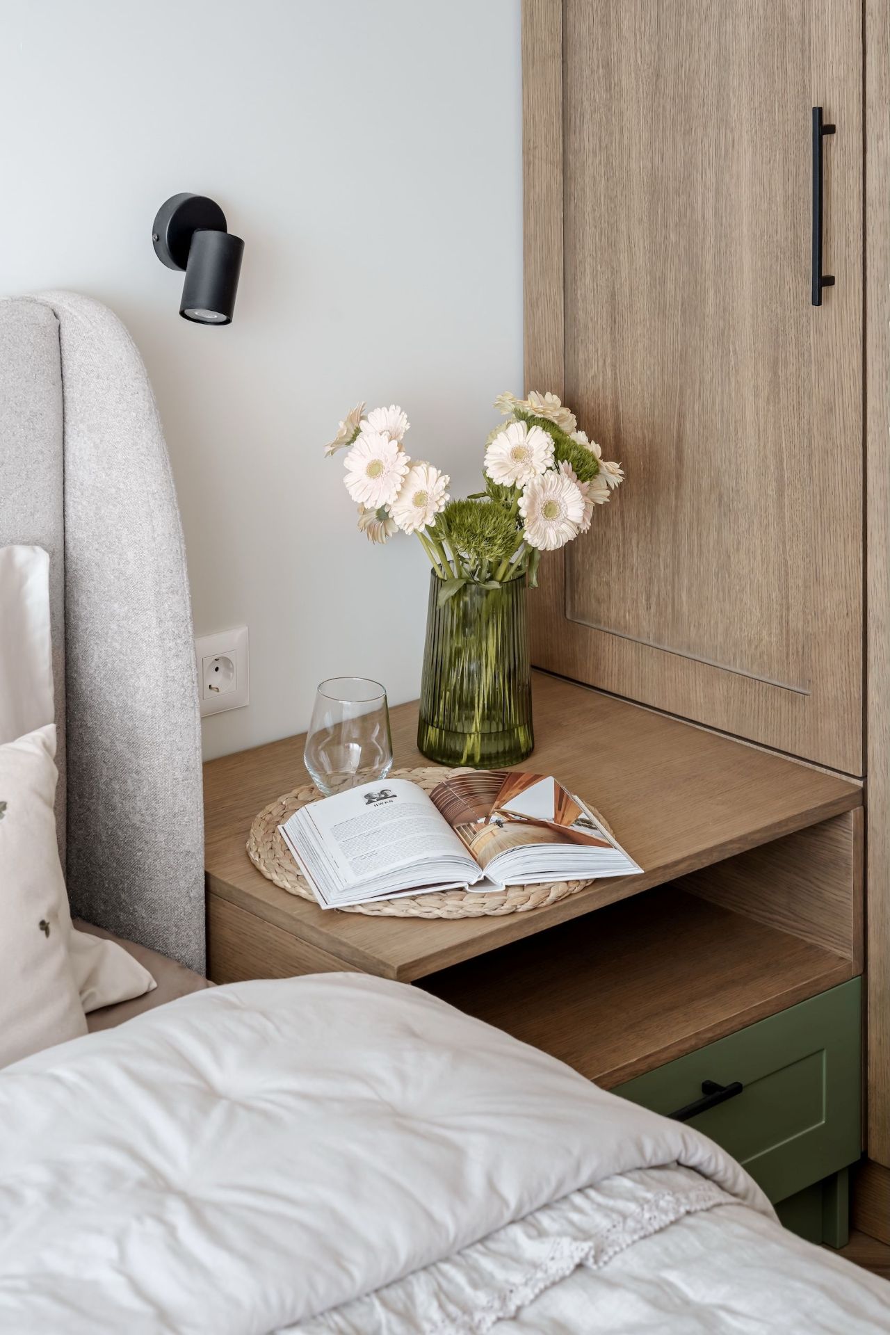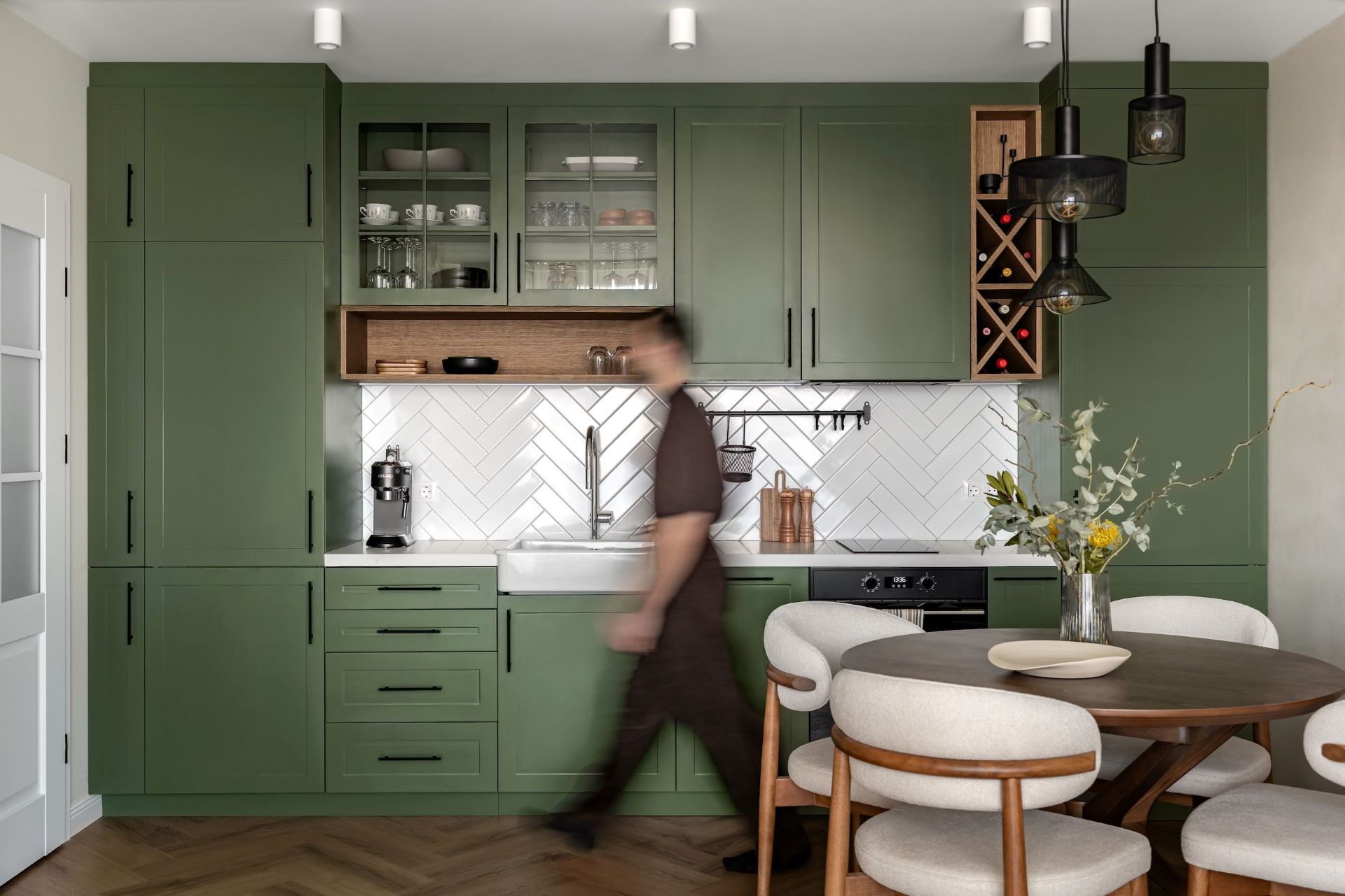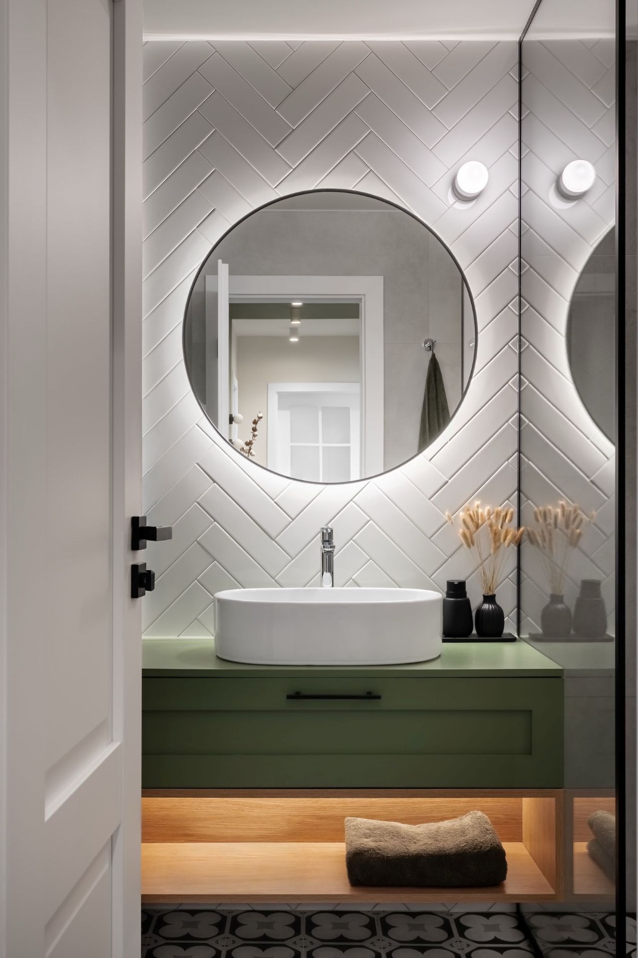 Апартамент Vert разглежда жилището като последователна среда, в която цветът, материалът и светлината работят в една обща логика. Маслиненото зелено се появява като повтарящ се елемент в различни мащаби и функции, свързвайки отделните пространства и придавайки ясно разпознаваема идентичност на интериора. То е балансирано от светли неутрални повърхности и топли дървесни тонове, които създават спокойна и добре подредена визуална структура.